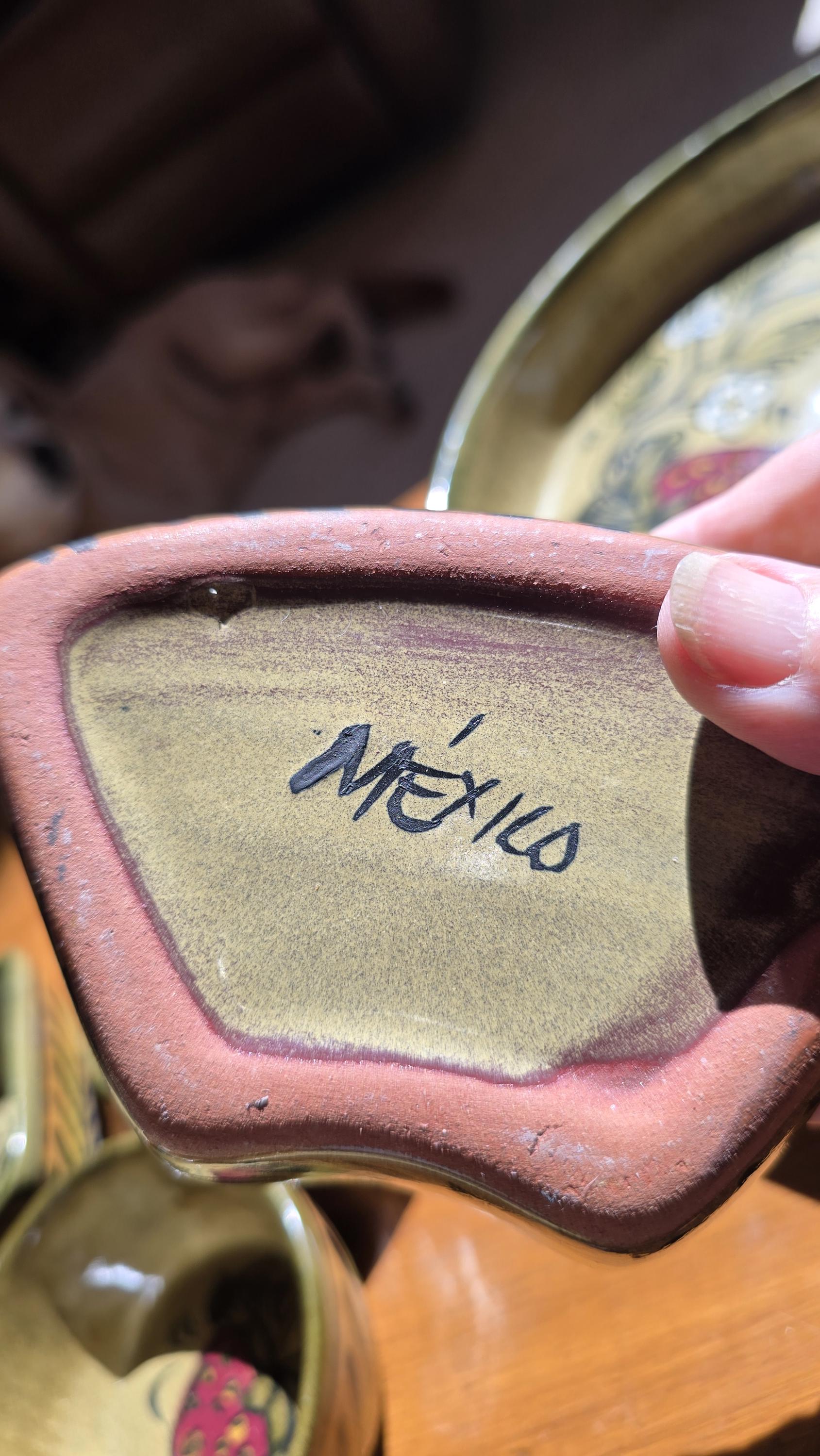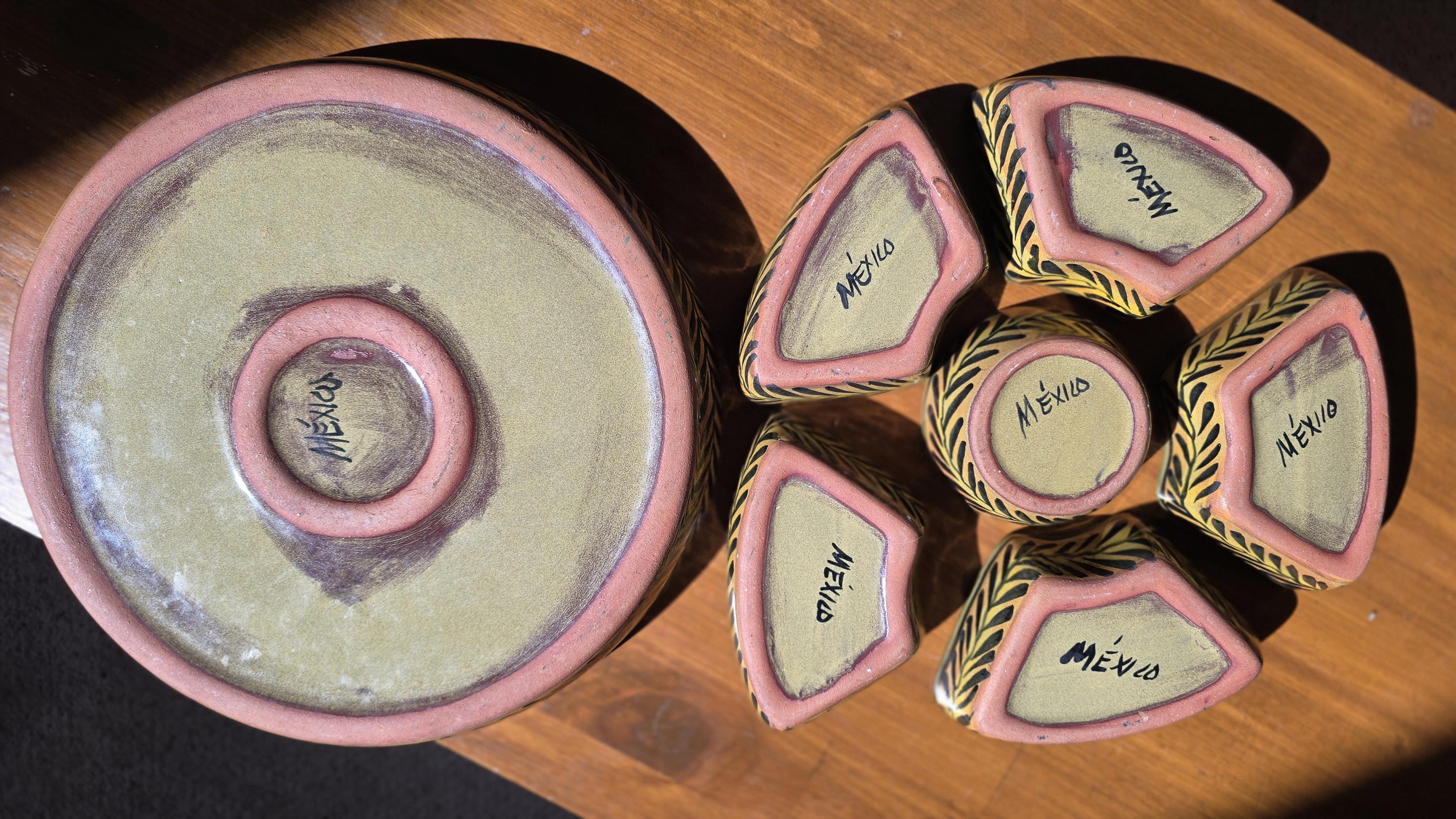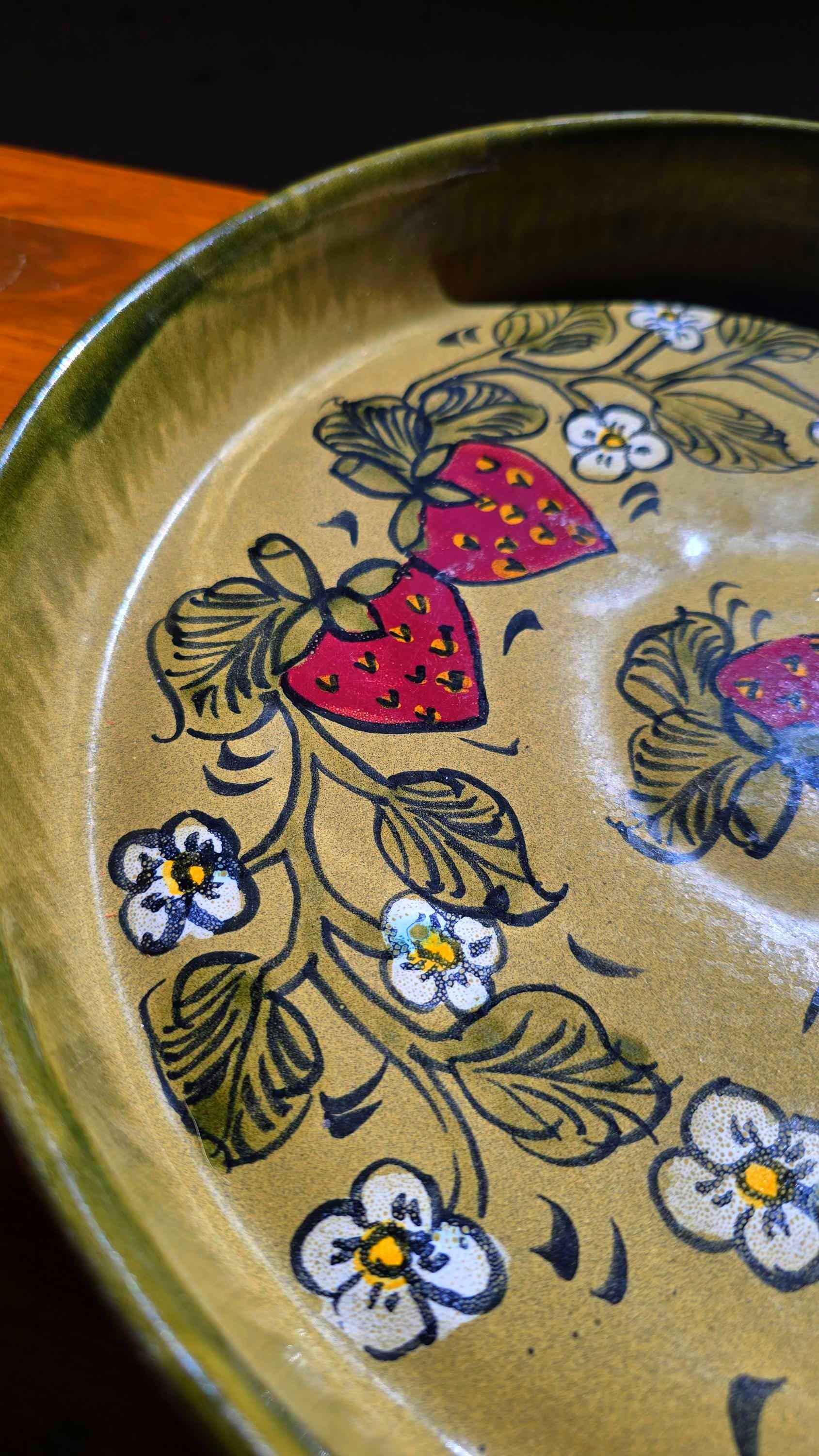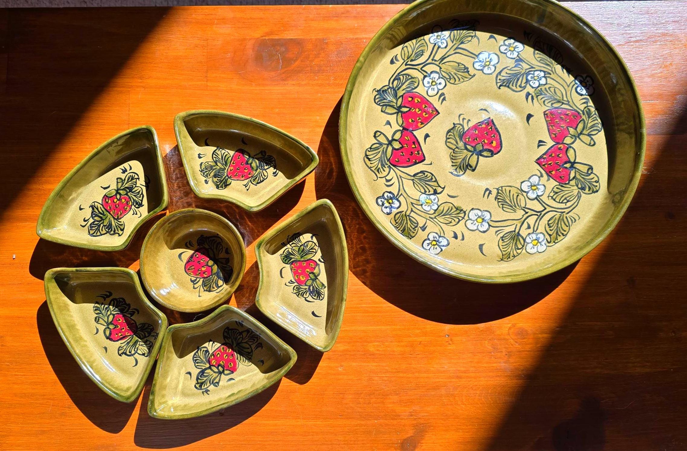 This 7-piece Talavera chip-n-dip set is flawless! No chips (until you add the tortillas!). No crazing or cracks. The design features big, red strawberries on each piece, plus white strawberry blossoms on the large under-plate. Every piece is marked "Mexico." Please see the photos and feel free to message with any questions you may have. Thank you for visiting Redux Vintage Boutique.
