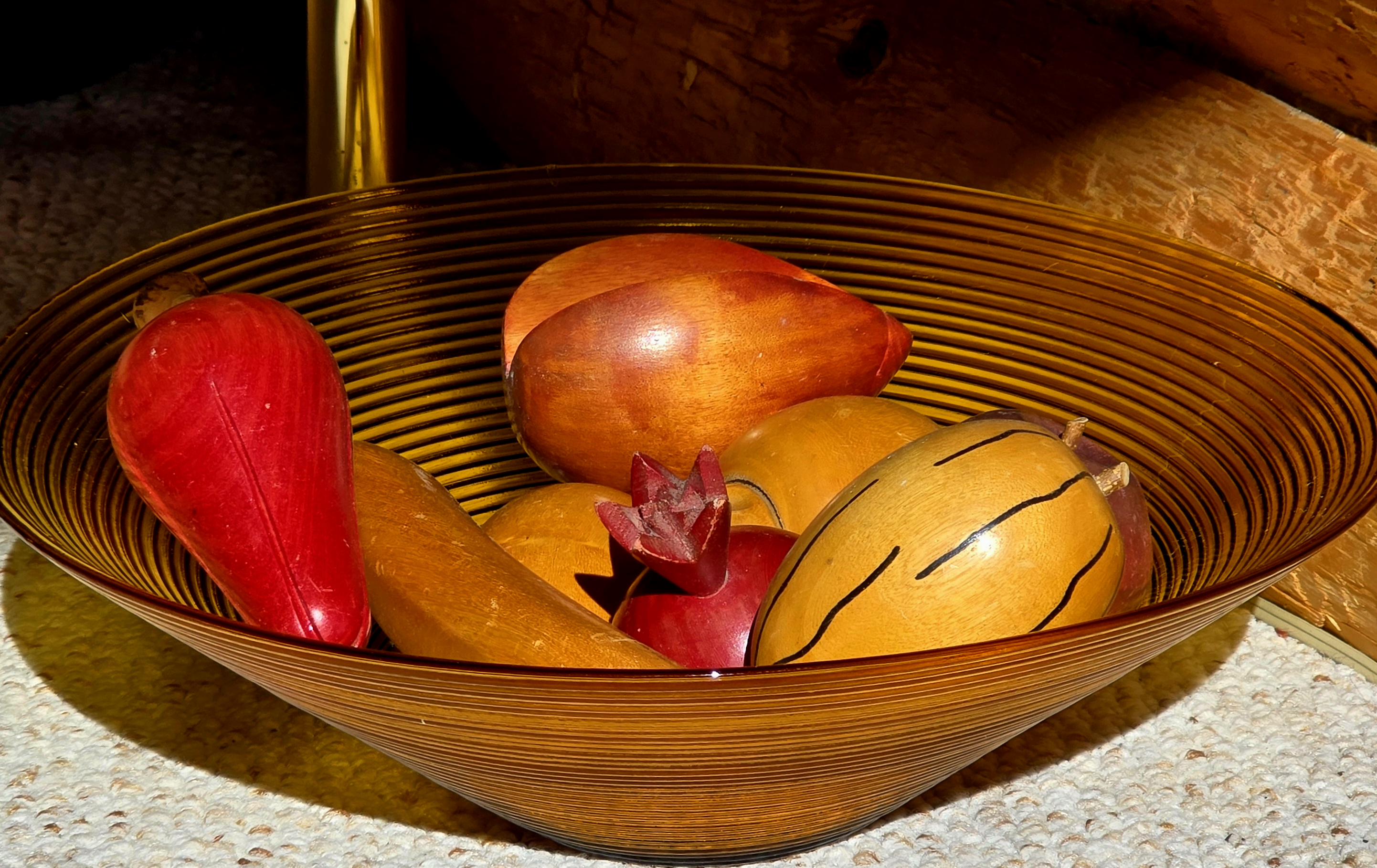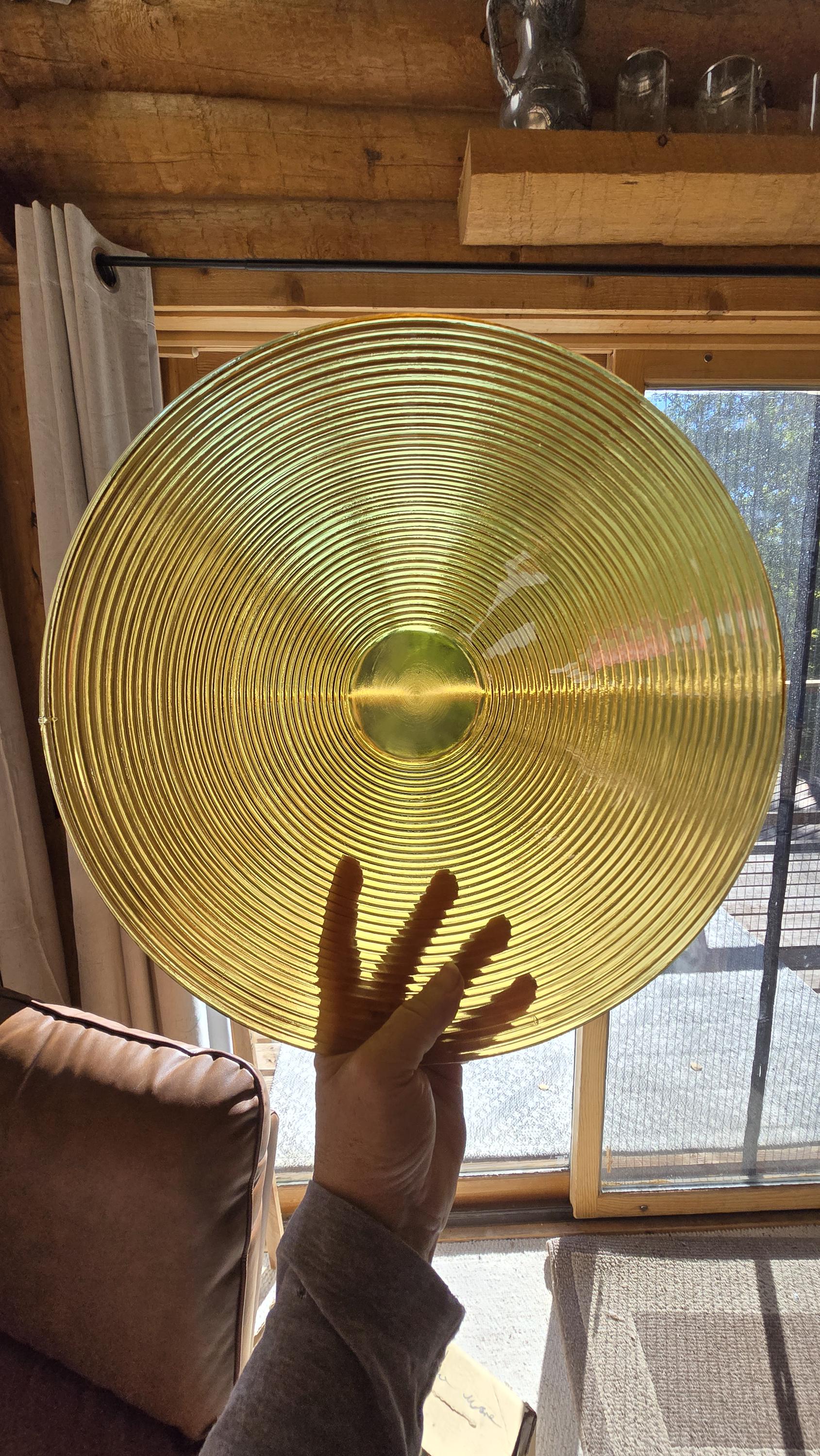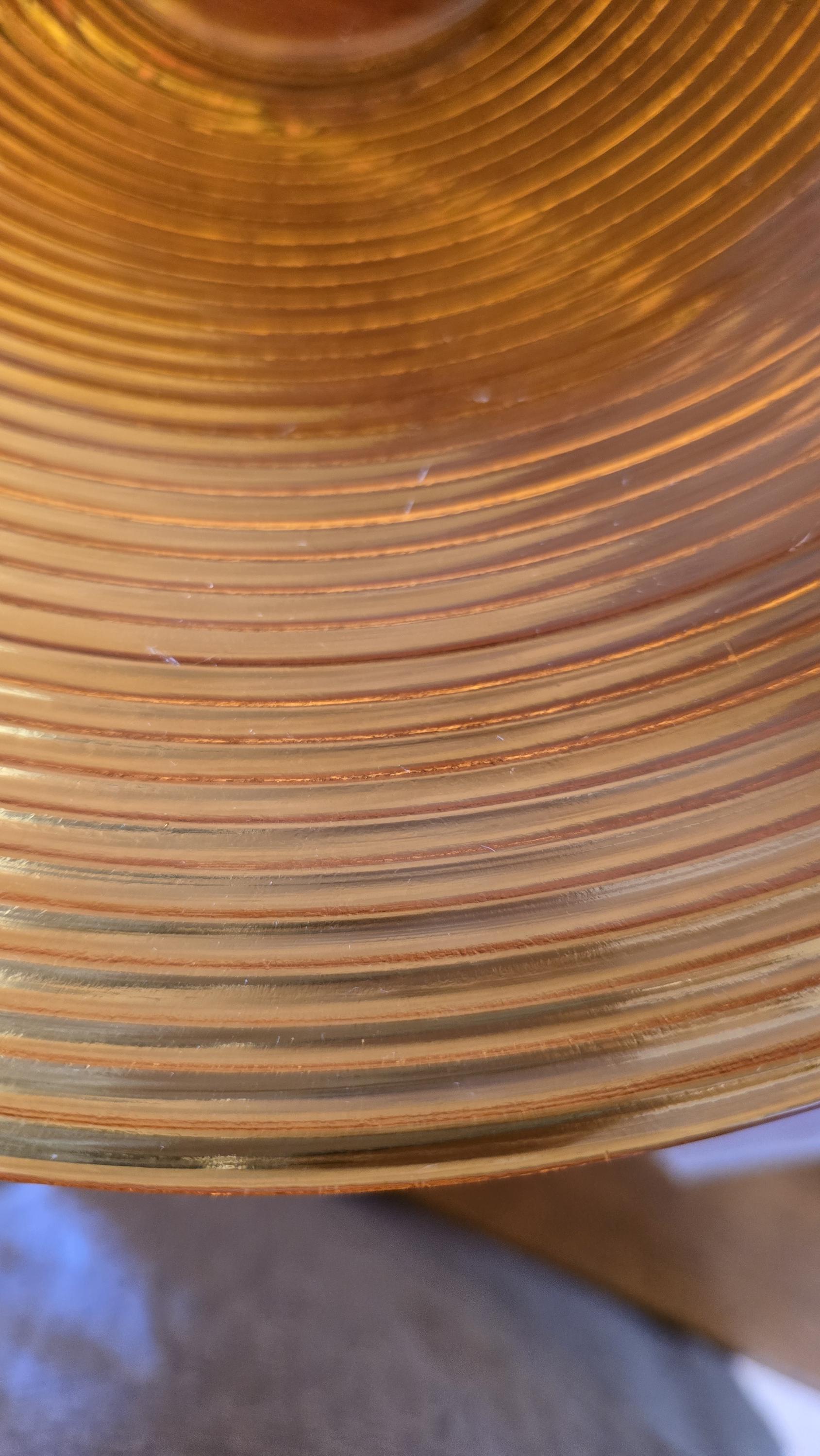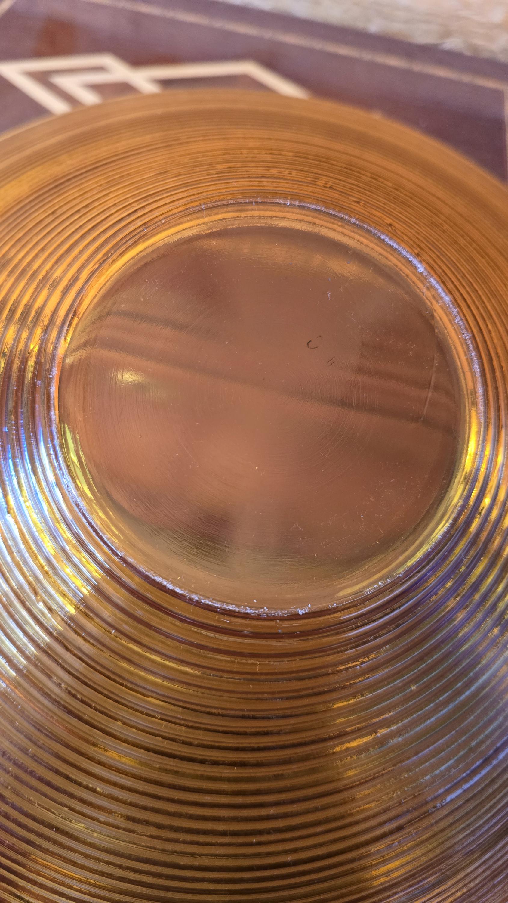 This is a really big, golden amber glass bowl by Imperial Glass. The modern design is called "Spun Amber" and will easily blend with your Mod or Eclectic decor. This piece is in perfect condition, without nicks, cracks or haze. It is perfect for popcorn or a big salad for your buffet. It is impressive enough to keep on display all the time!