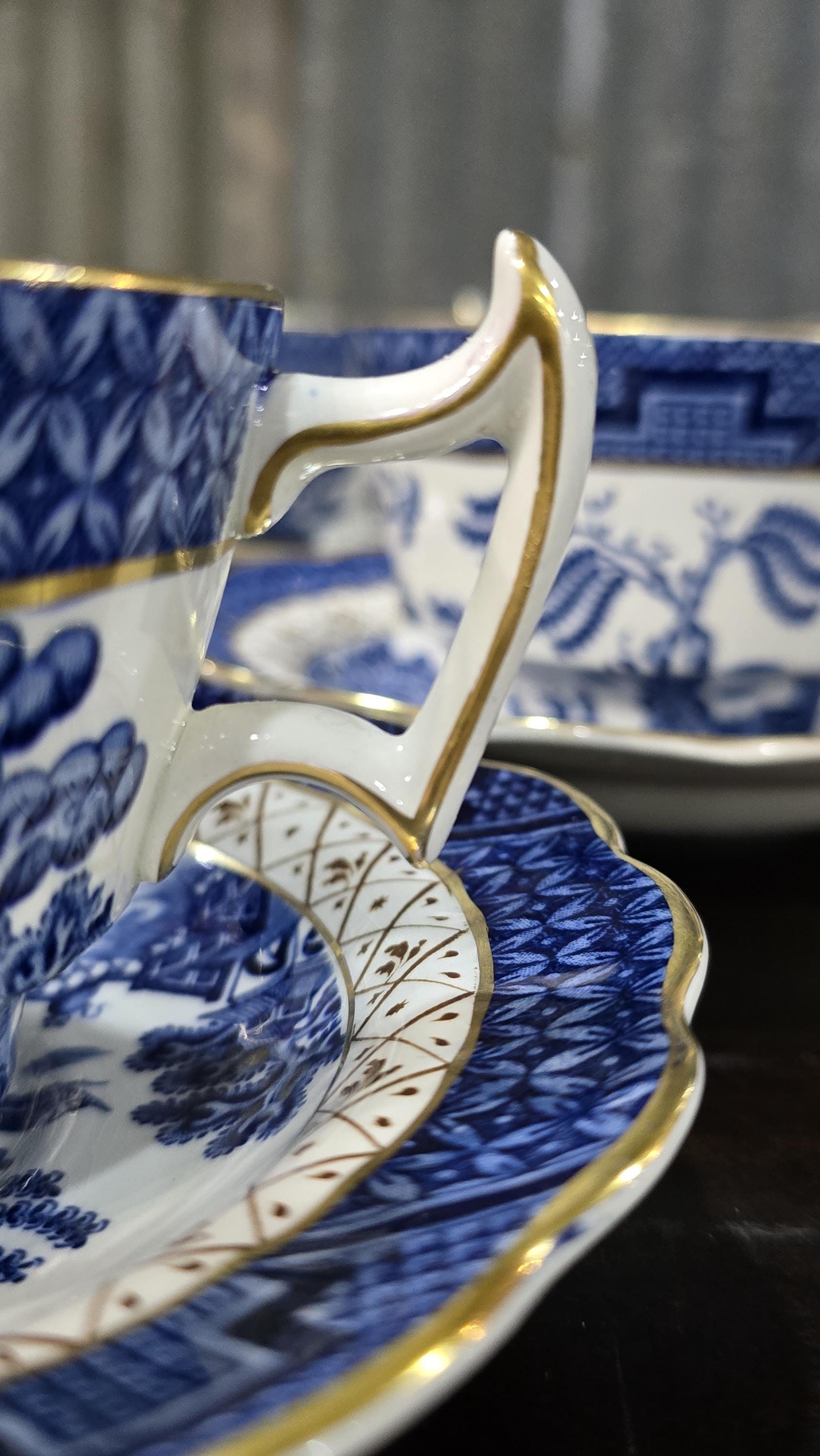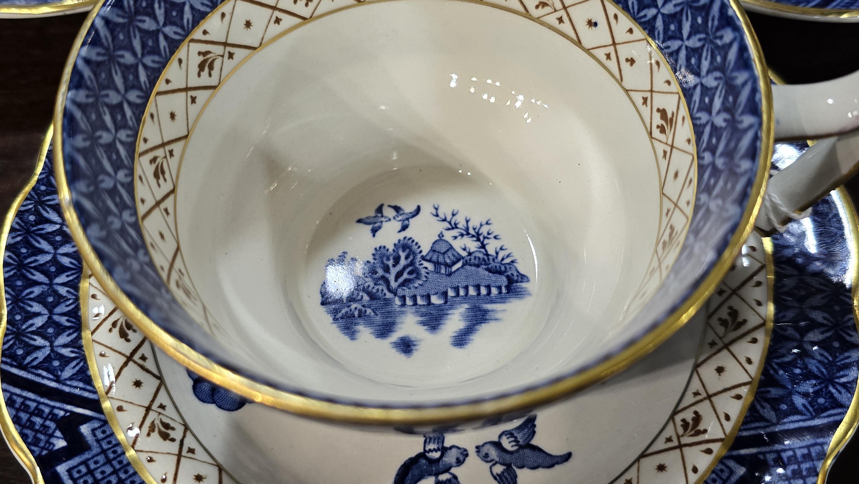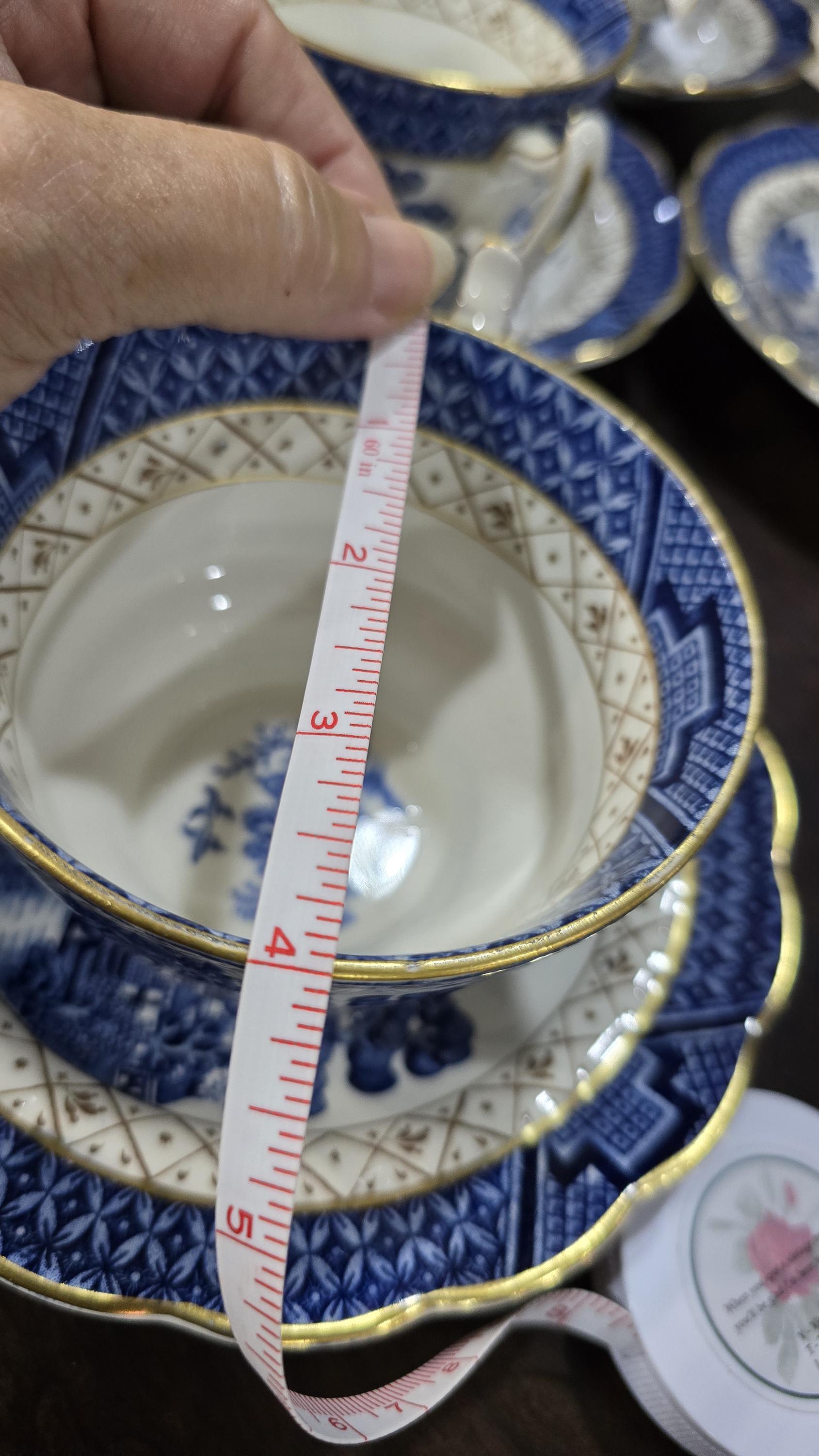 This collection of English cups and saucers is a fortunate find! The cups are oversized - a full four inches across. They and the saucers are in near mint condition. The beautiful and classic blue-and-white decorations are bright, as are the gilt edges. Ready for the holidays.