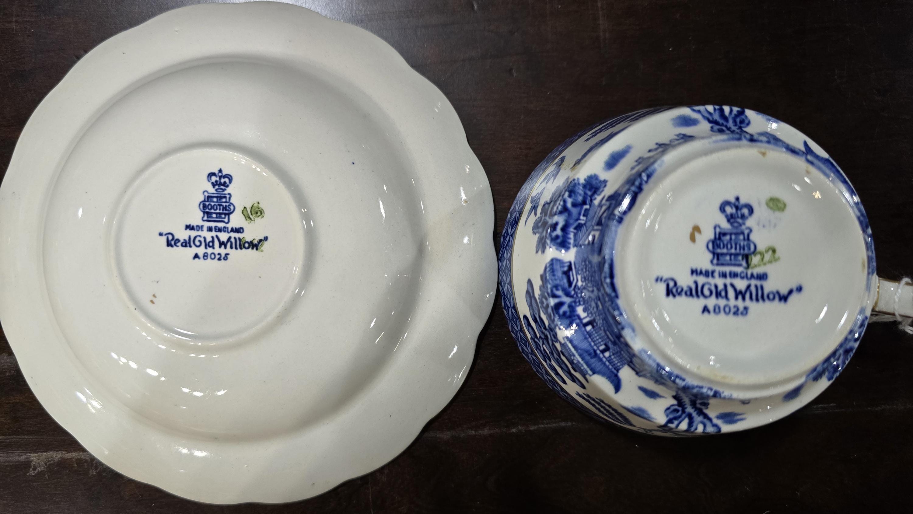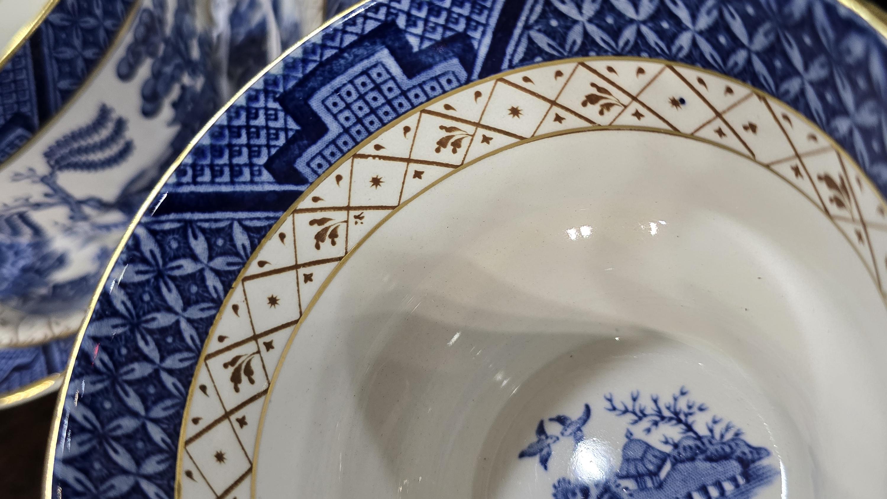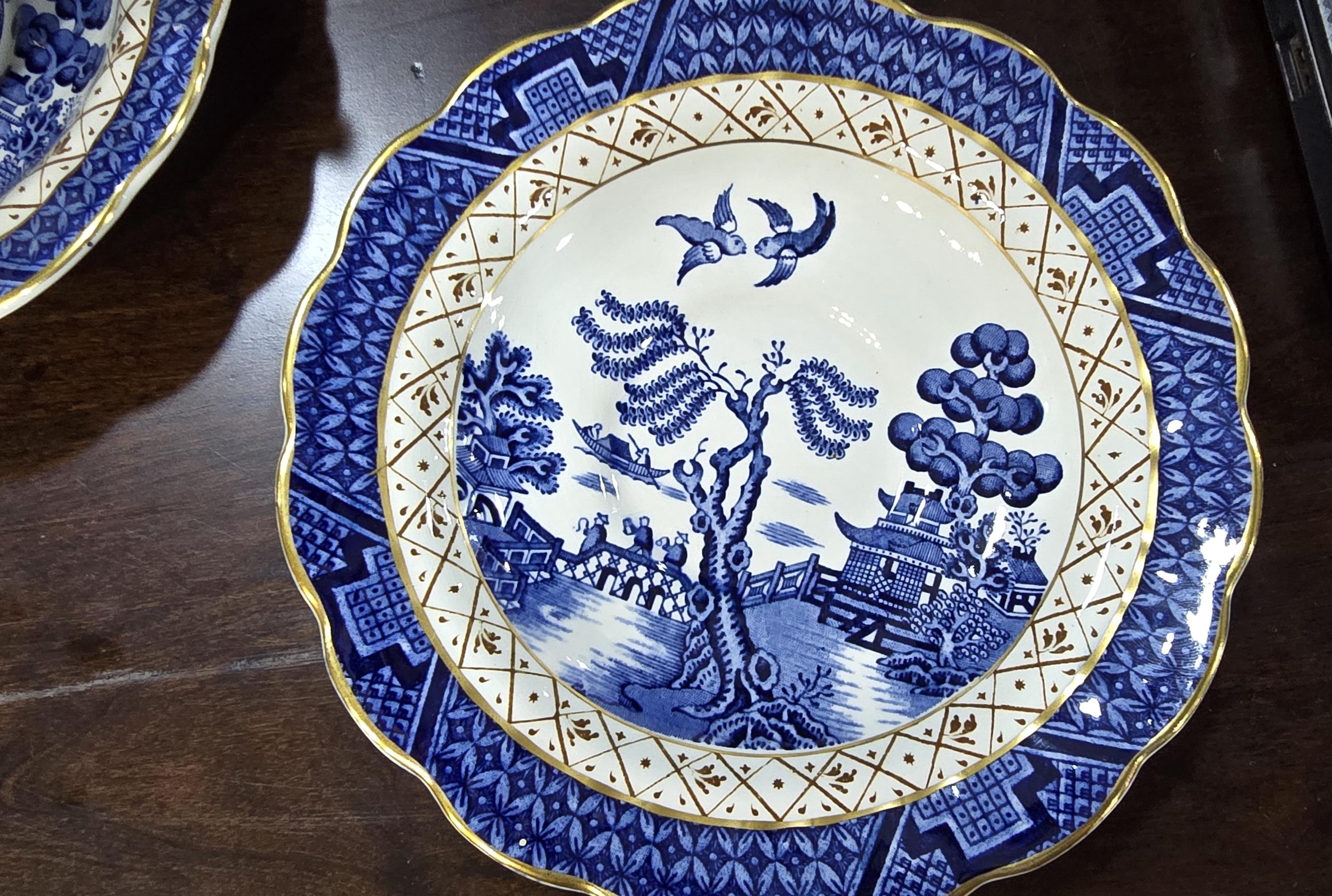 This collection of English cups and saucers is a fortunate find! The cups are oversized - a full four inches across. They and the saucers are in near mint condition. The beautiful and classic blue-and-white decorations are bright, as are the gilt edges. Ready for the holidays.