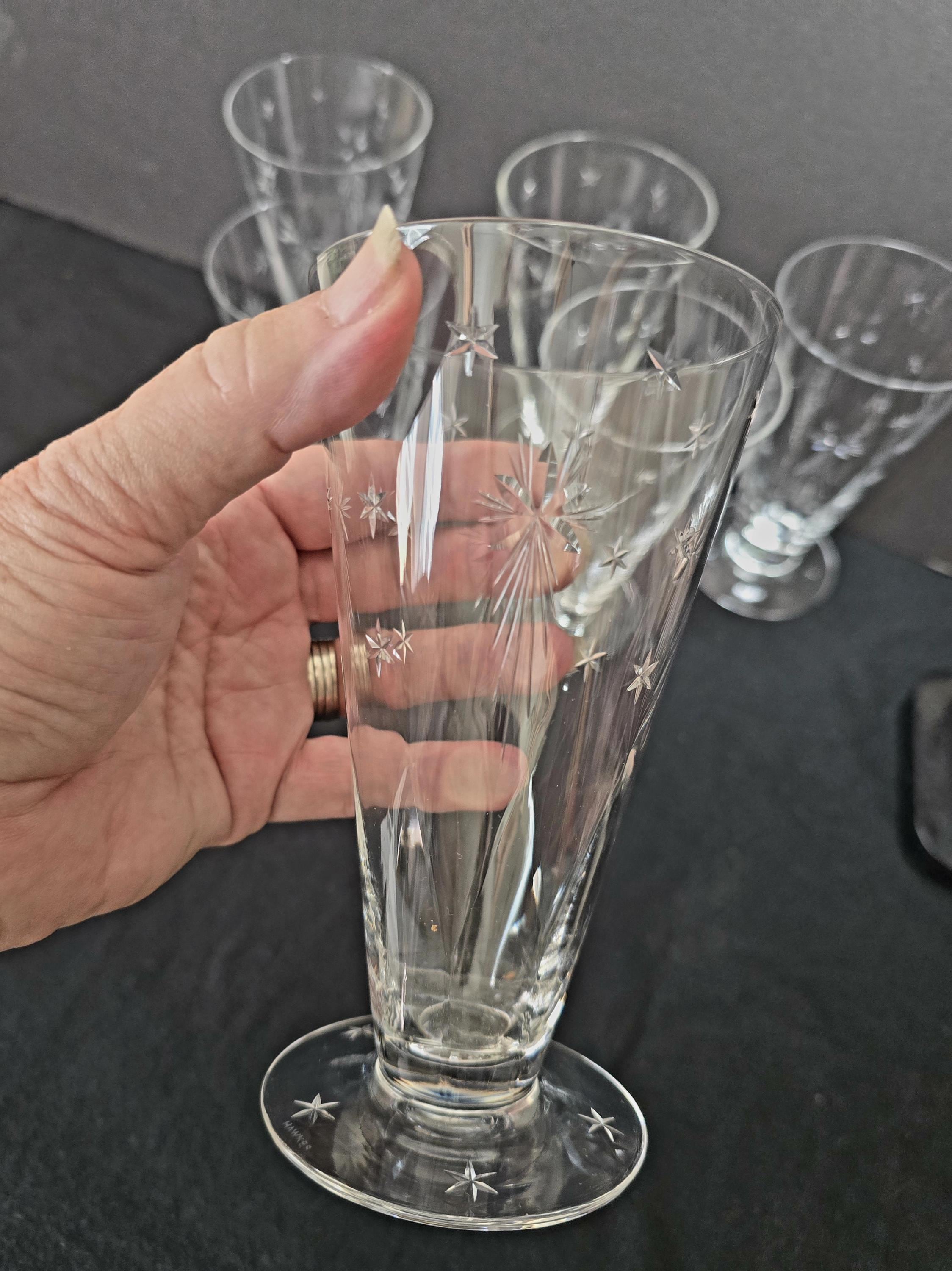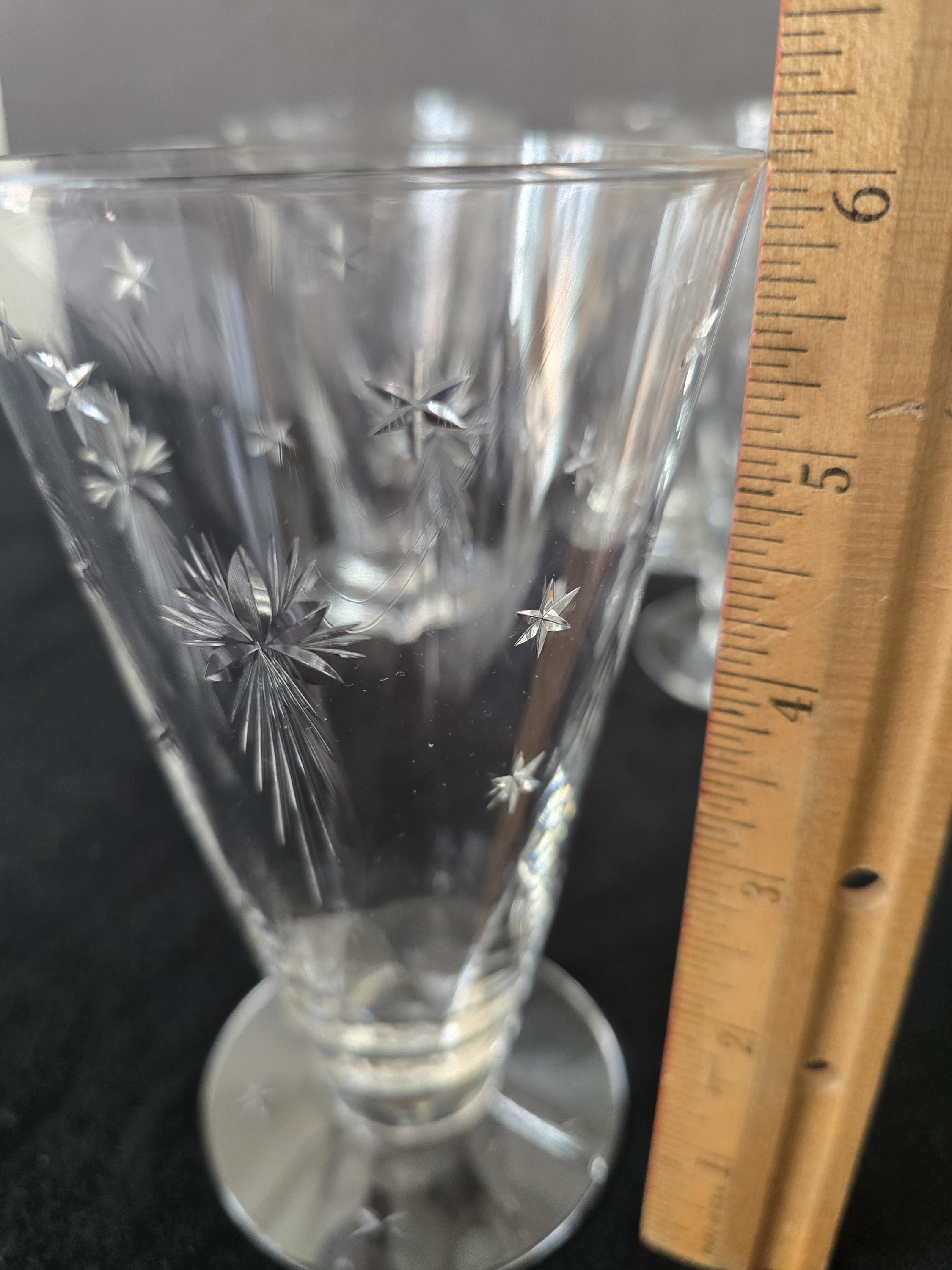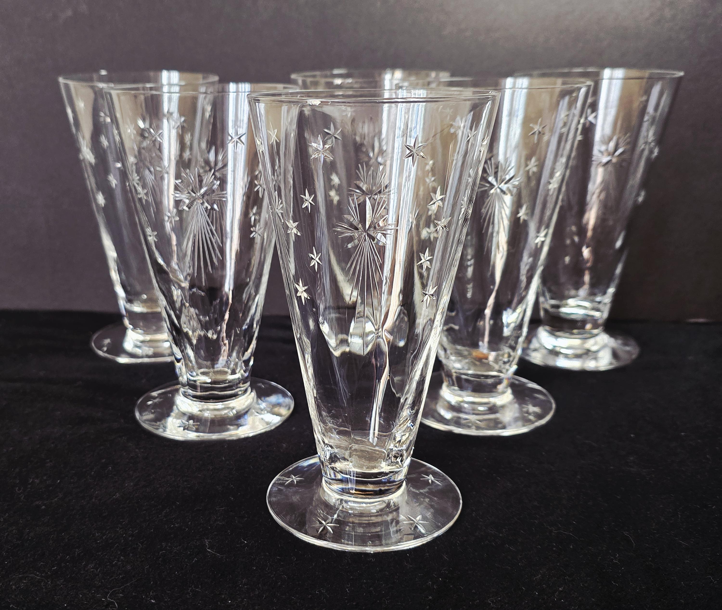 Enchanting clear cut crystal footed tumblers for iced beverages. "Aquila" was cut by the Hawkes only in 1944, making items in this pattern very rare, indeed.