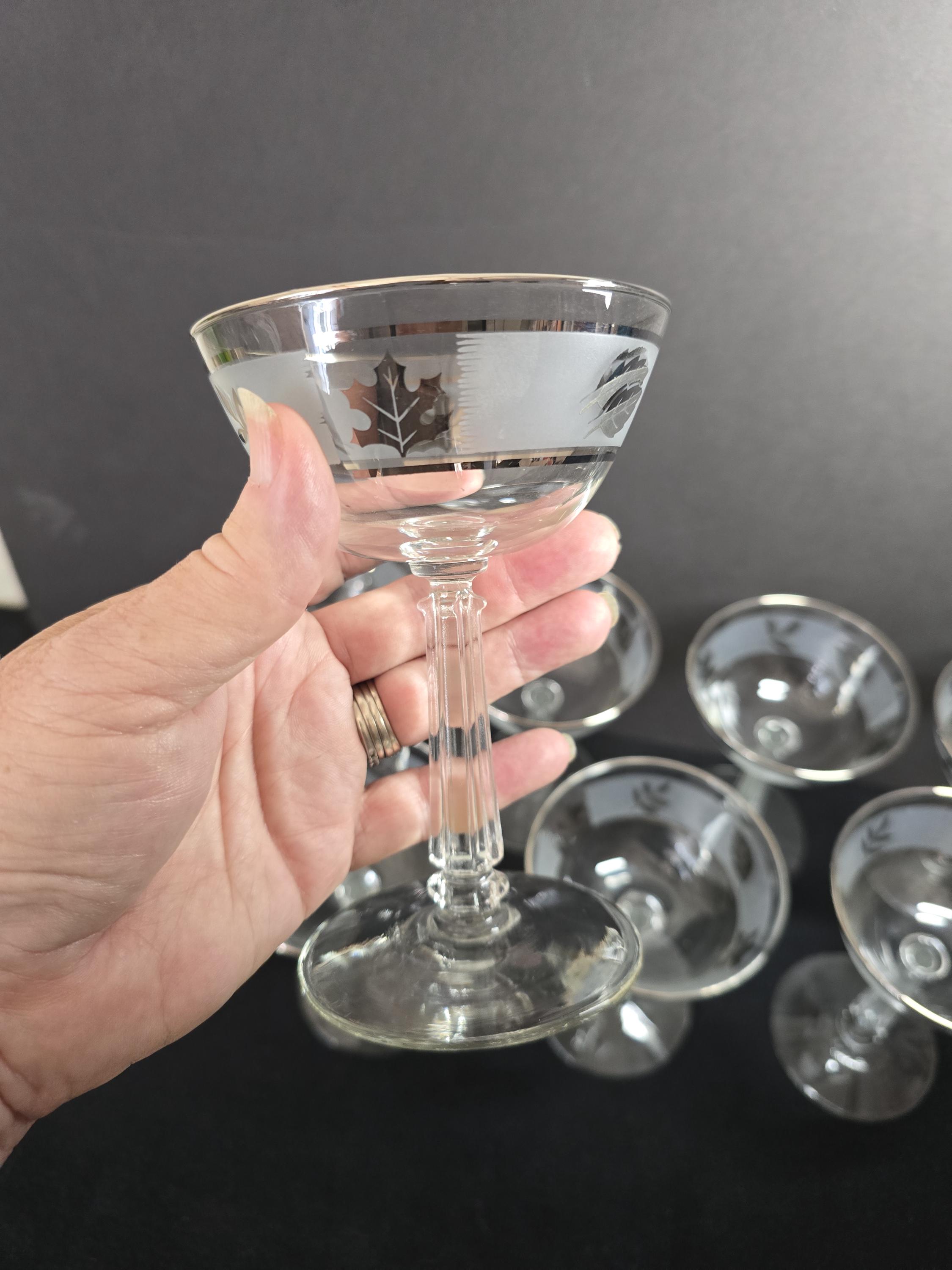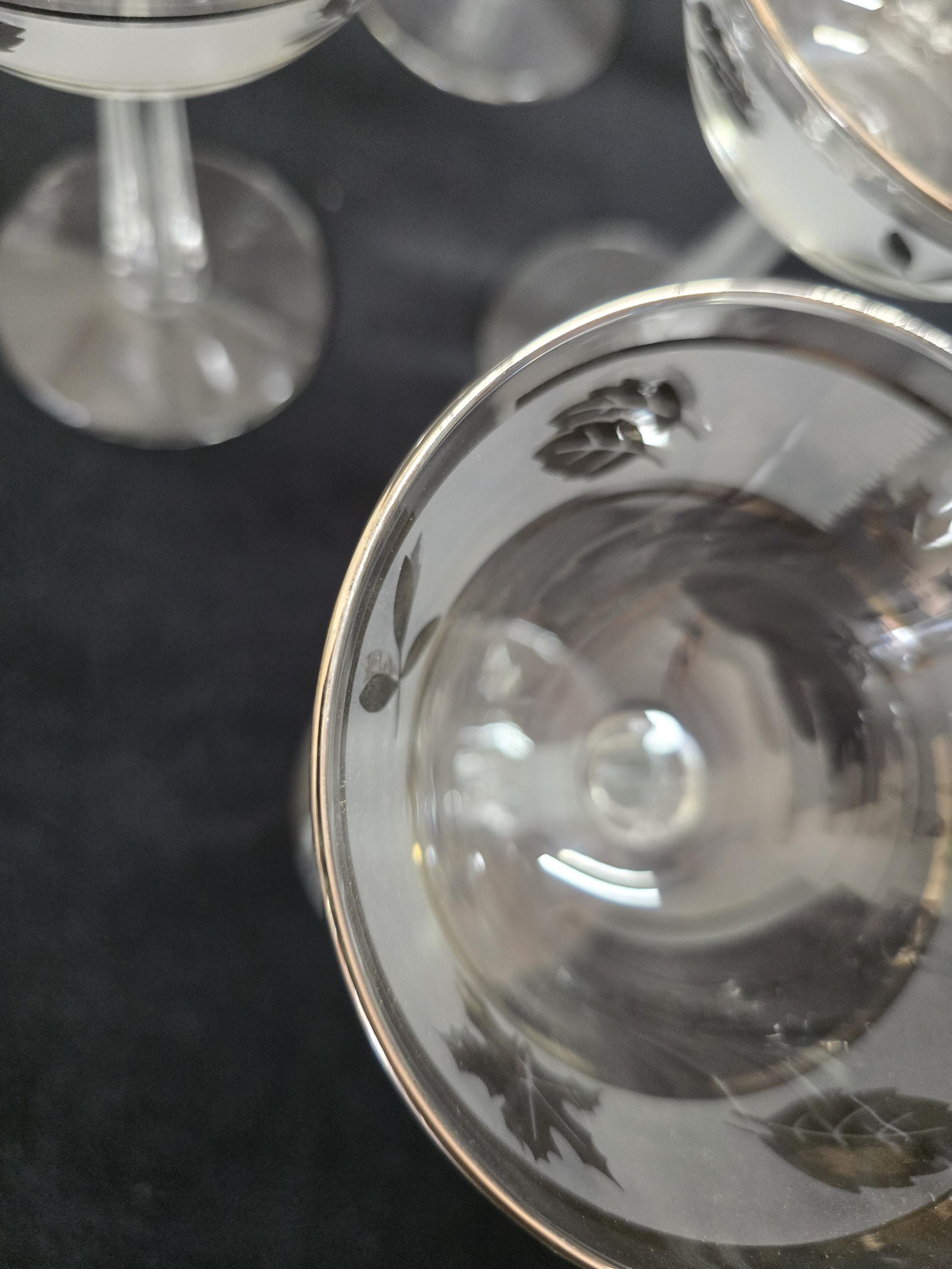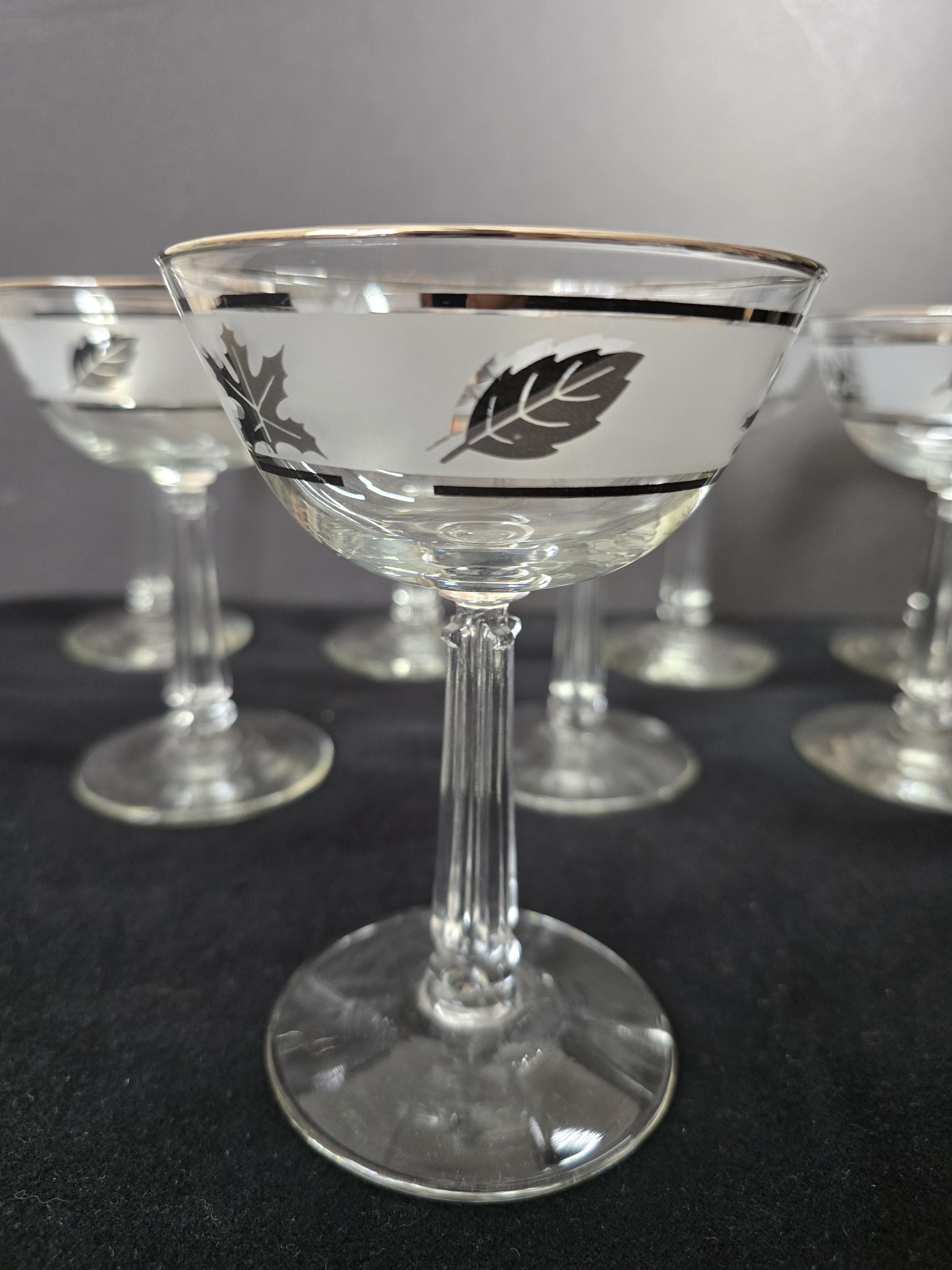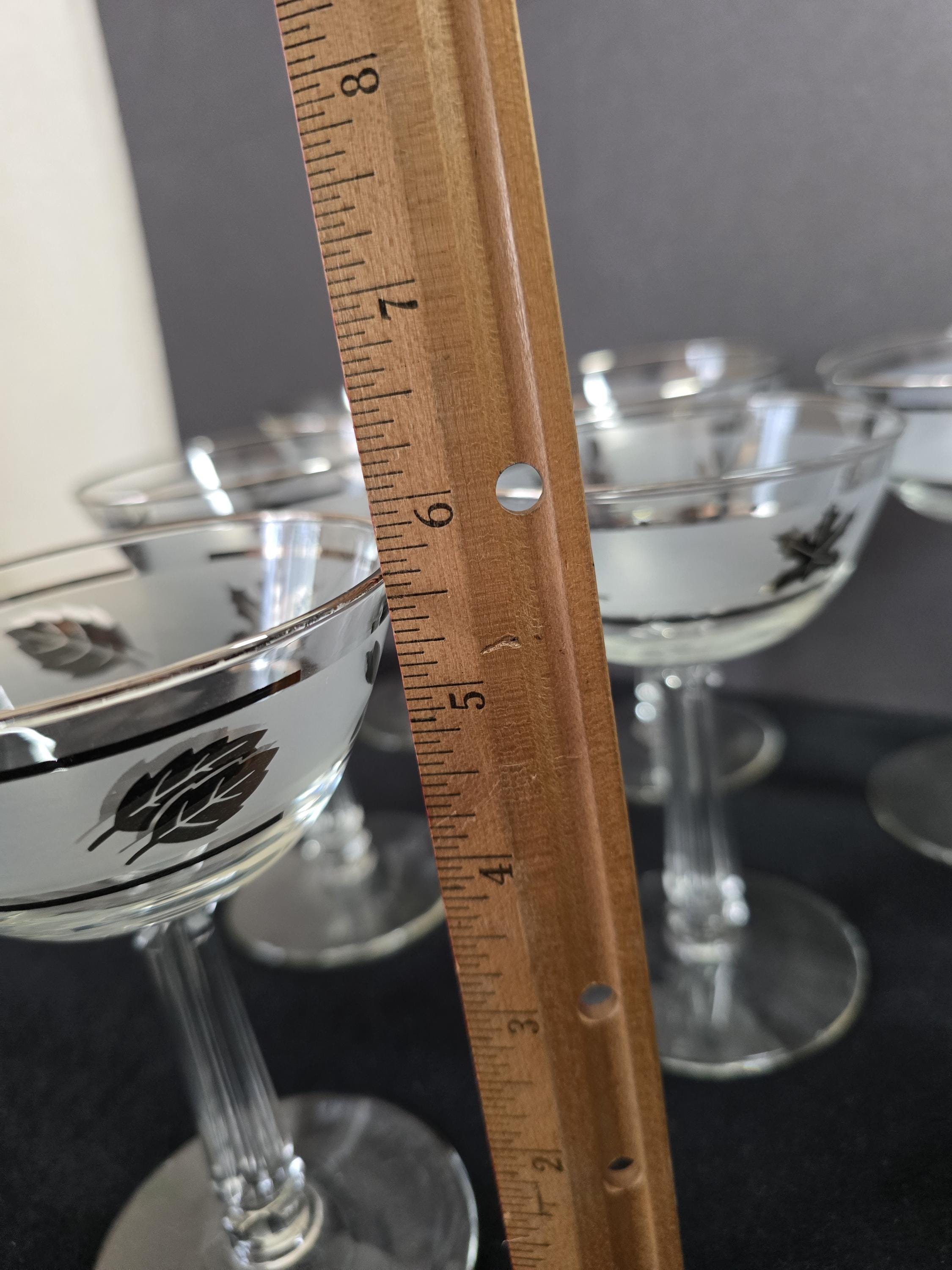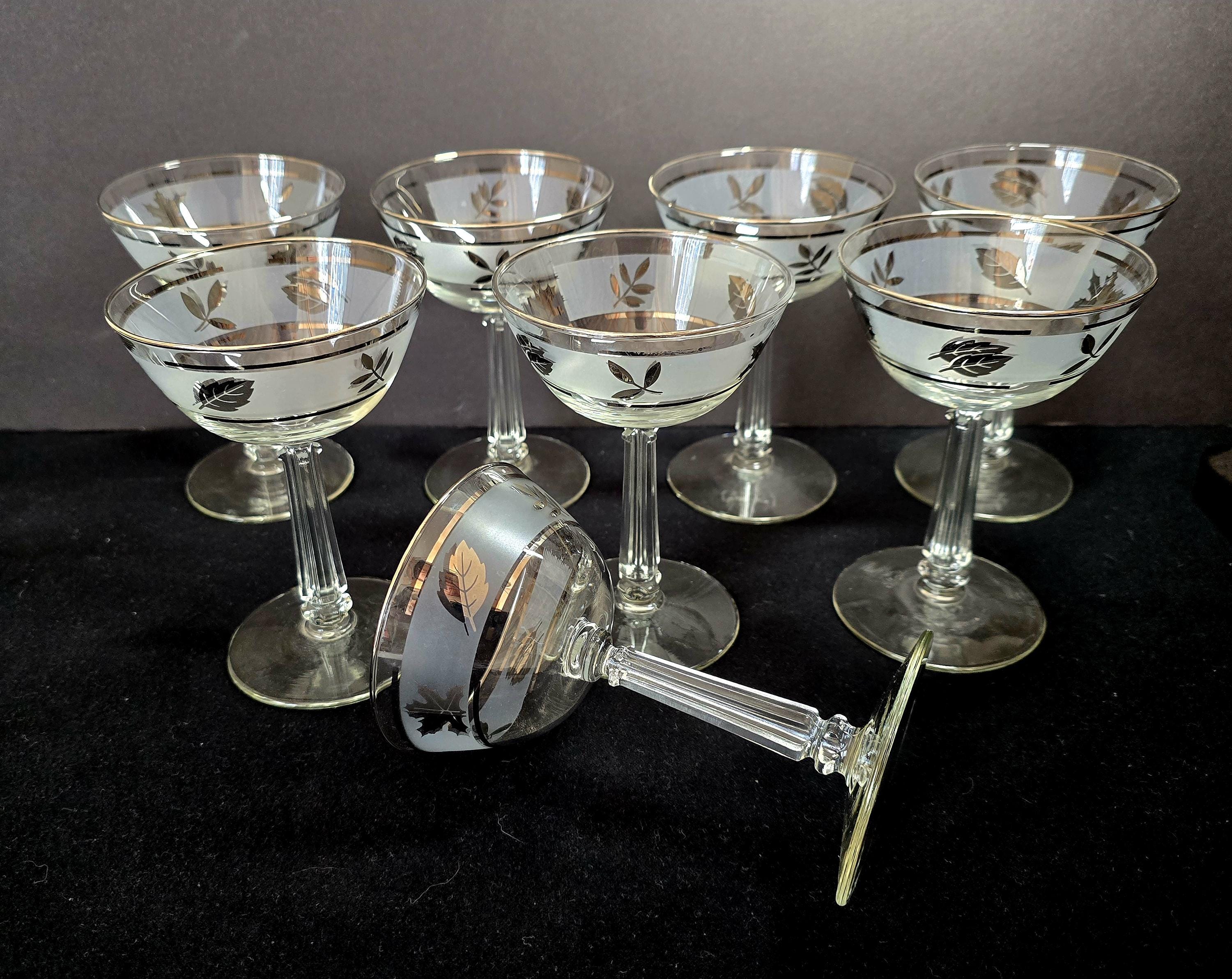 Cheers! These are about as perfect as any vintage glassware I've ever seen. All of the beautiful silver-gilding is intact. I don't think they were ever used. These are blown glass, made by Libbey Glass Company, 1953 - 1978. The gold version of these were used on the set of the Dick Van Dyke Show in the '60s.