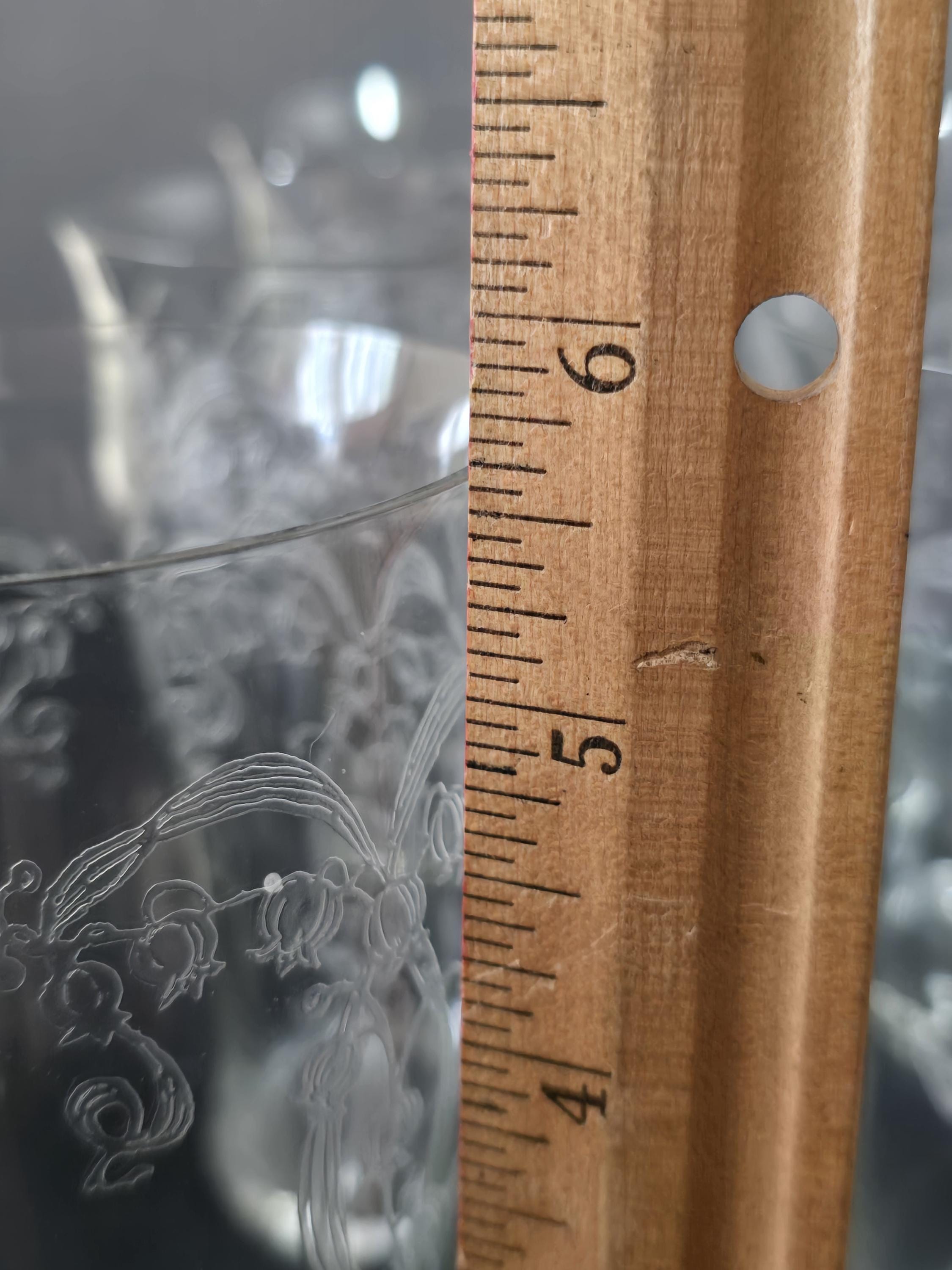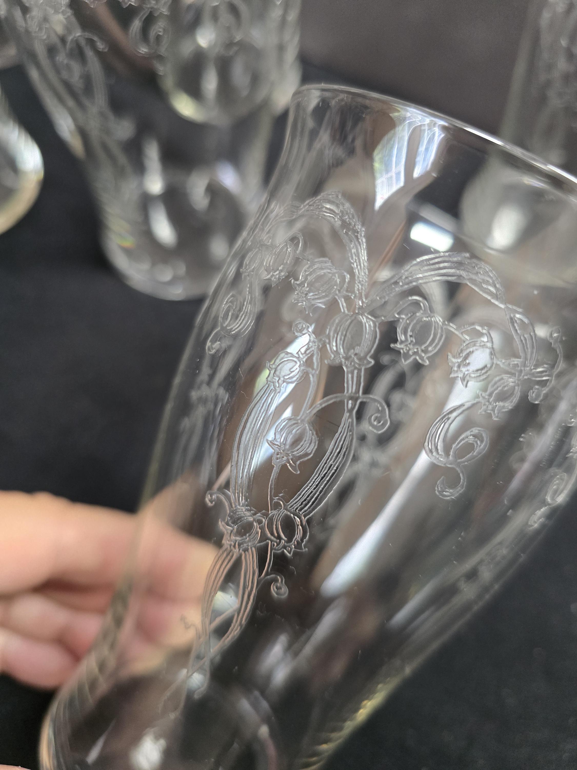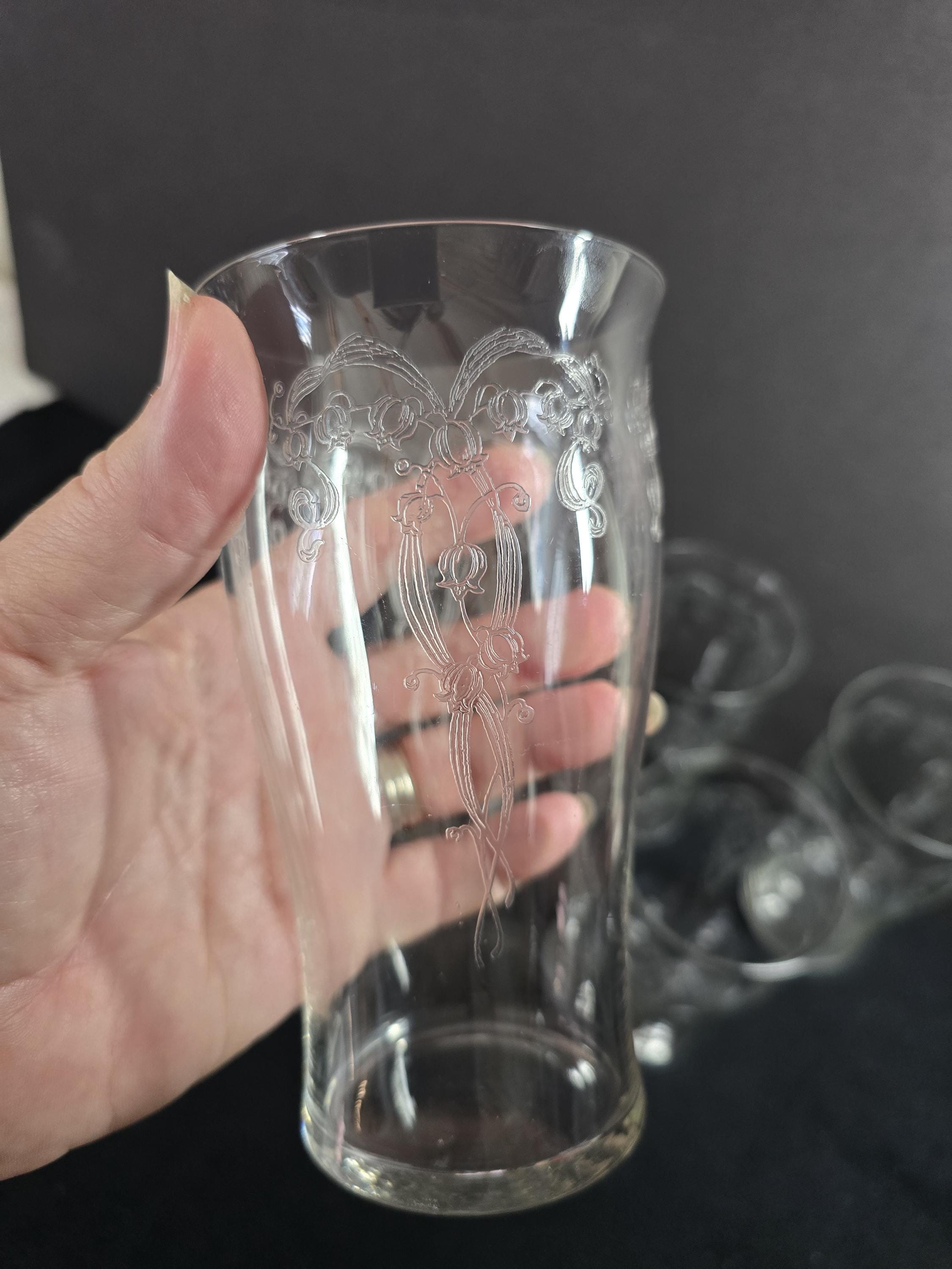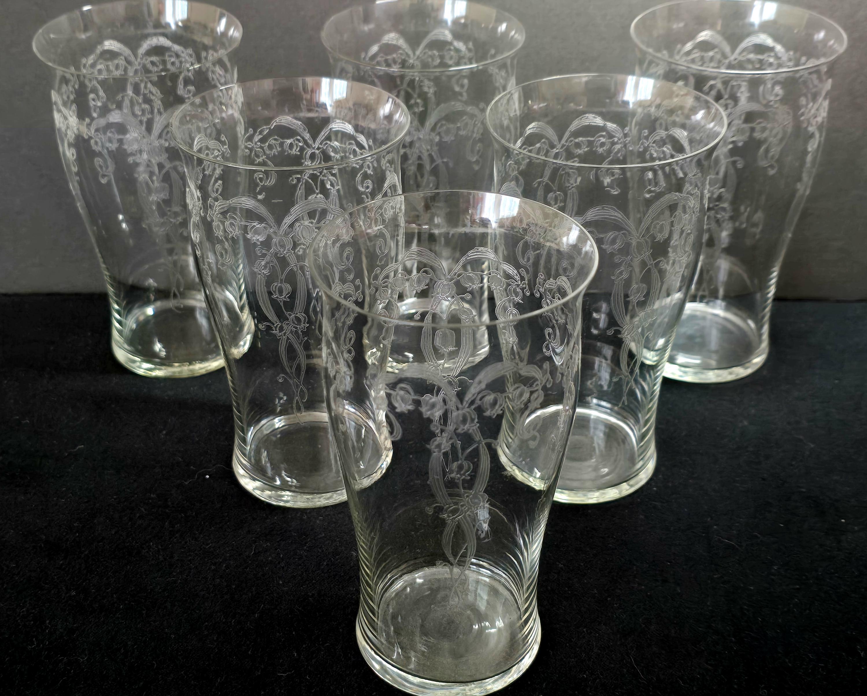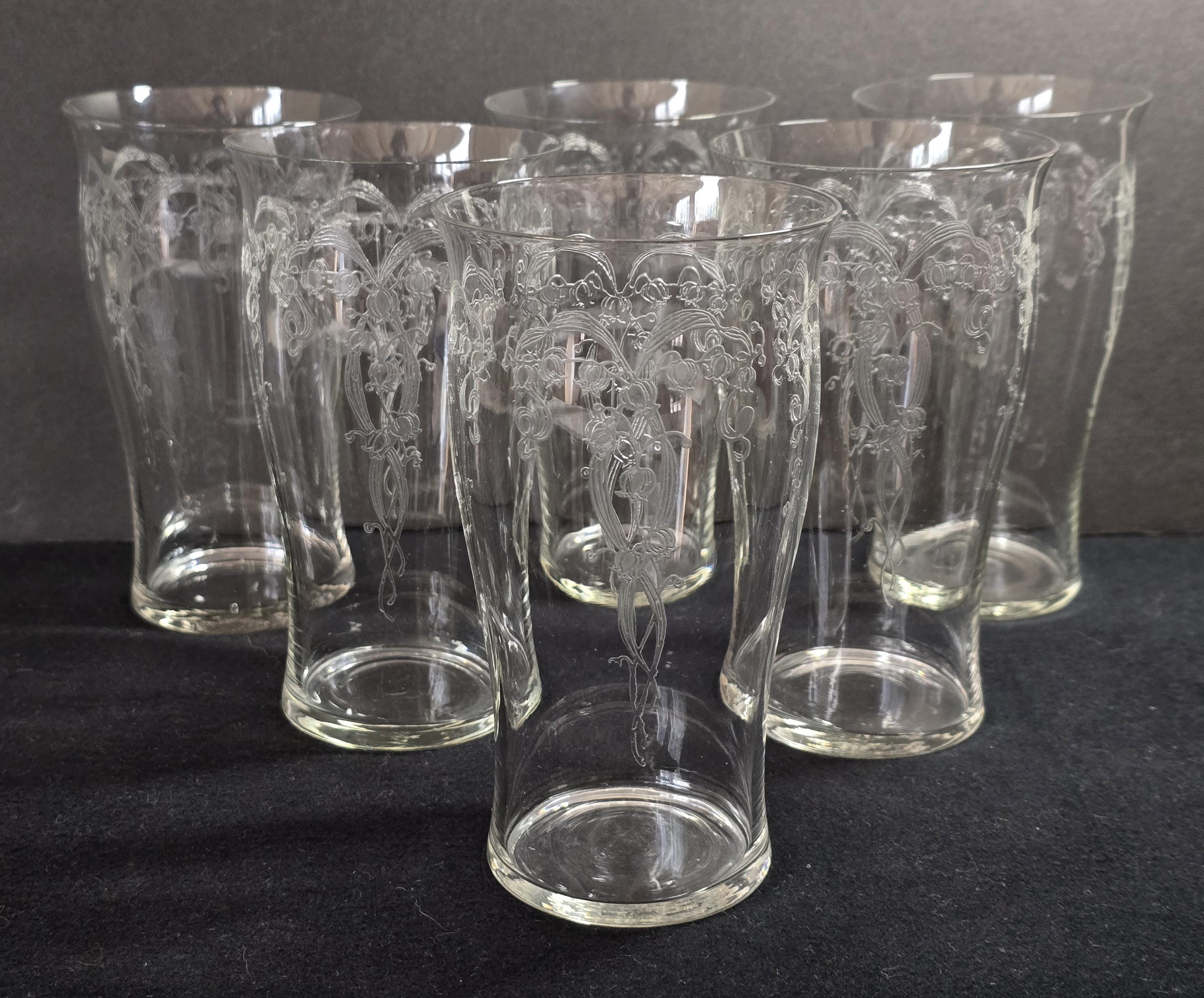Here we have an exquisite set of needle-etched tumblers by Fostoria Glass. The pattern is "Lily-of-the-Valley," circa 1917. These glasses are perfect for any iced beverage, or even a cold beer. Excellent vintage condition.