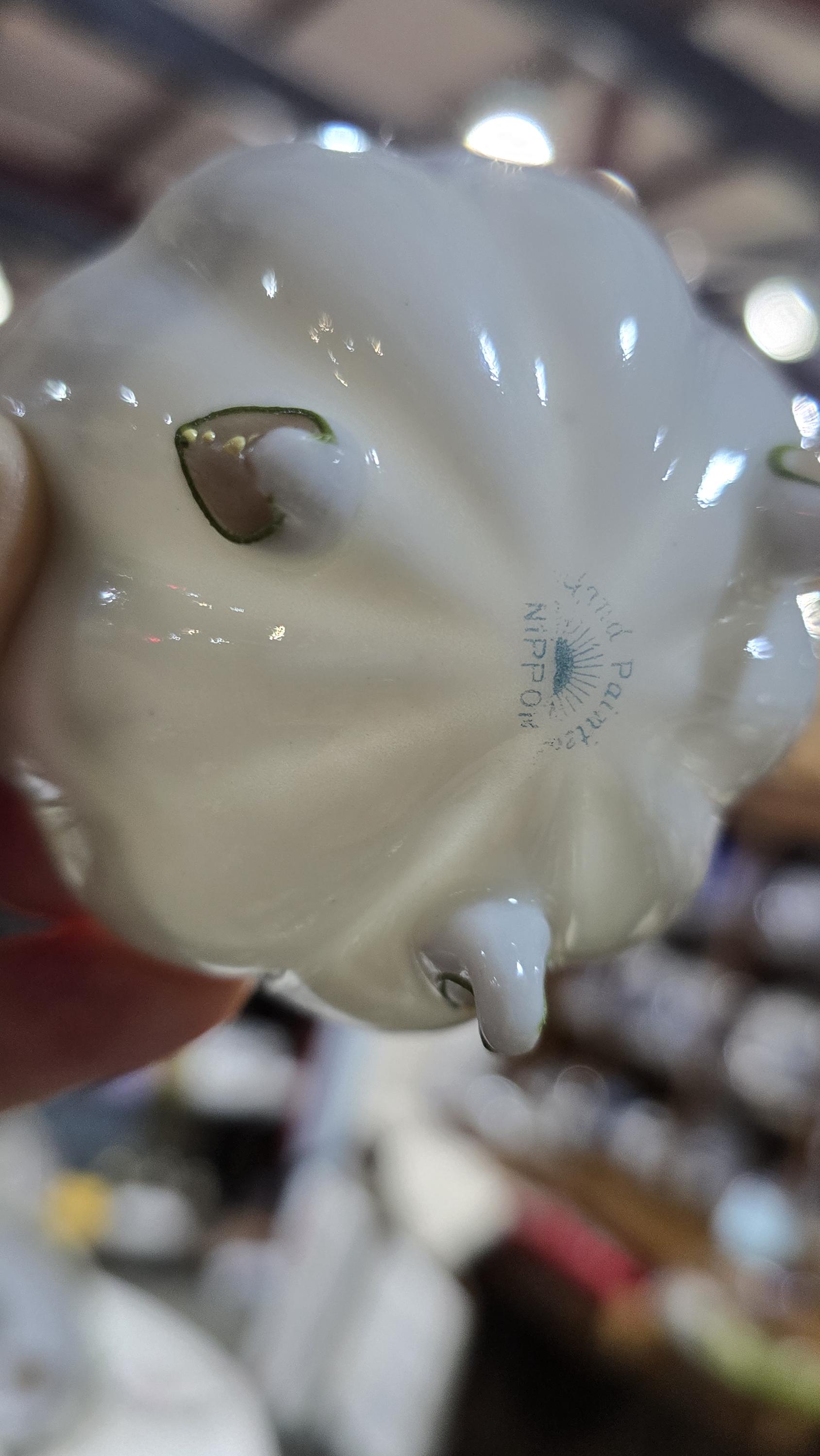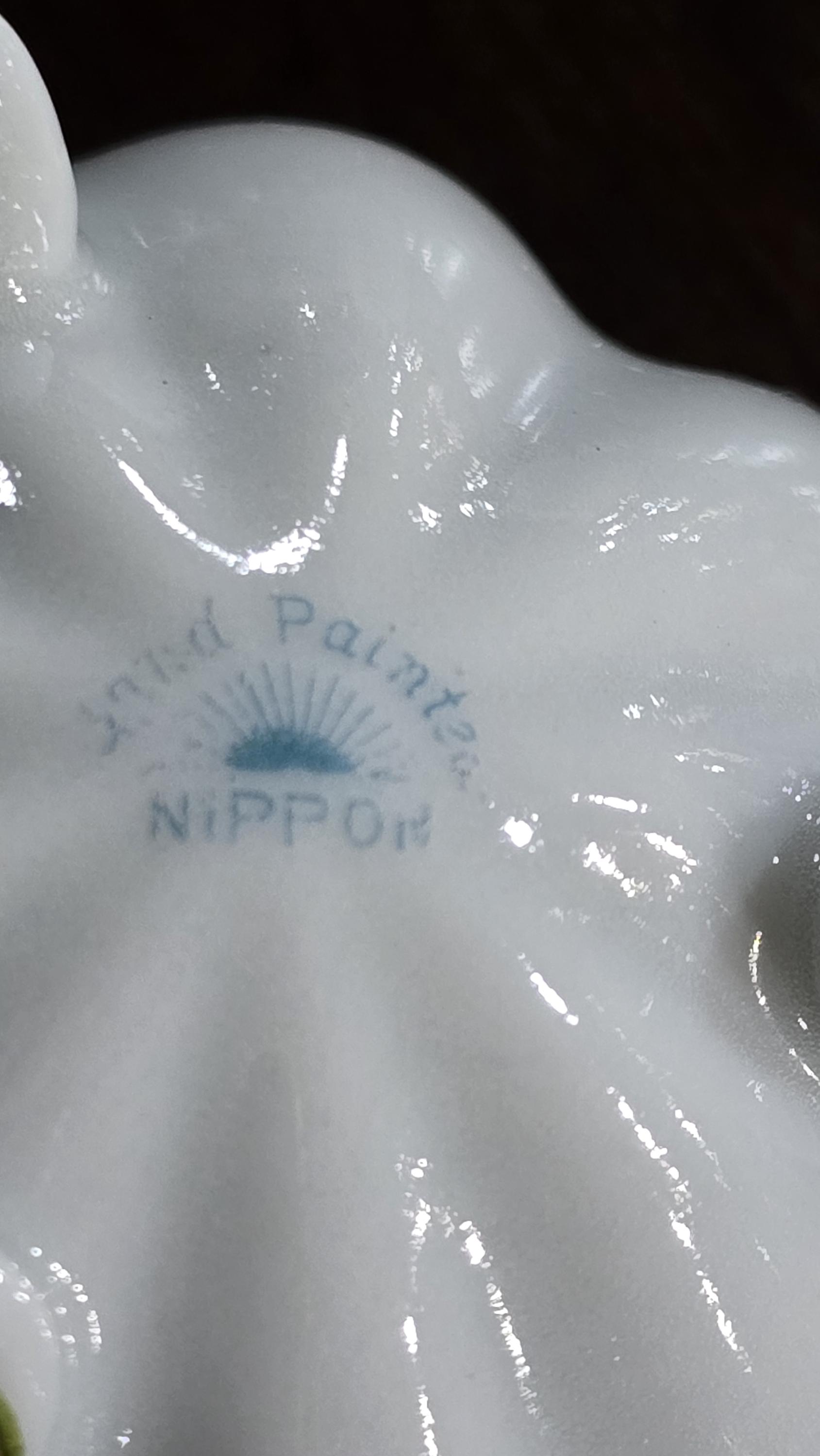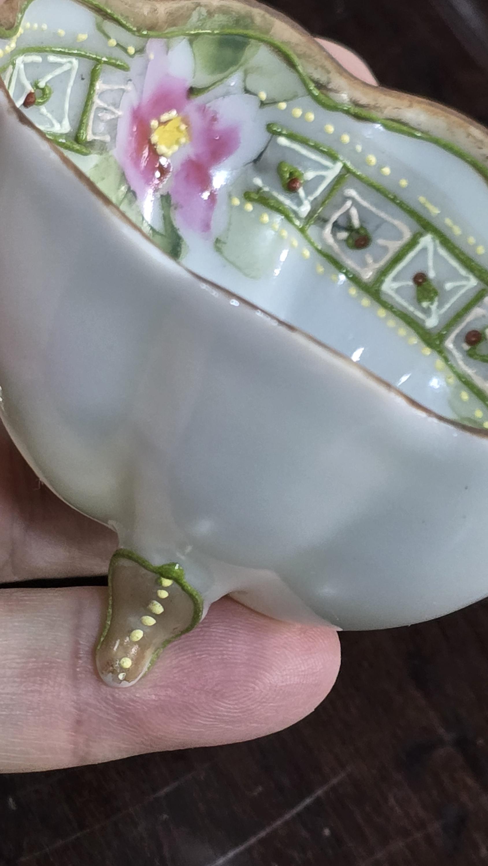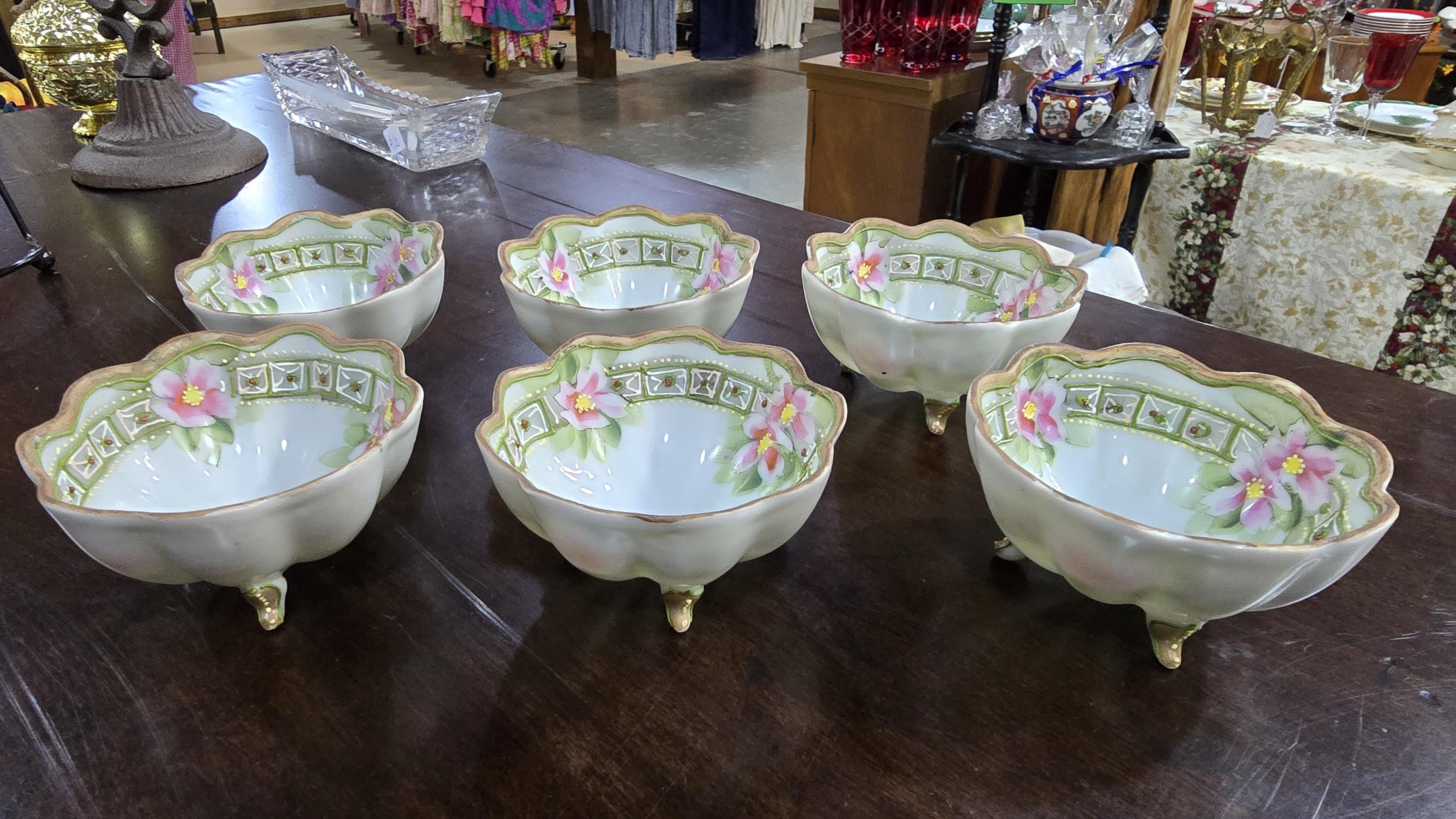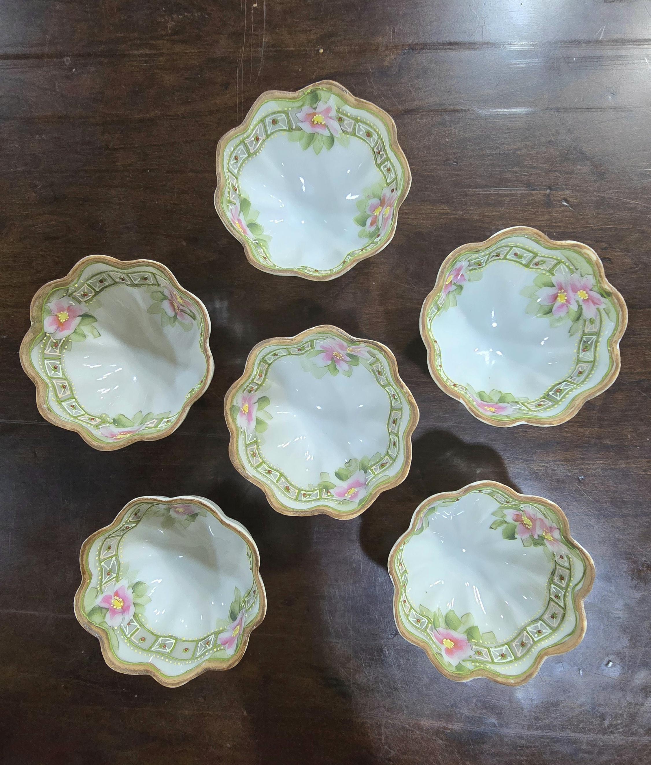 Beautiful set of footed, vintage nut bowls by Nippon. The translucent porcelain is delicately decorated with pink flowers, a green ribbon-like band, and tiny raised white dots. Rising Sun backstamp.