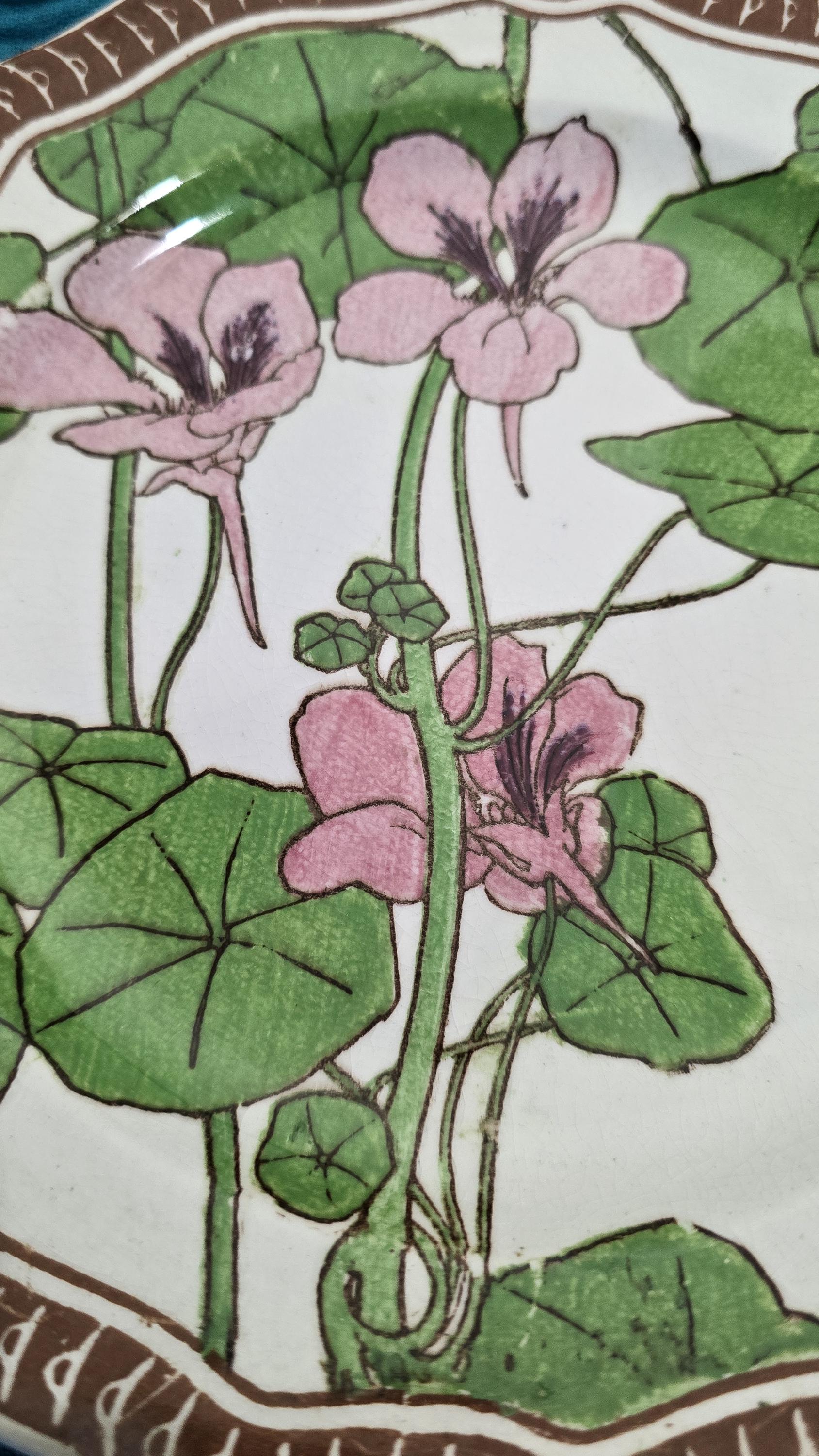 This is an exquisite set of plates for display or even occasional use. These antique dishes are in the Nasturtium pattern by Royal Doulton, D3810 edition. They are hand-painted, including the cross hatches on the trim. The backstamp places the manufacture date to between 1901 and 1922. Ideal for any collector of Royal Doulton ceramics.