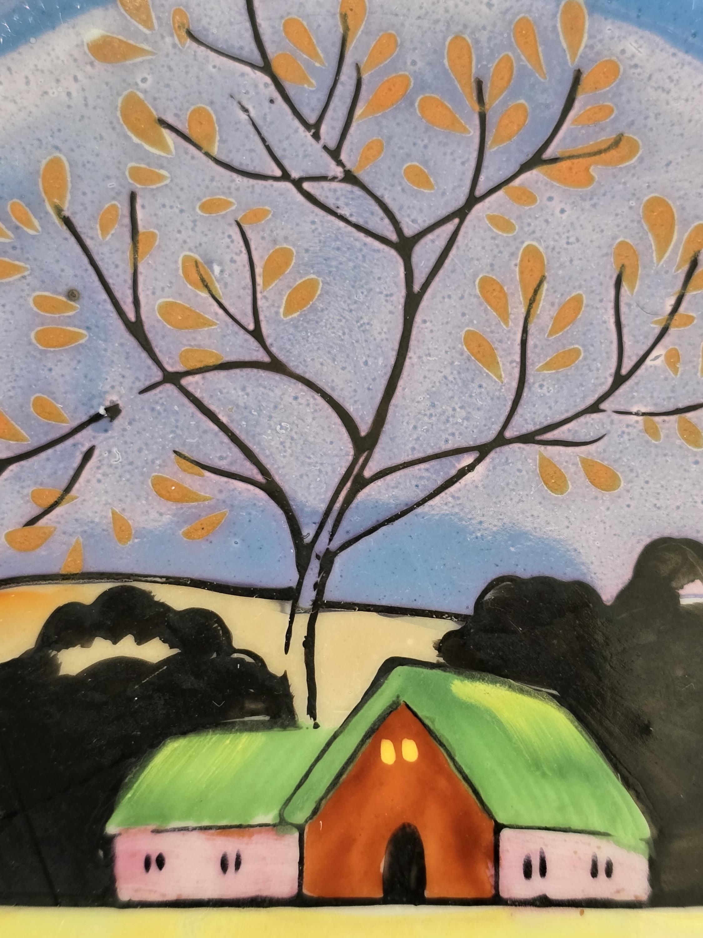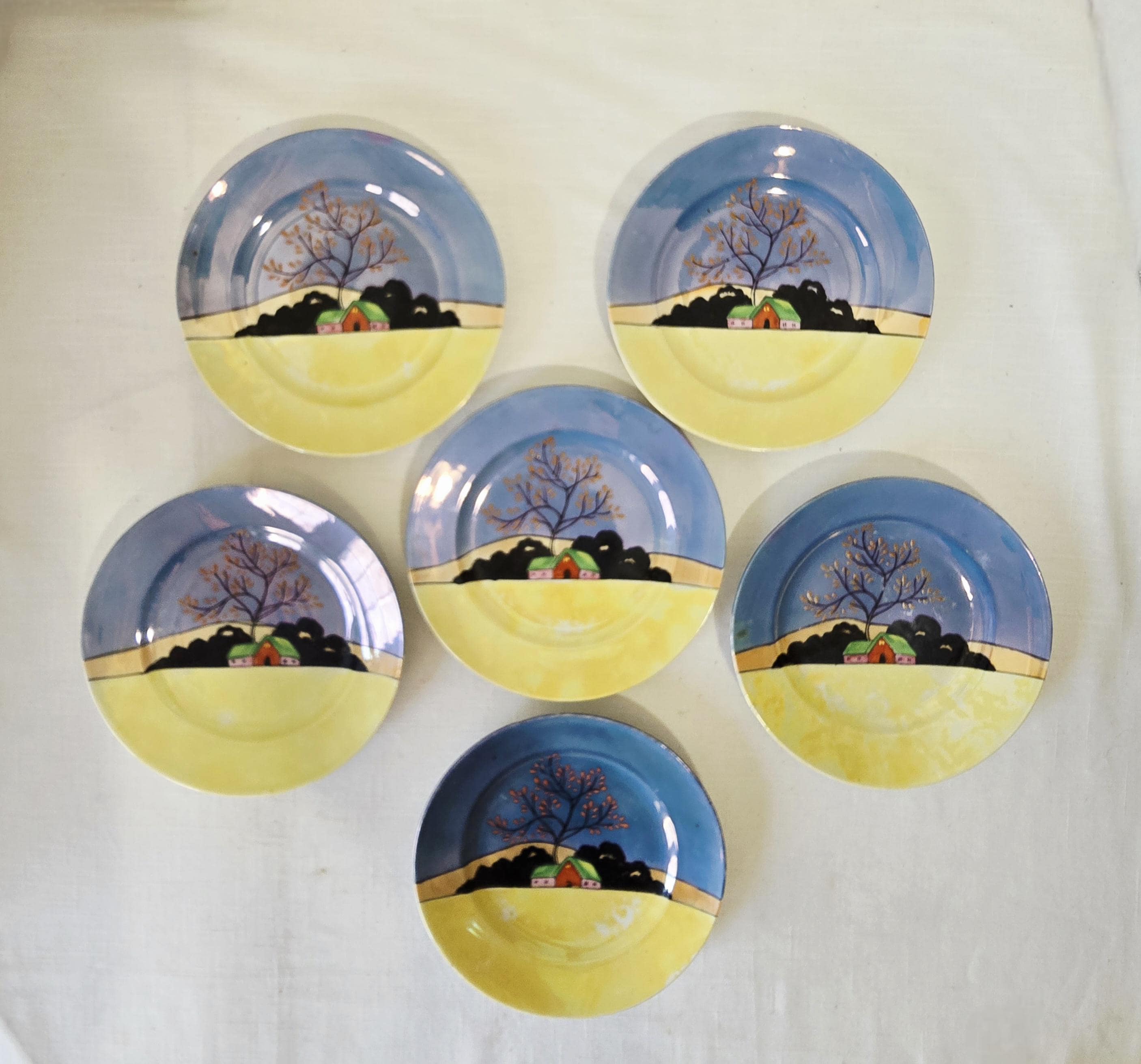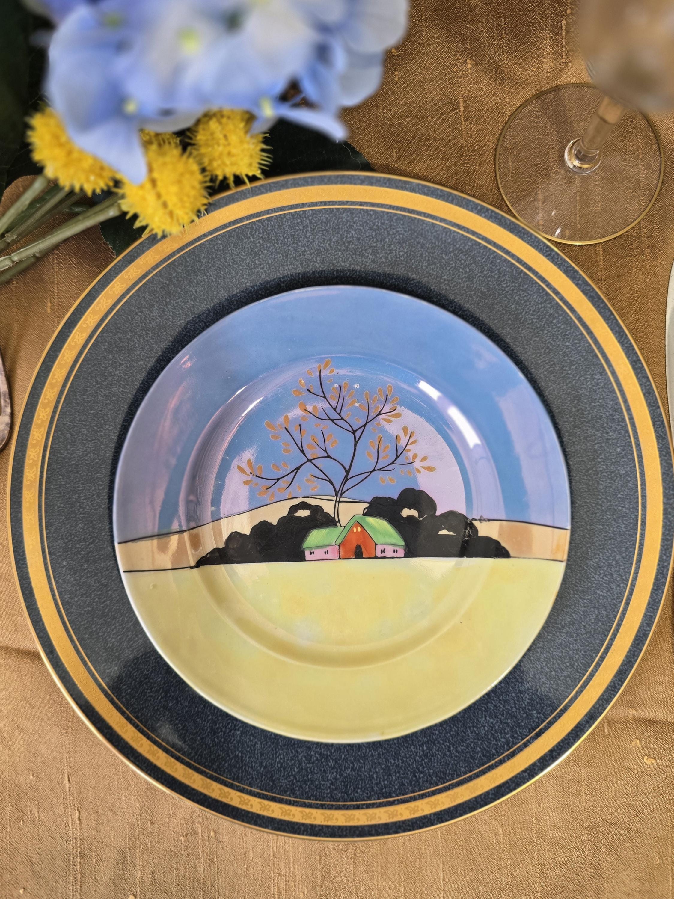 The photos really say it best! These hand painted plates are so very charming. They feature a farmhouse surrounded by green trees and a big, blue sky. Serene and simple, the iridescent finish of the lusterware adds a quiet glow to the scene. The small plates are attractive for display or table use.