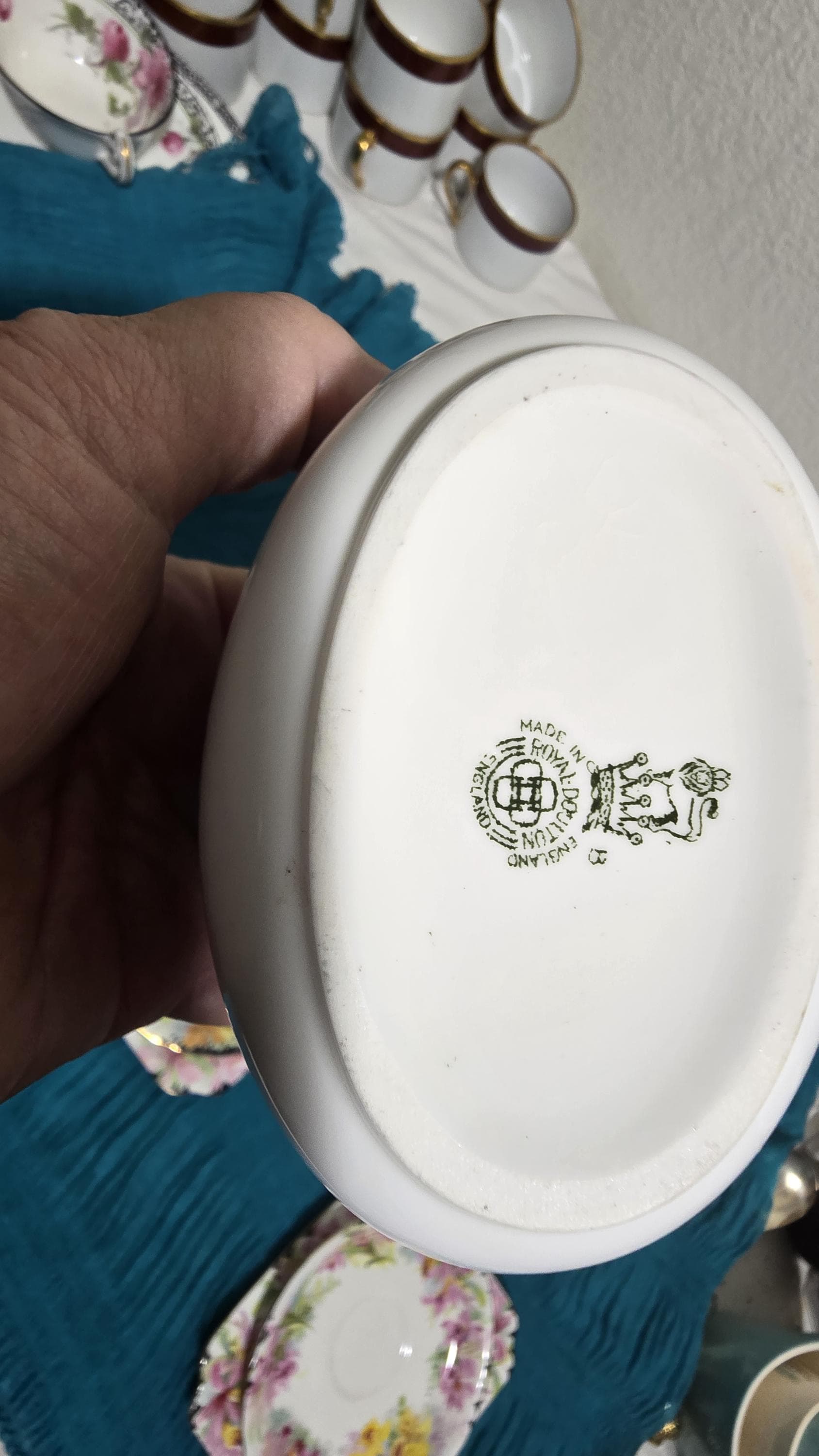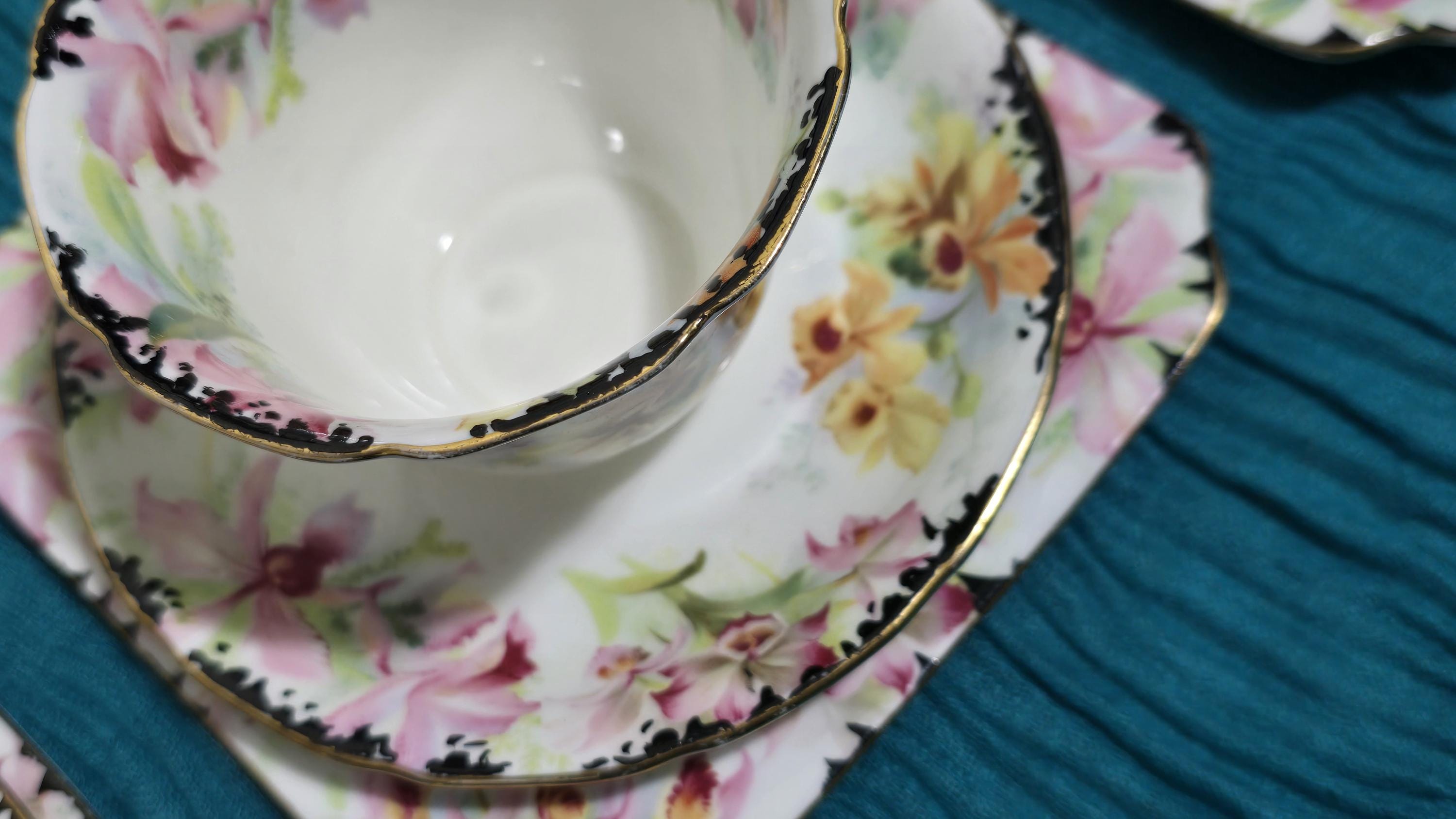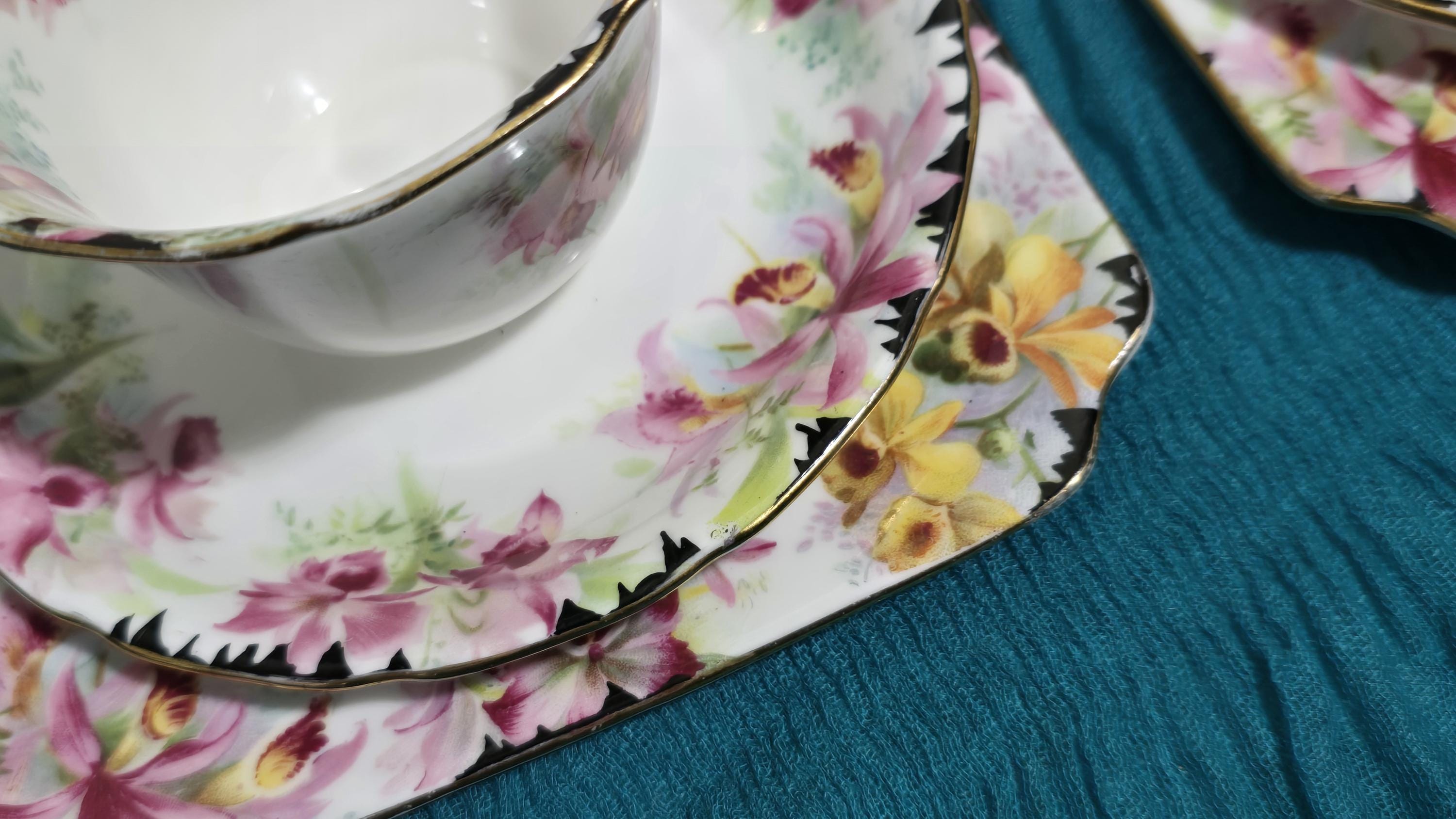 Another installment of Royal Doulton from a collector's estate. This is a lovely, hand-decorated tea set that includes three cup-and-saucer sets with matching square snack plates. I love that the designer snuck one or two yellow orchids amidst the pink ones that dominate the decoration. The teapot, creamer, and open sugar are white porcelain, trimmed in gold; while the cup sets have a white background, but trimmed with black. Overall, the effect is delightful! All of the pieces bear slightly different Royal Doulton backstamps. Altogether, these pieces were produced during the 1930s and 40s, speaking for the lasting popularity of the Orchid pattern.