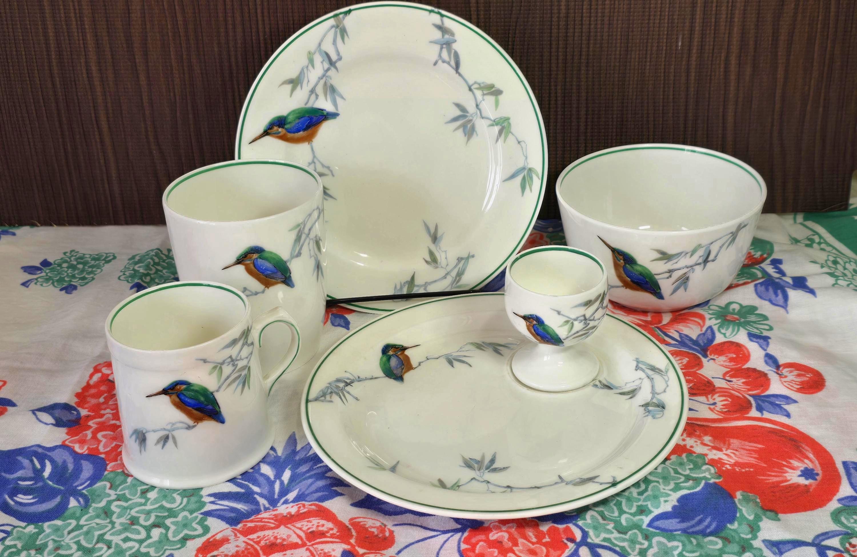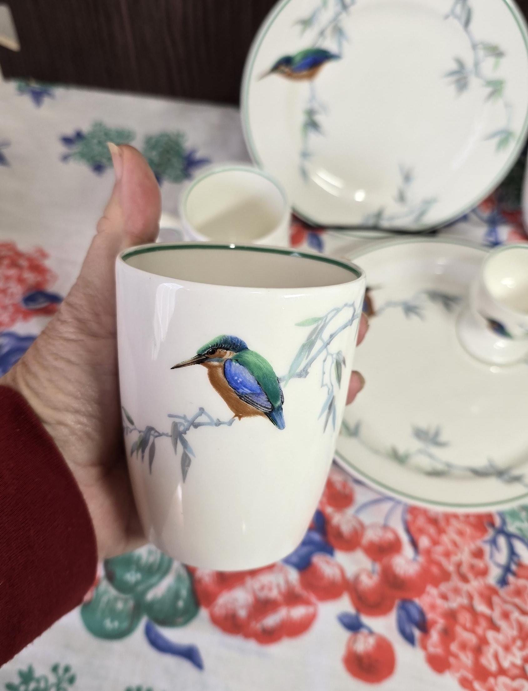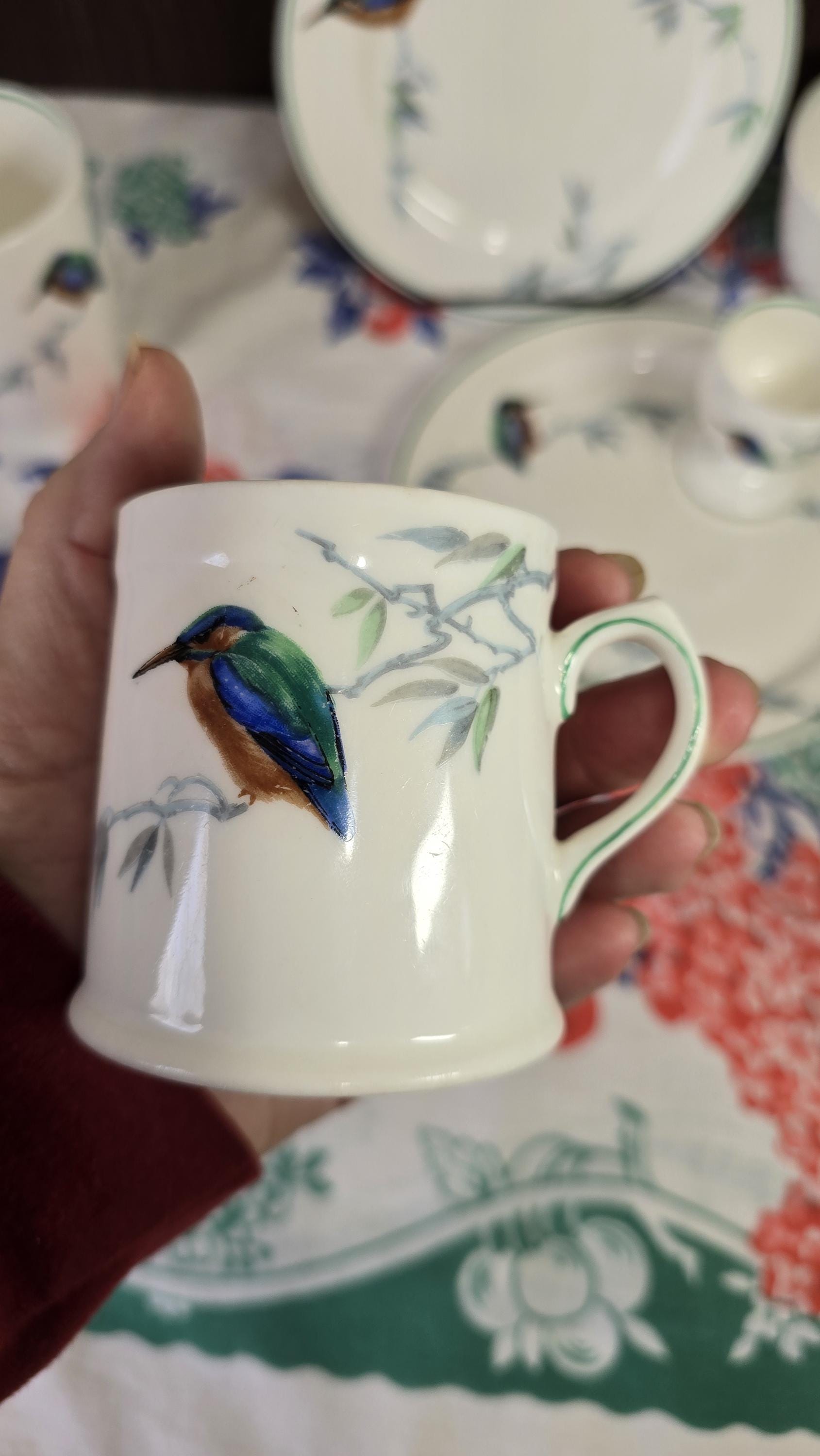 The collection includes: 1 dessert plate, 1 snack plate (with cup muzzle); one tumbler; one small mug; one egg cup; and one berry bowl. All are in excellent condition. No chips, cracks, or crazing. Please feel free to message with any questions.