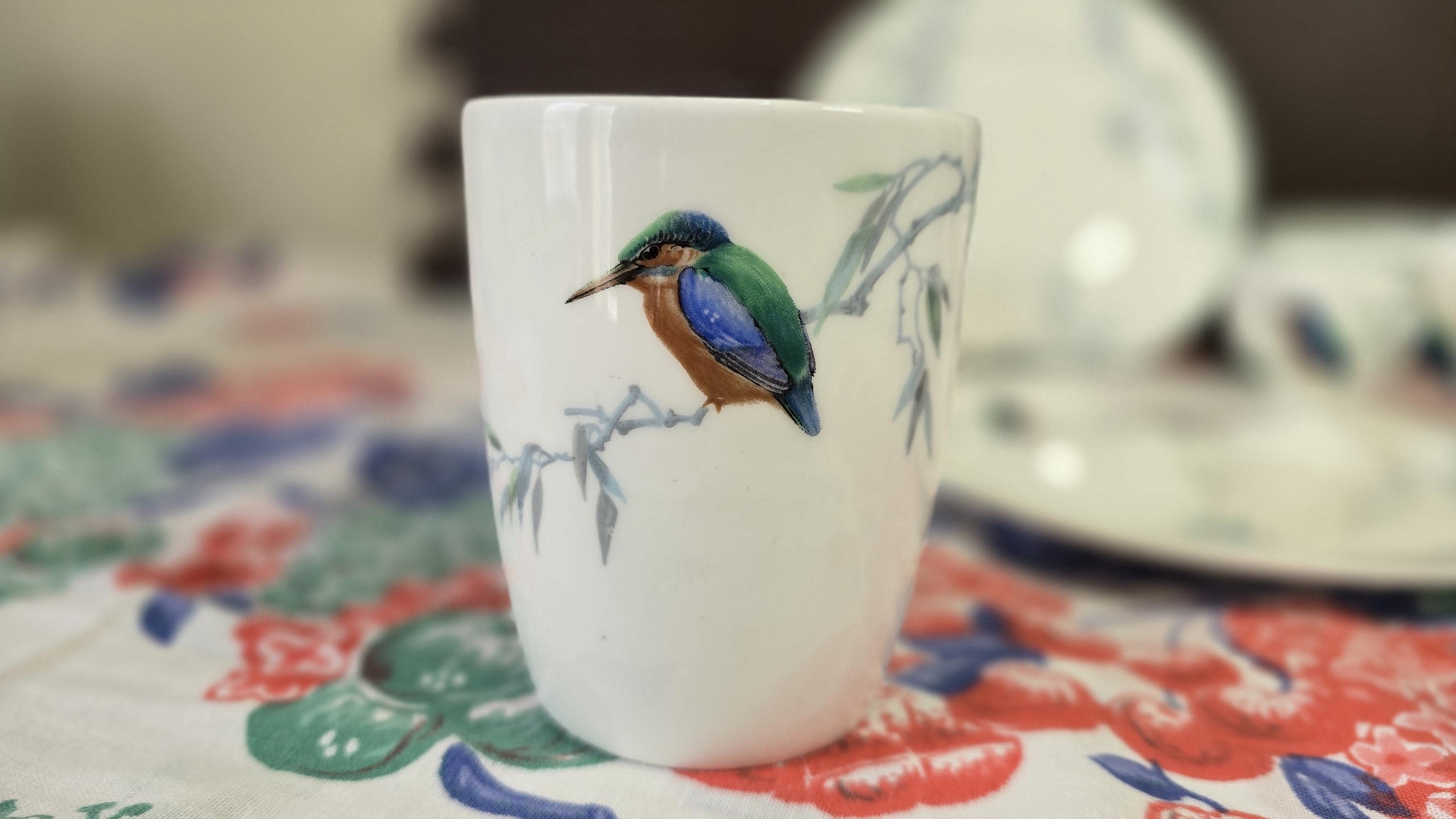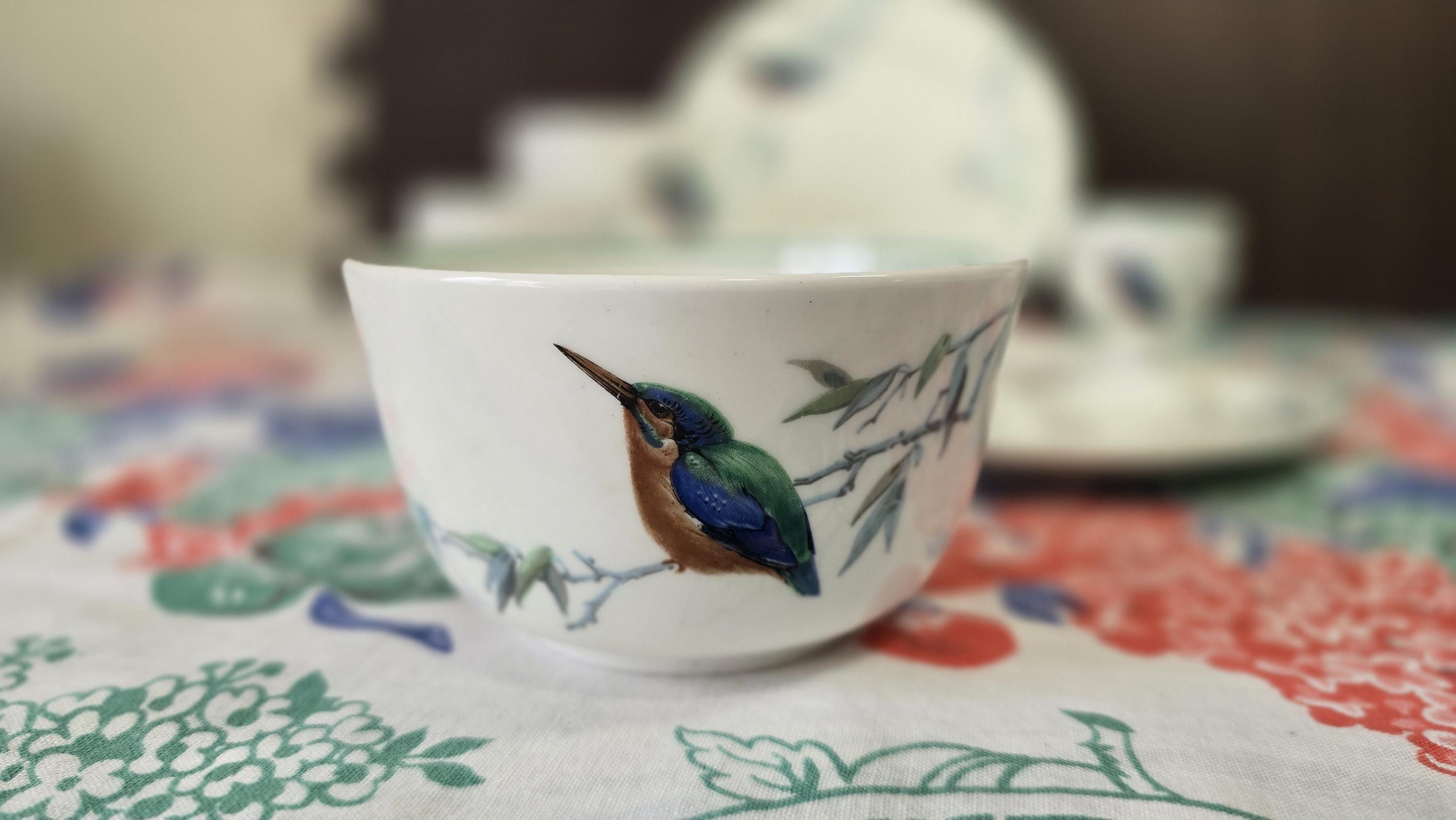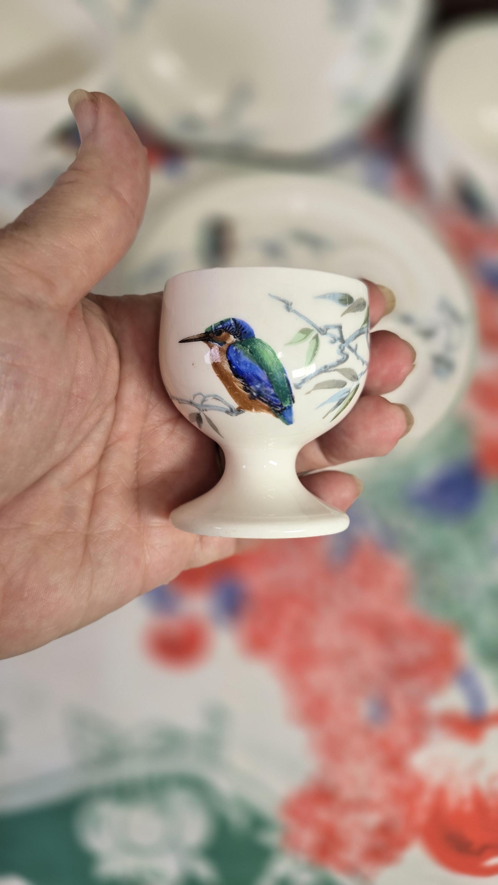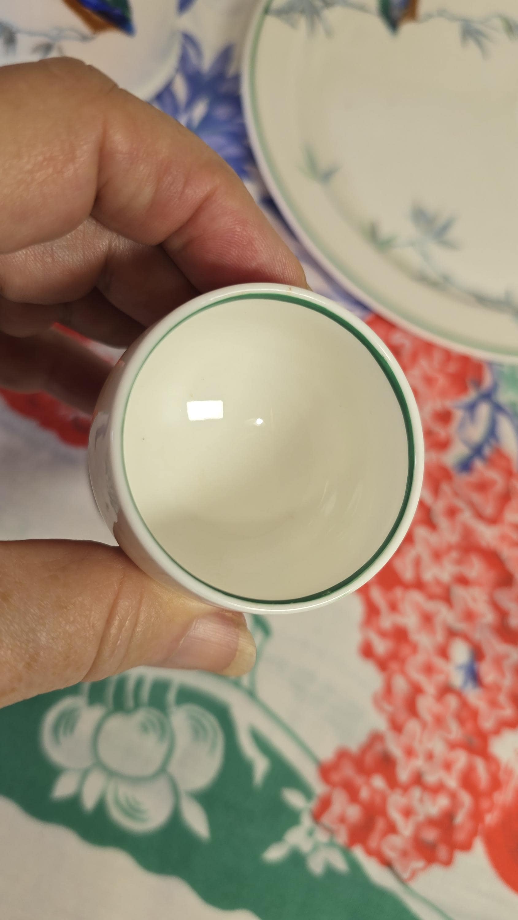 The collection includes: 1 dessert plate, 1 snack plate (with cup muzzle); one tumbler; one small mug; one egg cup; and one berry bowl. All are in excellent condition. No chips, cracks, or crazing. Please feel free to message with any questions.