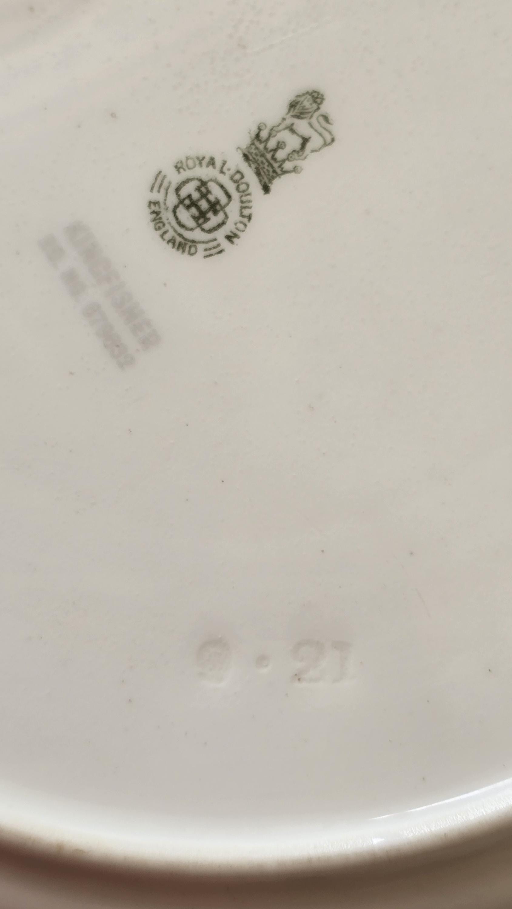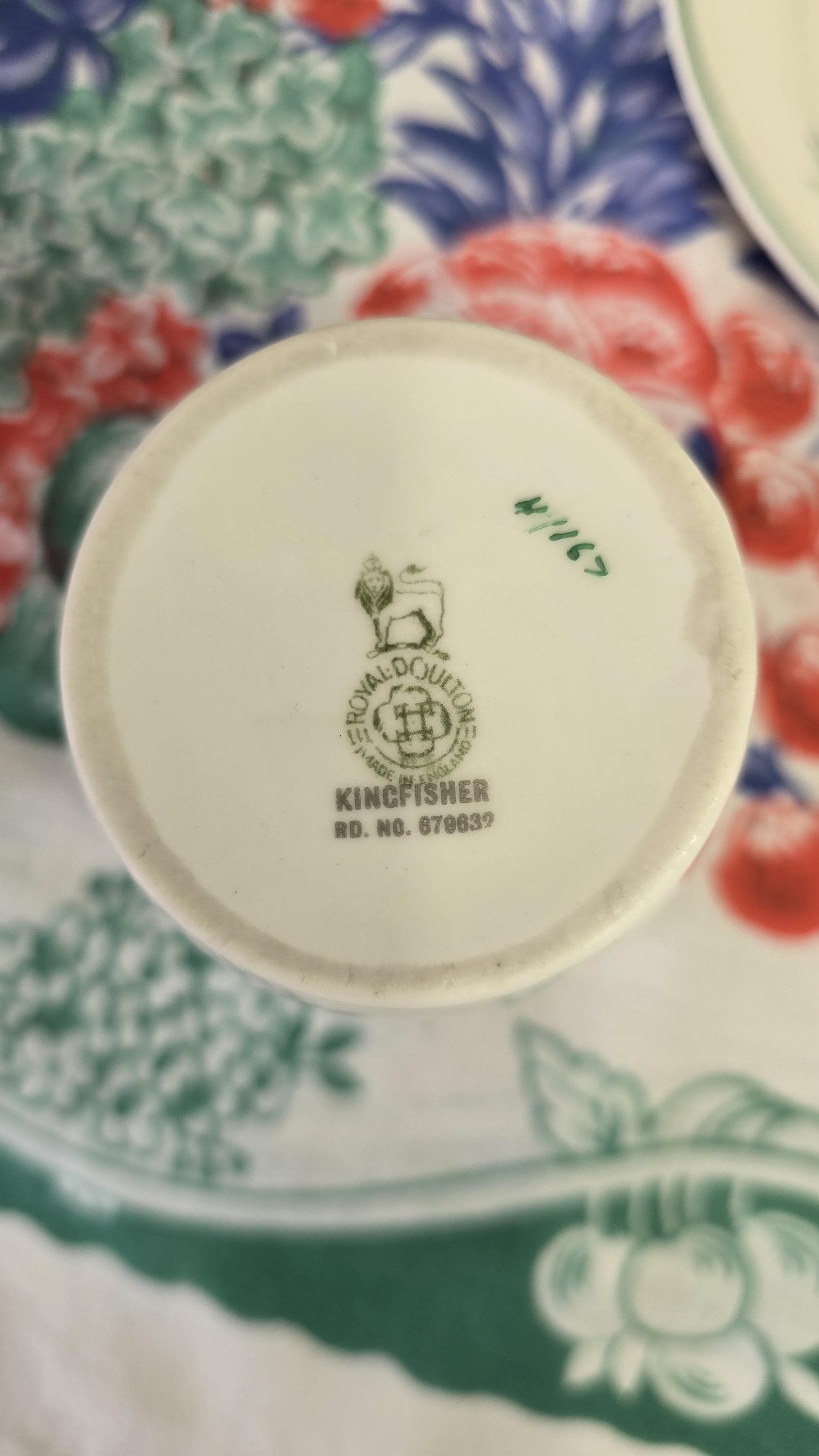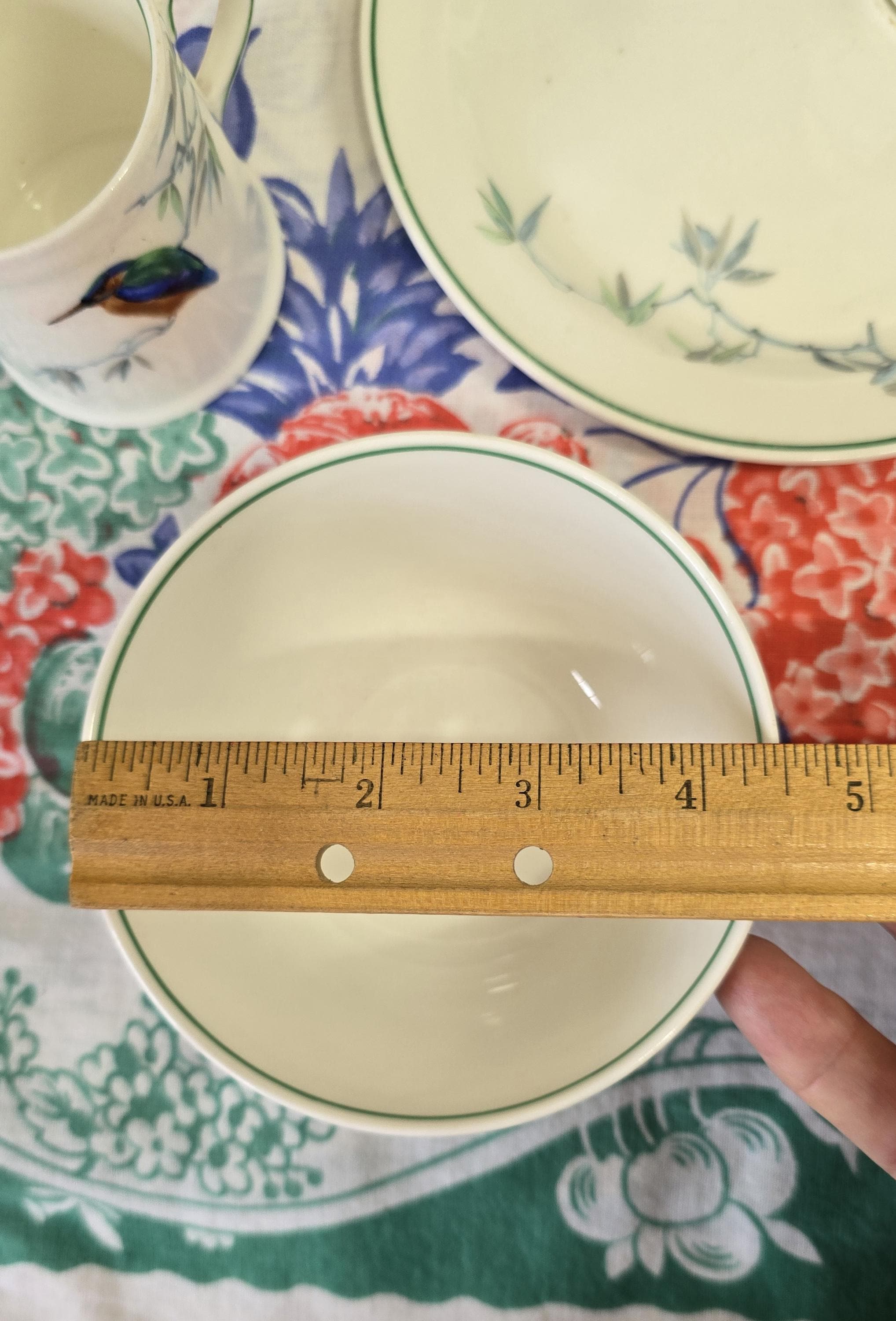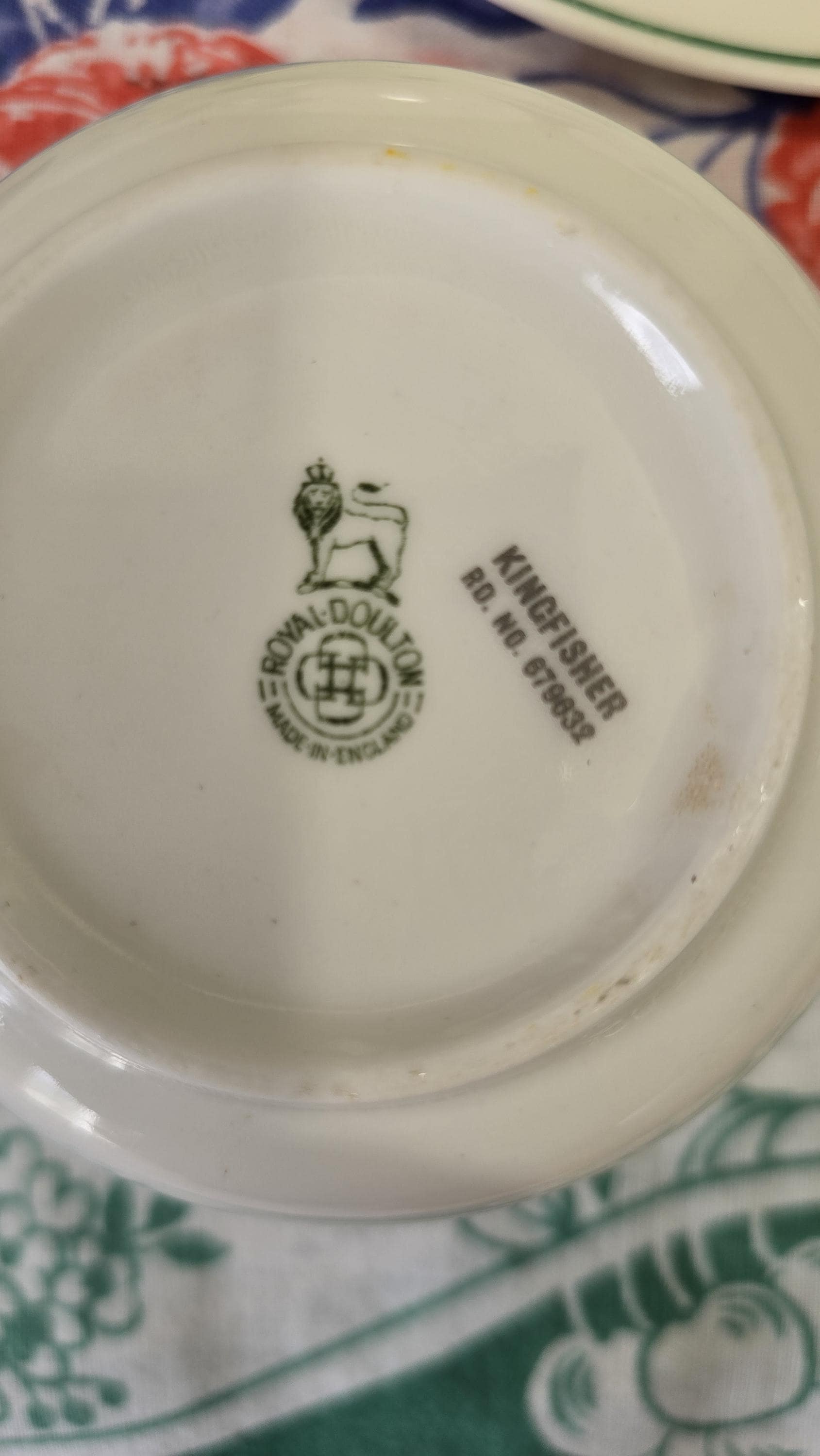 Here is another installment of "Kingfisher" bone china dishes by Royal Doulton. These are verified antique/near antique using the incised dates (some pieces) and the printed Royal Doulton makers marks underglaze. All, of course, feature the beautiful blue and green kingfisher bird perched on twigs of bamboo, edged in grass green - all applied by hand. As a guide, the photo of each individual piece is followed by a photo of the backstamps of that preceding piece. Following the backstamp photo is a photo showing scale - either handheld or using a ruler.