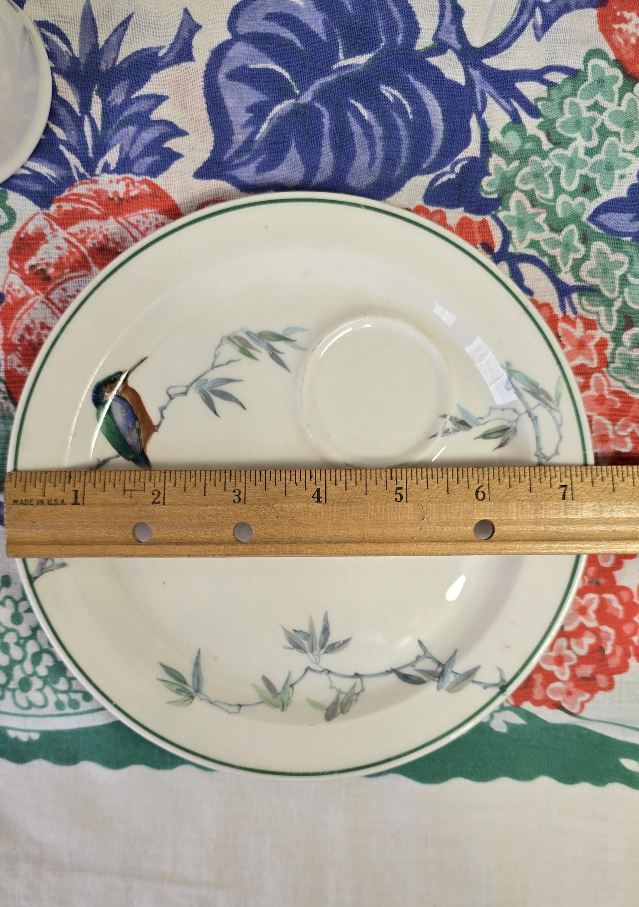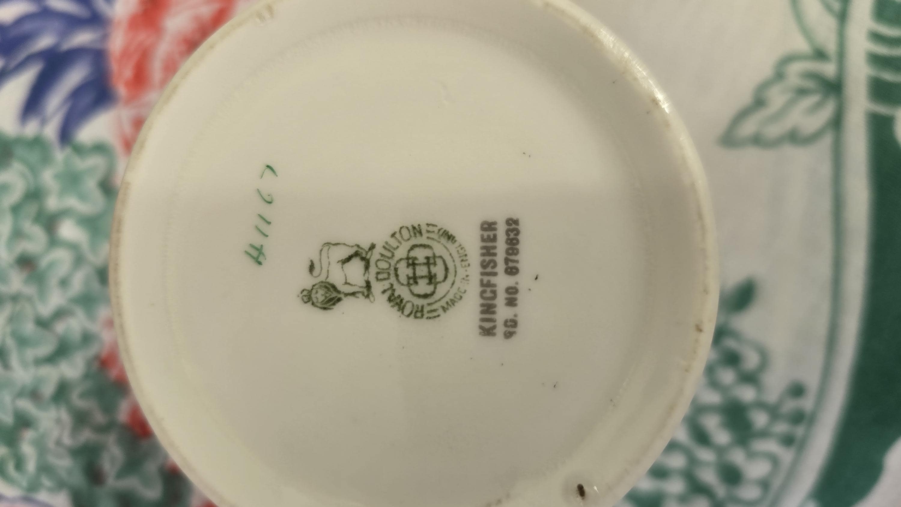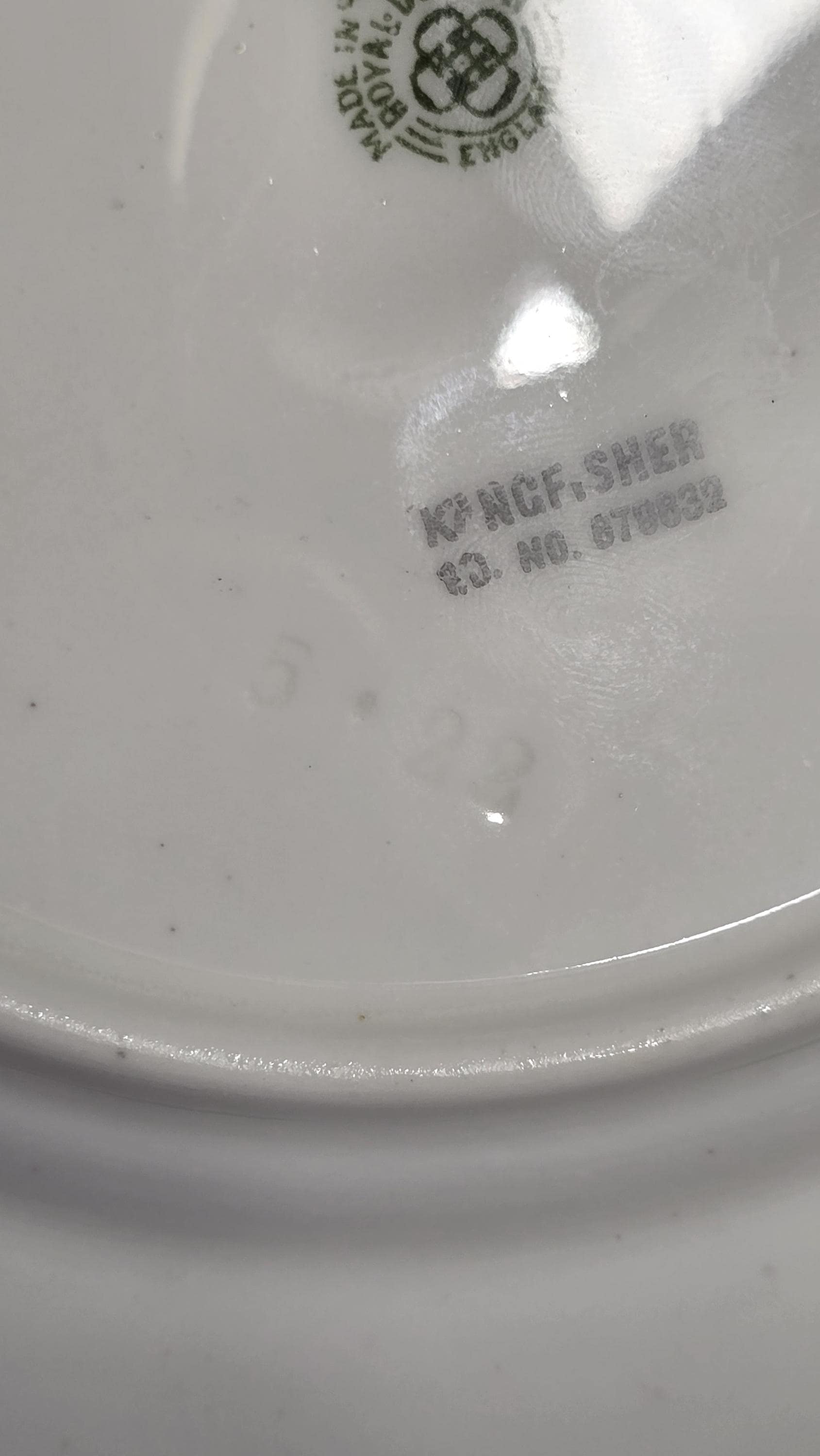 Here is another installment of "Kingfisher" bone china dishes by Royal Doulton. These are verified antique/near antique using the incised dates (some pieces) and the printed Royal Doulton makers marks underglaze. All, of course, feature the beautiful blue and green kingfisher bird perched on twigs of bamboo, edged in grass green - all applied by hand. As a guide, the photo of each individual piece is followed by a photo of the backstamps of that preceding piece. Following the backstamp photo is a photo showing scale - either handheld or using a ruler.
