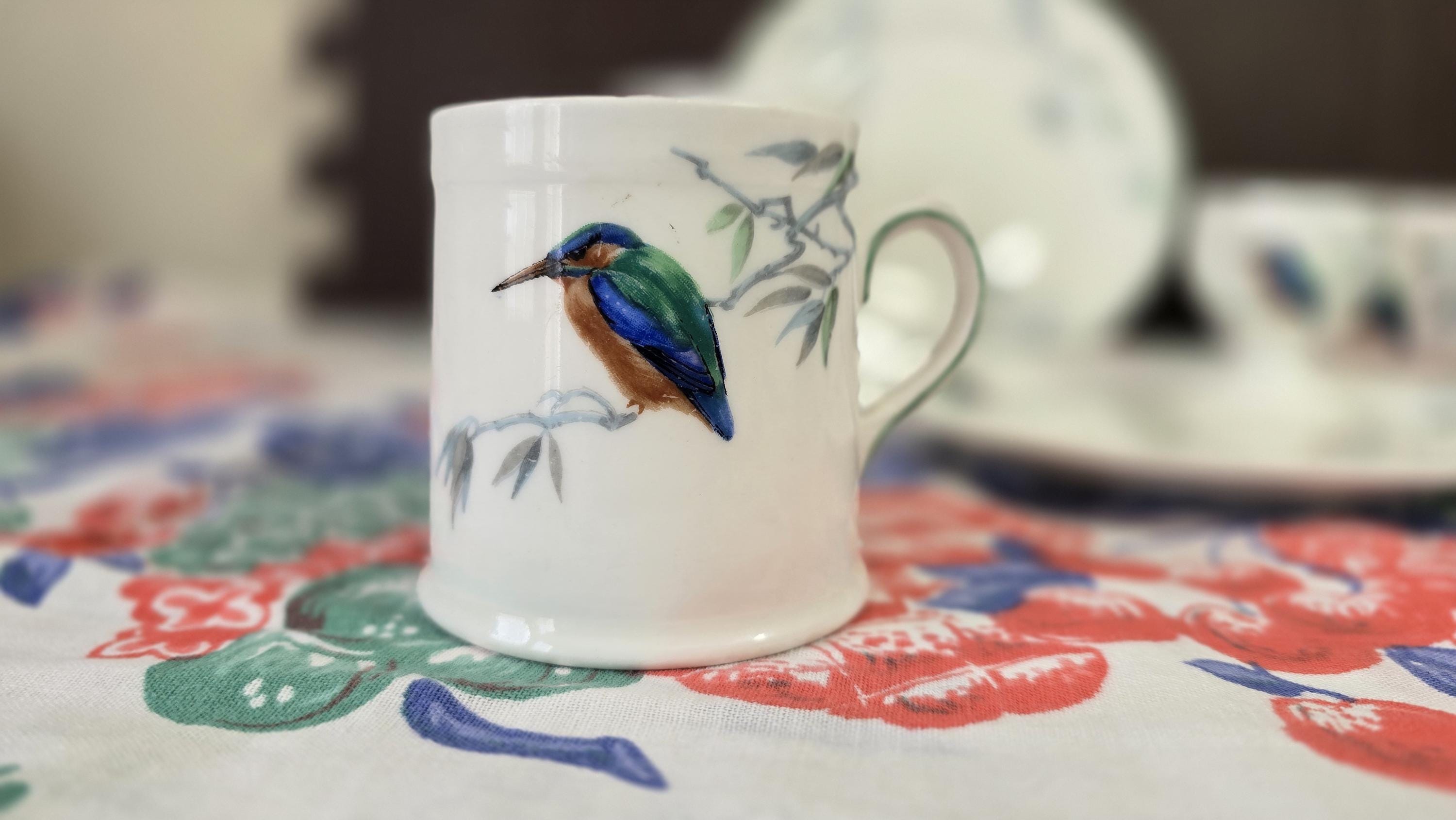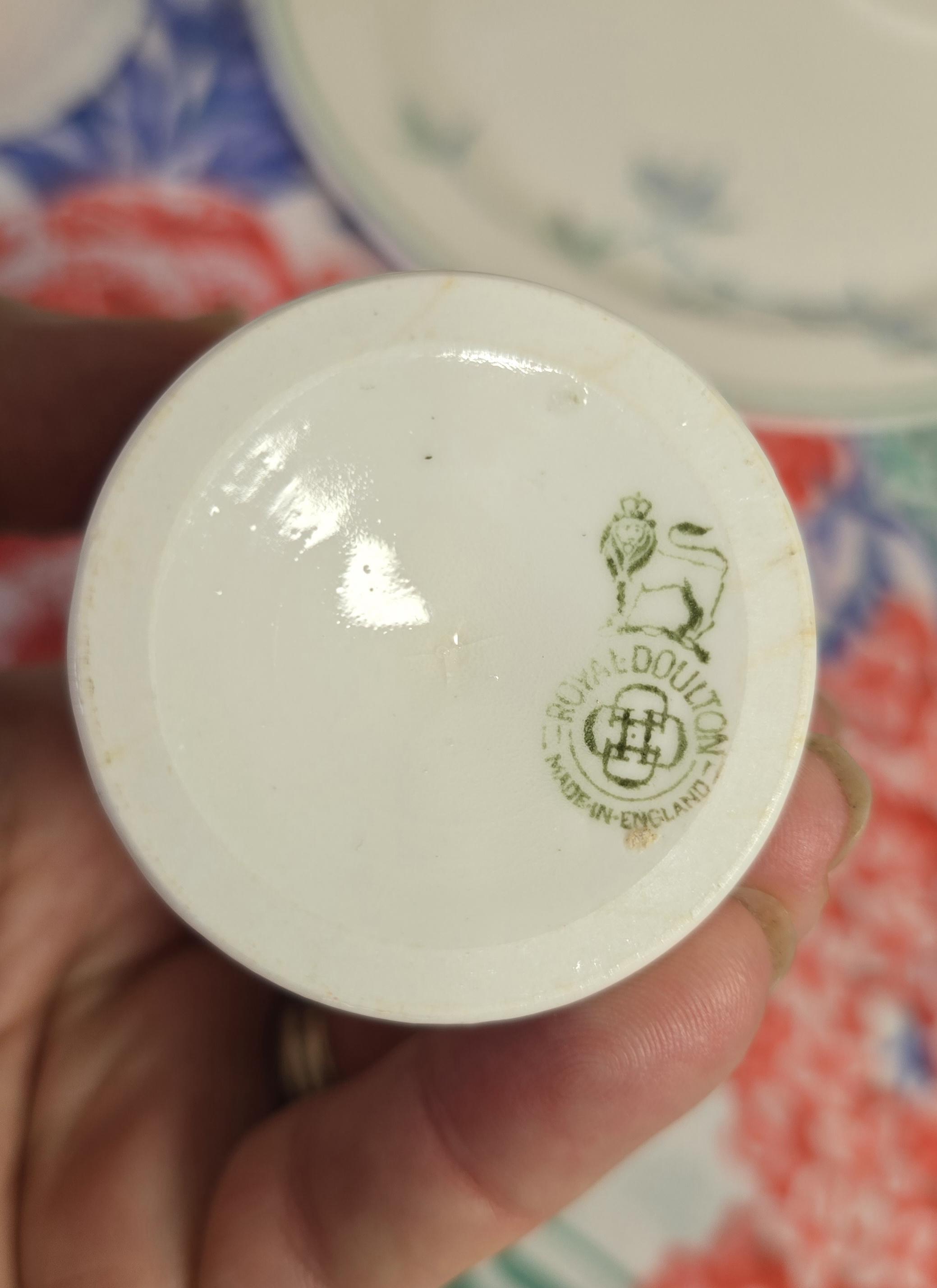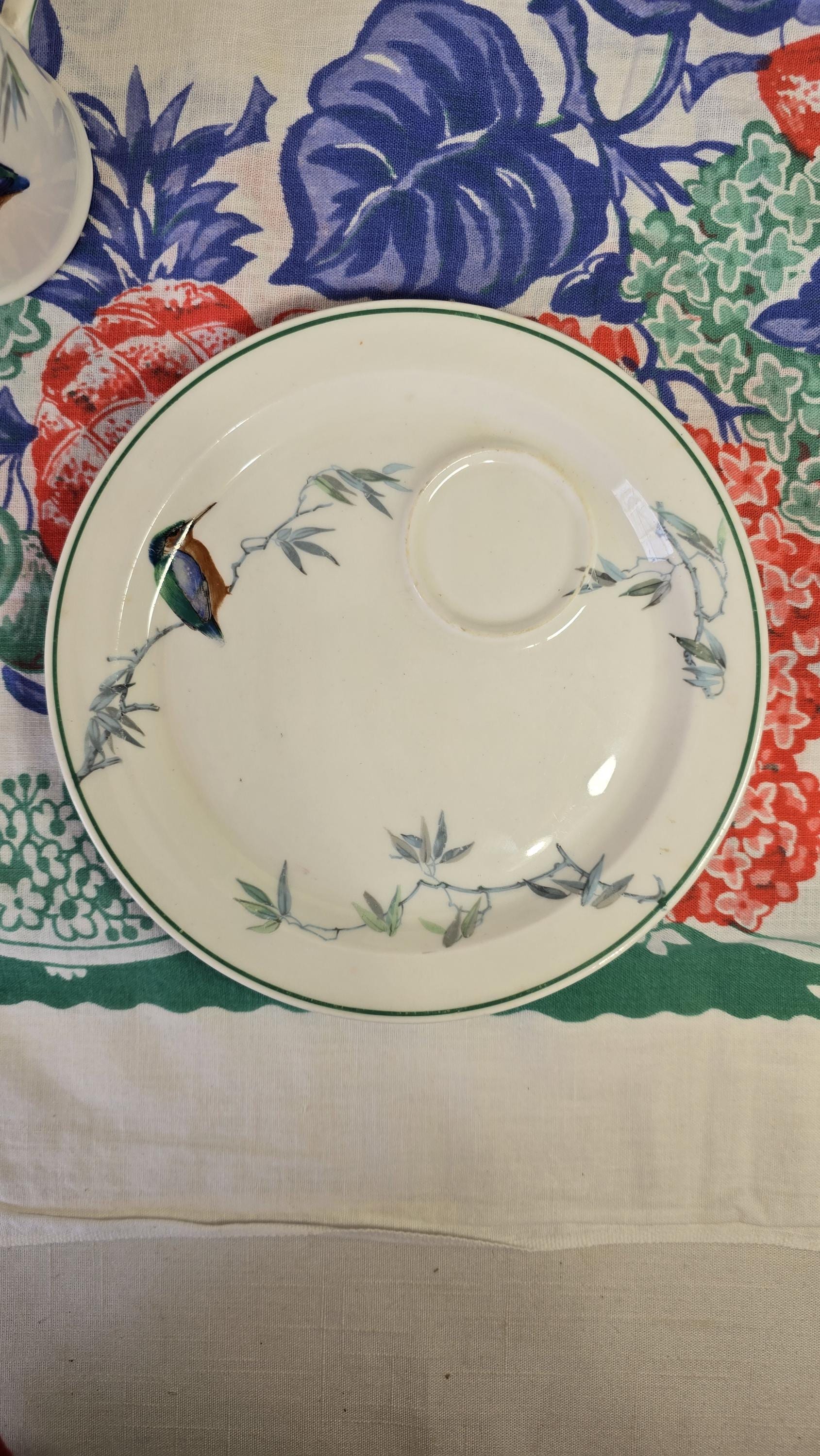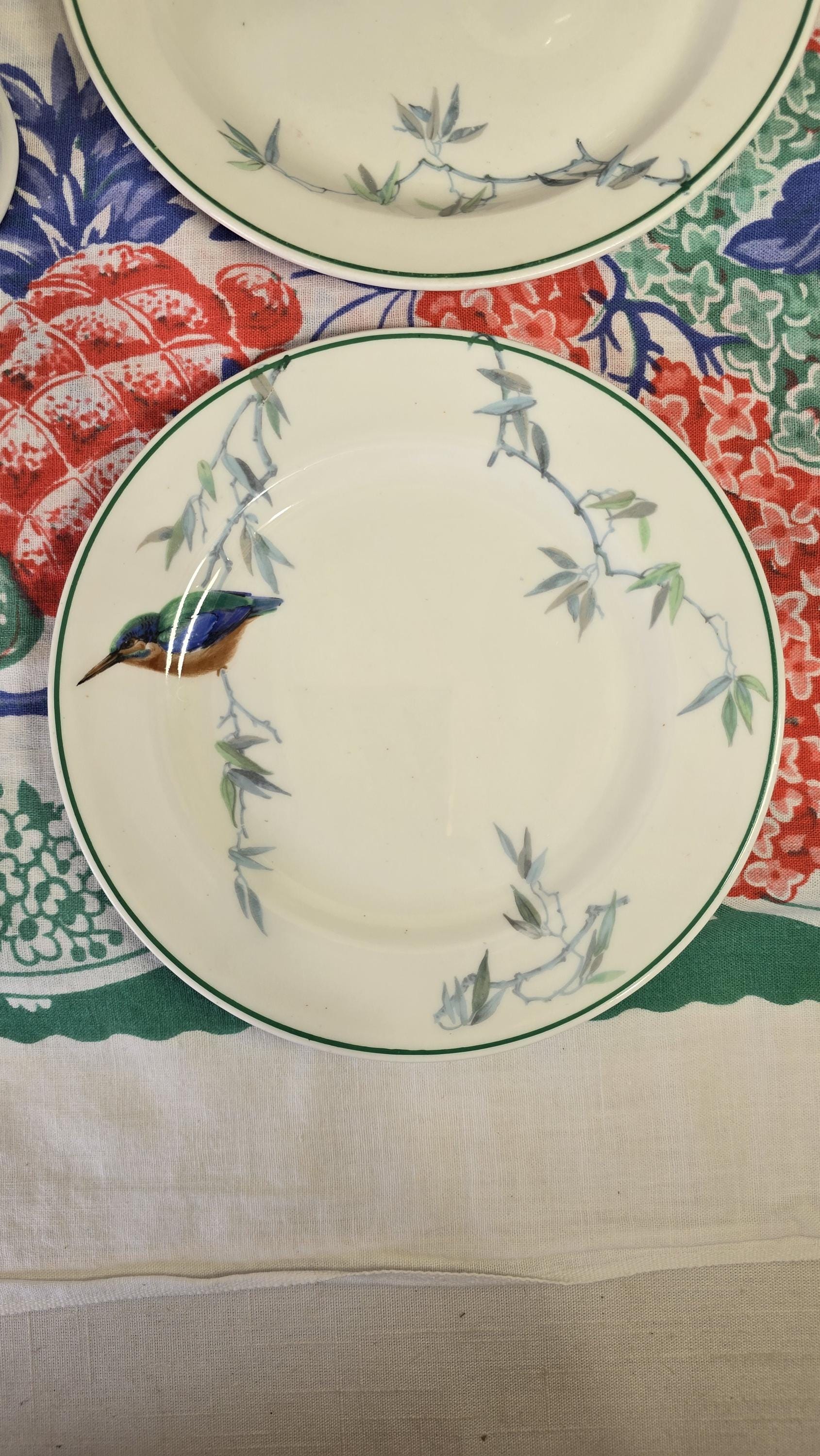 Here is another installment of "Kingfisher" bone china dishes by Royal Doulton. These are verified antique/near antique using the incised dates (some pieces) and the printed Royal Doulton makers marks underglaze. All, of course, feature the beautiful blue and green kingfisher bird perched on twigs of bamboo, edged in grass green - all applied by hand. As a guide, the photo of each individual piece is followed by a photo of the backstamps of that preceding piece. Following the backstamp photo is a photo showing scale - either handheld or using a ruler.