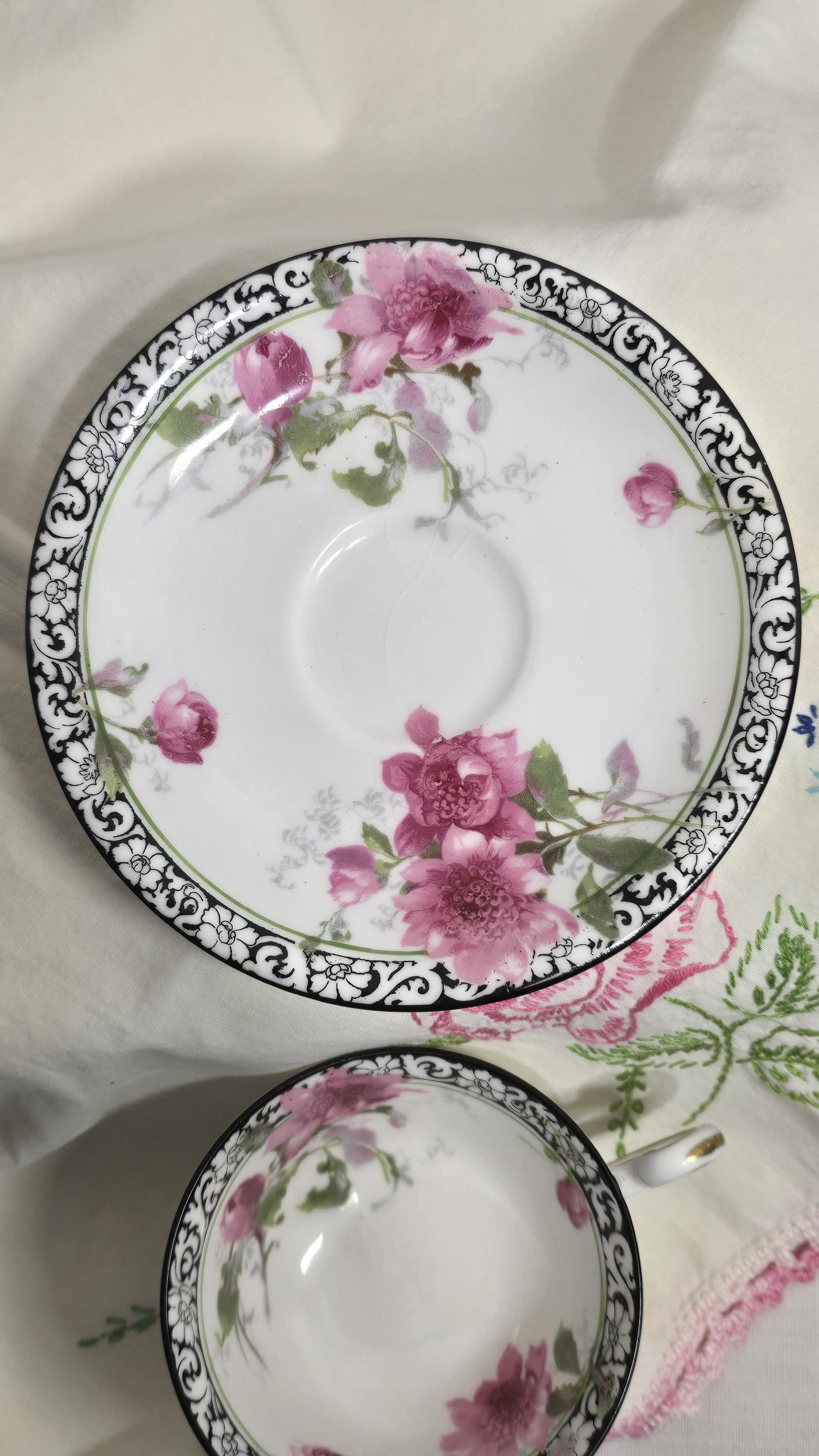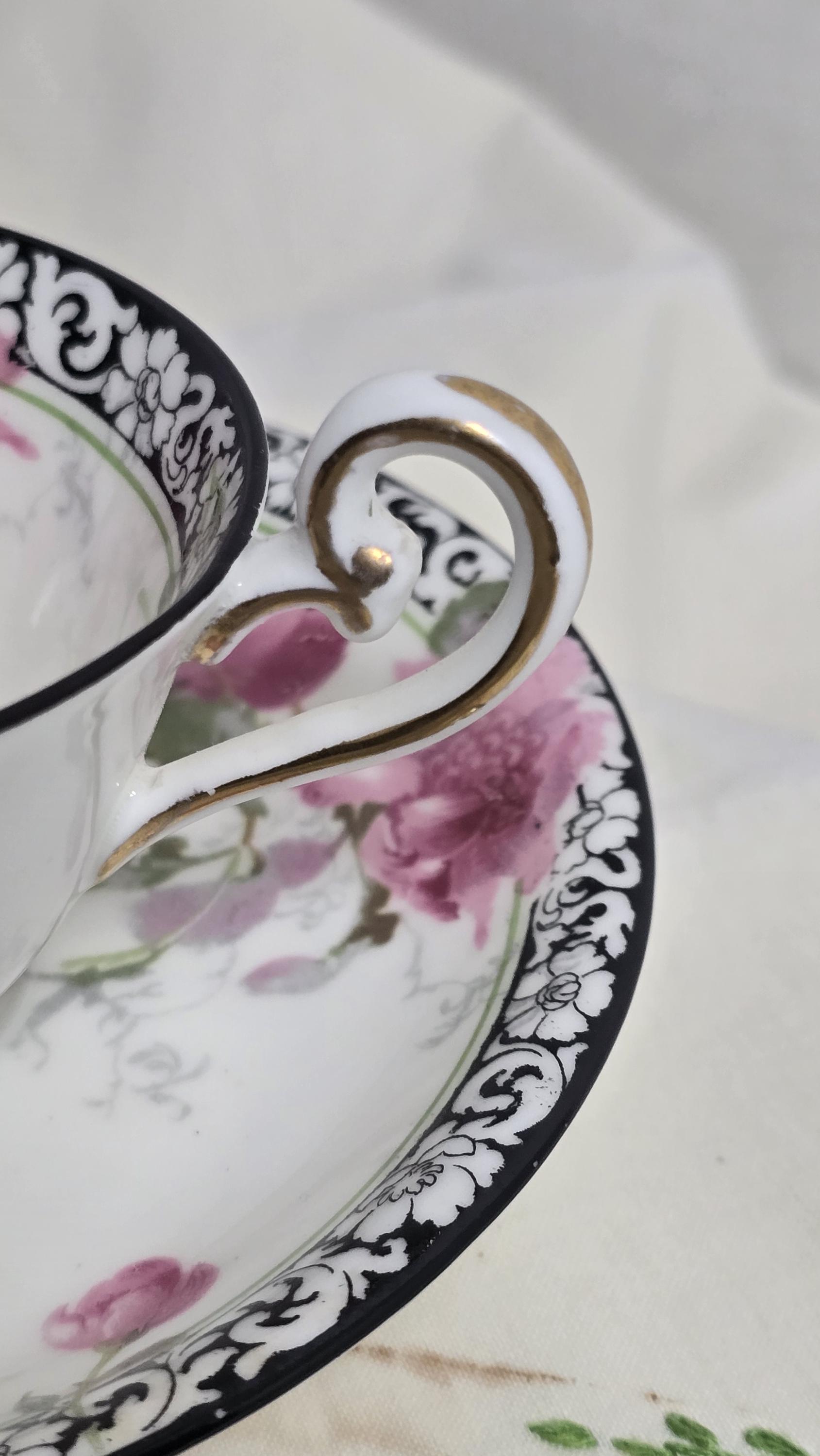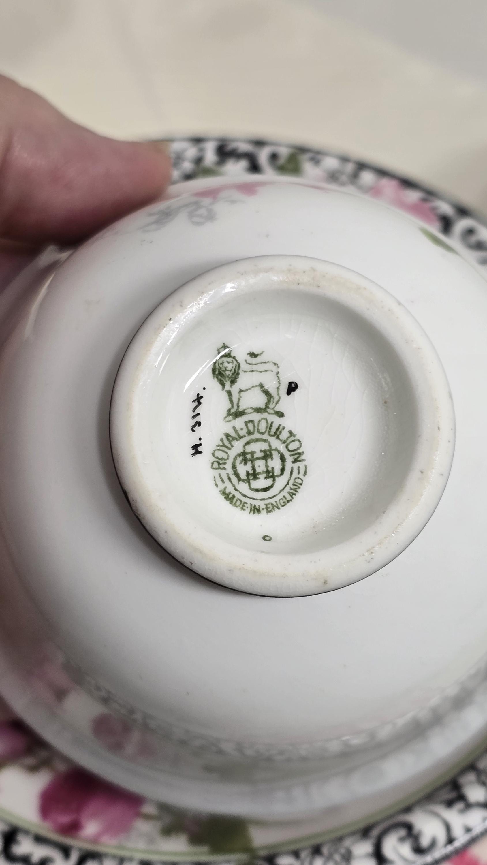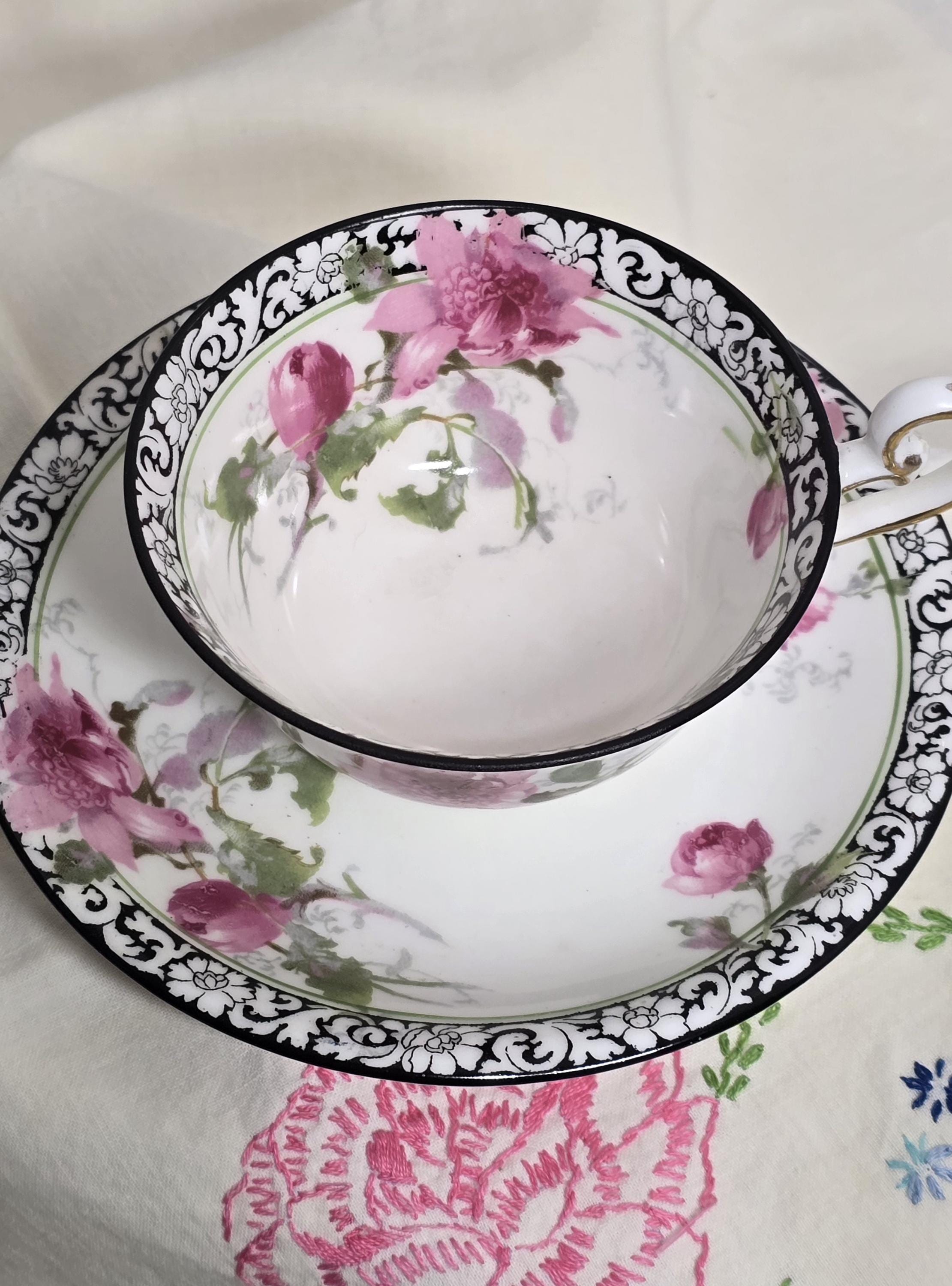 Here is a lovely and striking teacup and saucer set by Royal Doulton. The pattern, #H314, features large pink roses offset by a stark black-and-white scrolled edge design. Plus, there is delicate gold that enhances the cup handle. Markings indicate a manufacture date of April, 1925. (Incised on saucer, "4-25" and printed makers mark used between 1923 and 1927.)