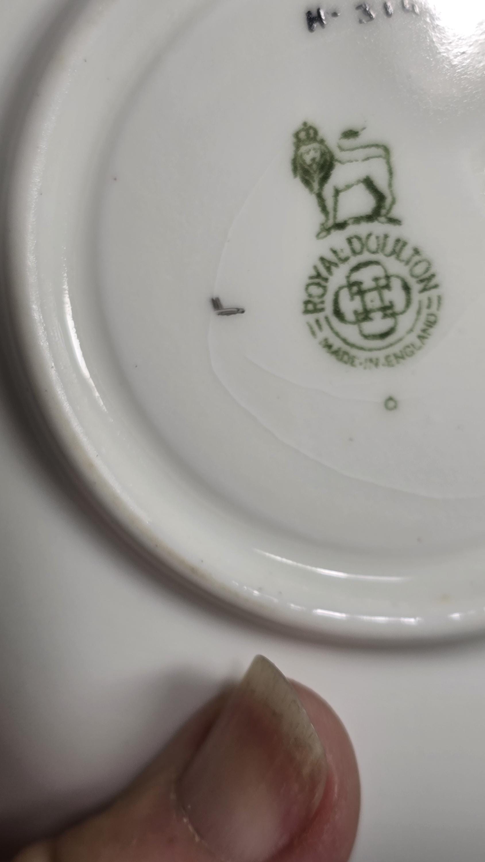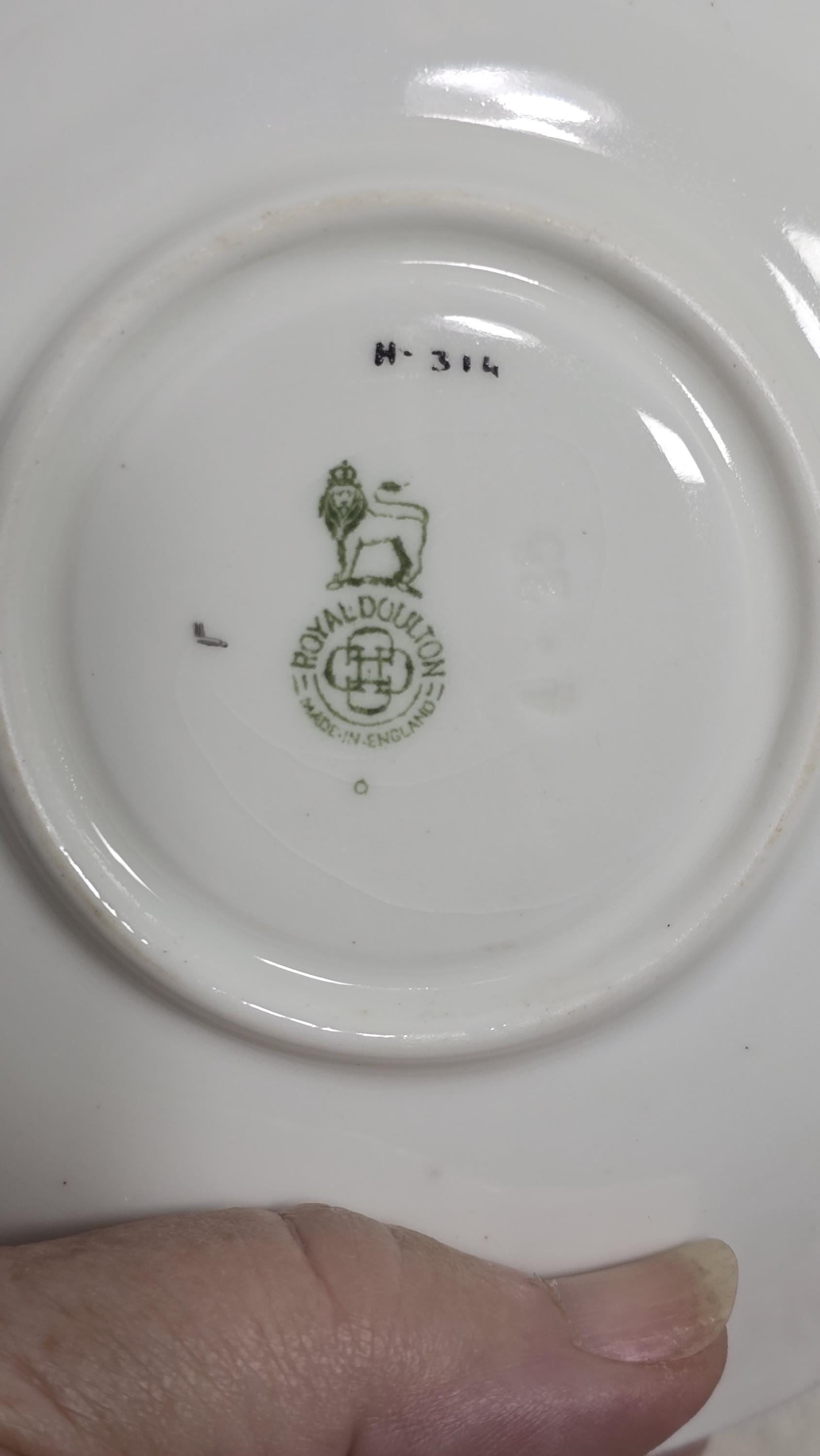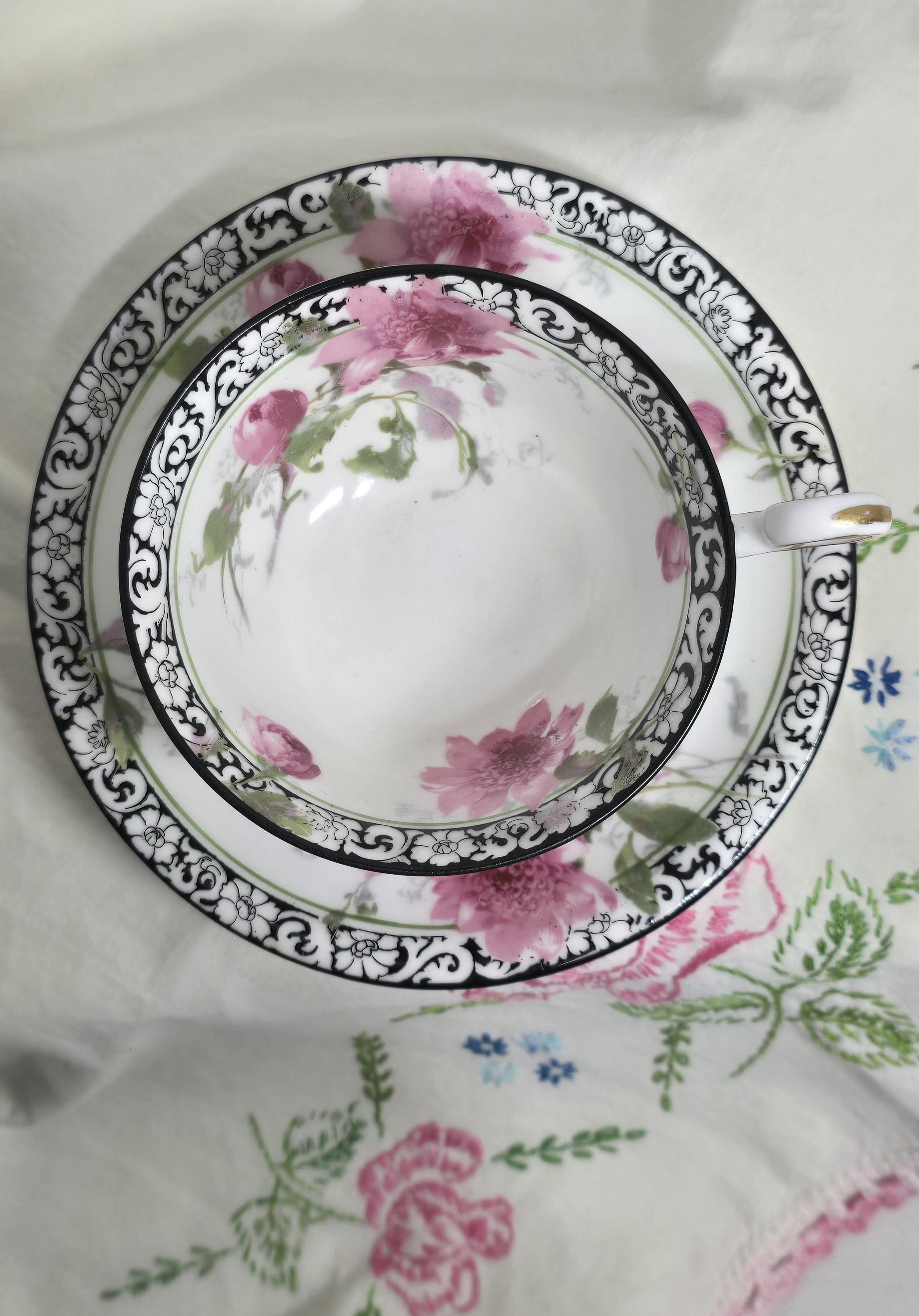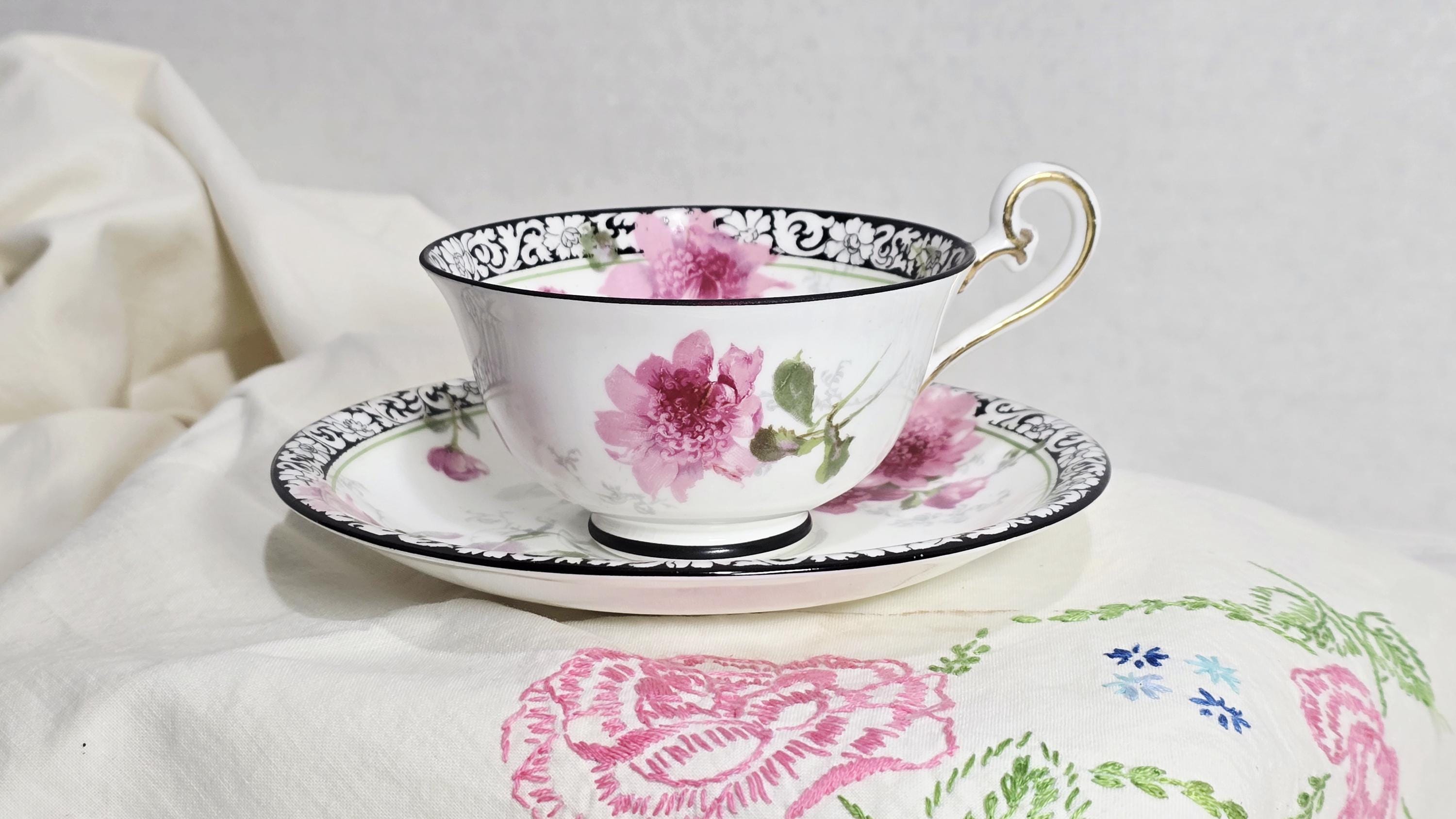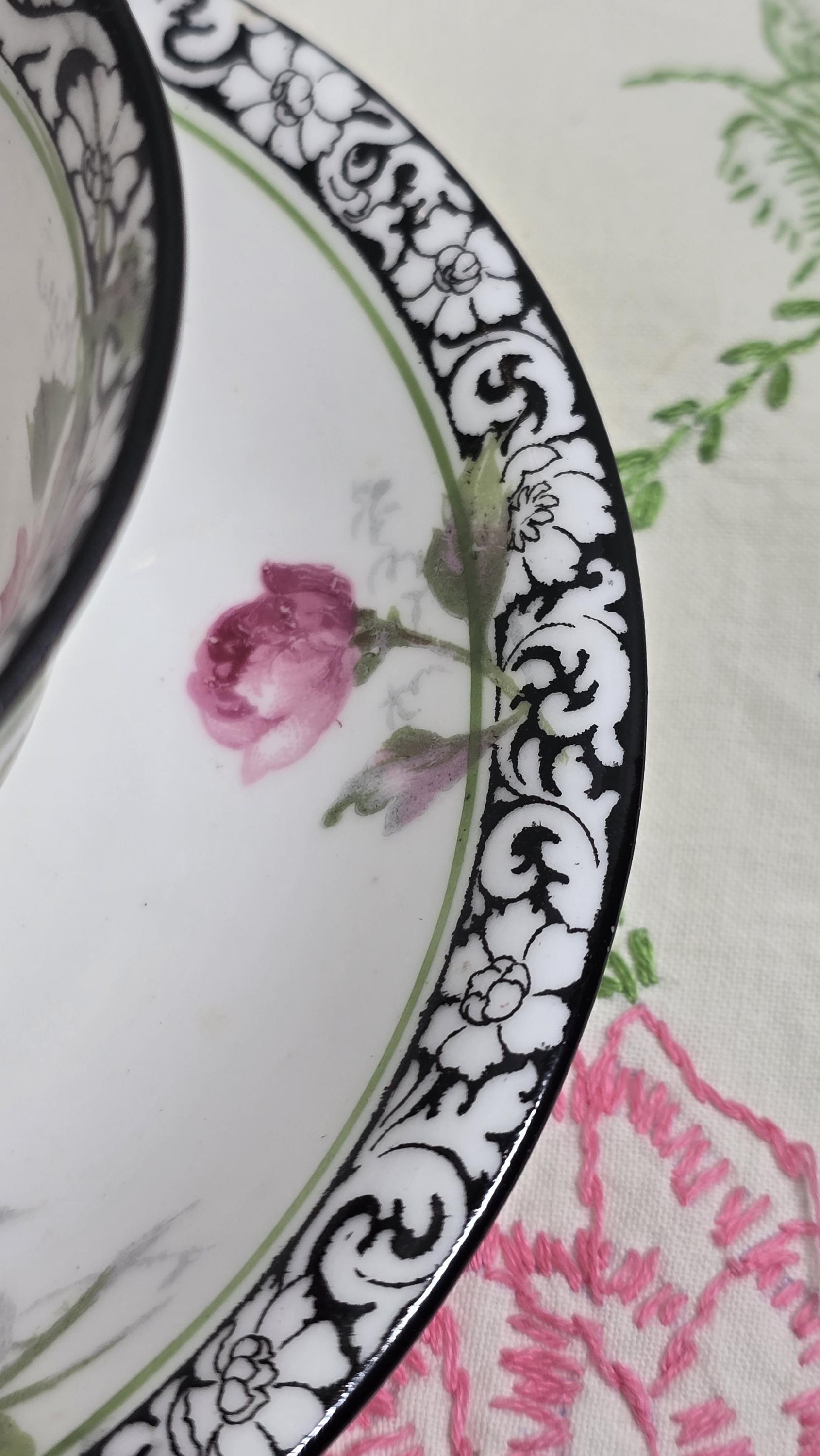 Here is a lovely and striking teacup and saucer set by Royal Doulton. The pattern, #H314, features large pink roses offset by a stark black-and-white scrolled edge design. Plus, there is delicate gold that enhances the cup handle. Markings indicate a manufacture date of April, 1925. (Incised on saucer, "4-25" and printed makers mark used between 1923 and 1927.)