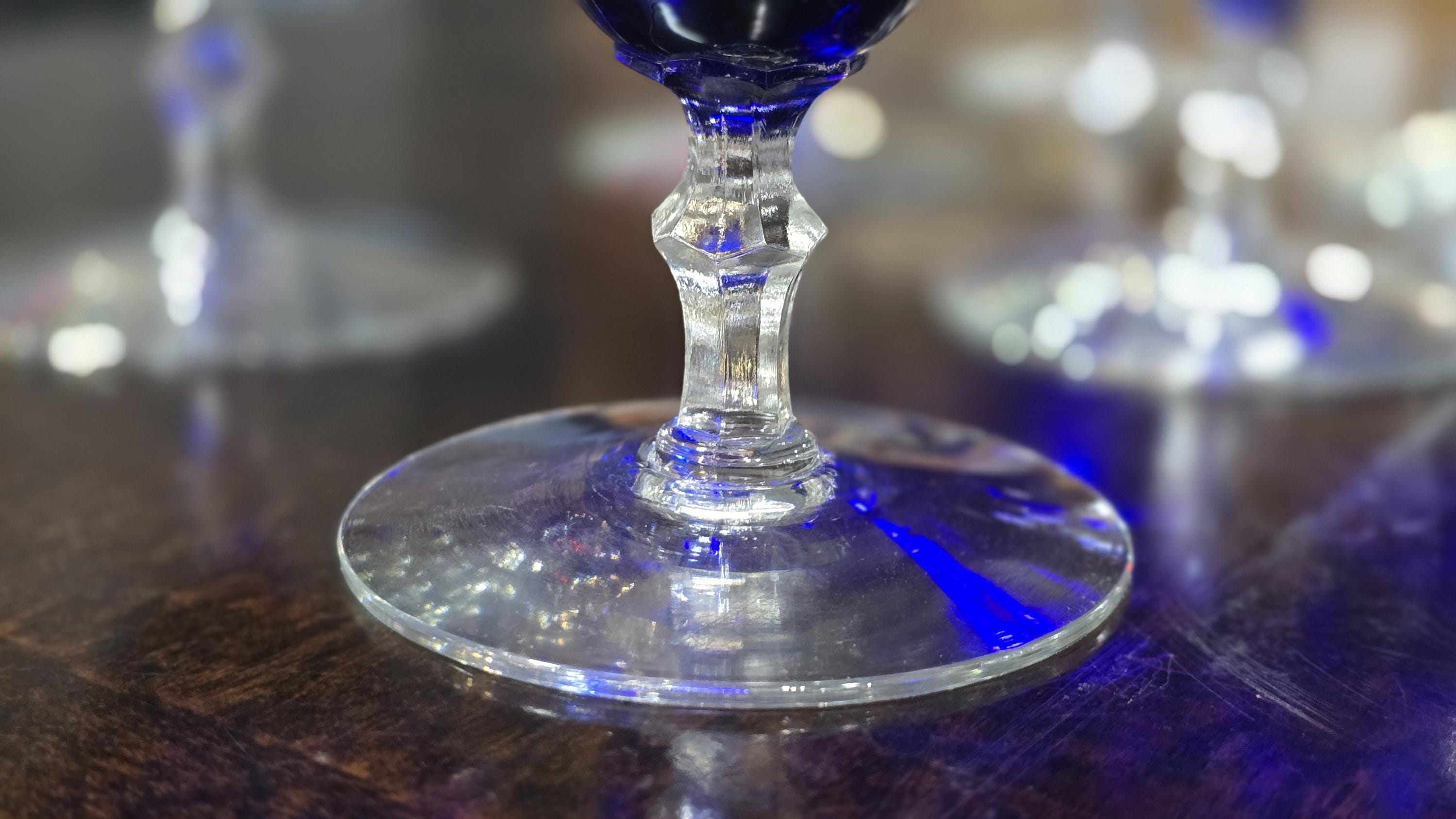 These are the most intense blue I think I've ever seen! True cobalt blue glass, made by the Louie Glassworks, circa 1930s, whose trademark was the vivid blue you see here. Plus, the clear, geometric stems become perfect pedestals to show off the tall blue bowls.