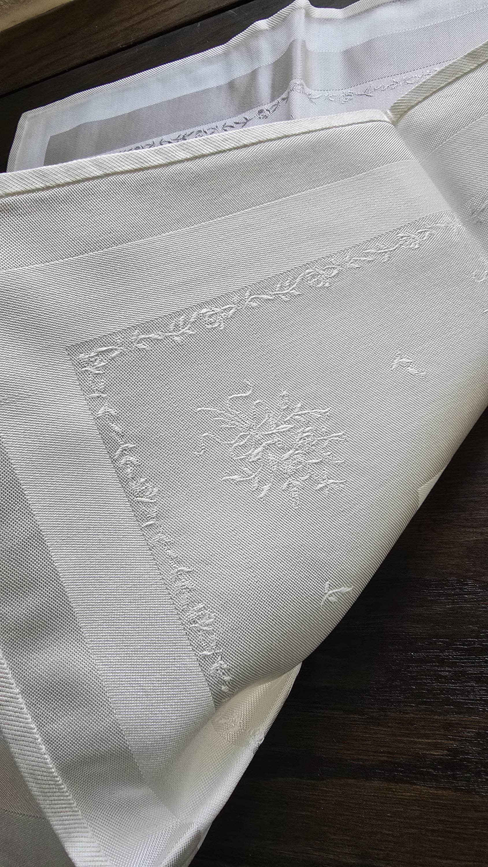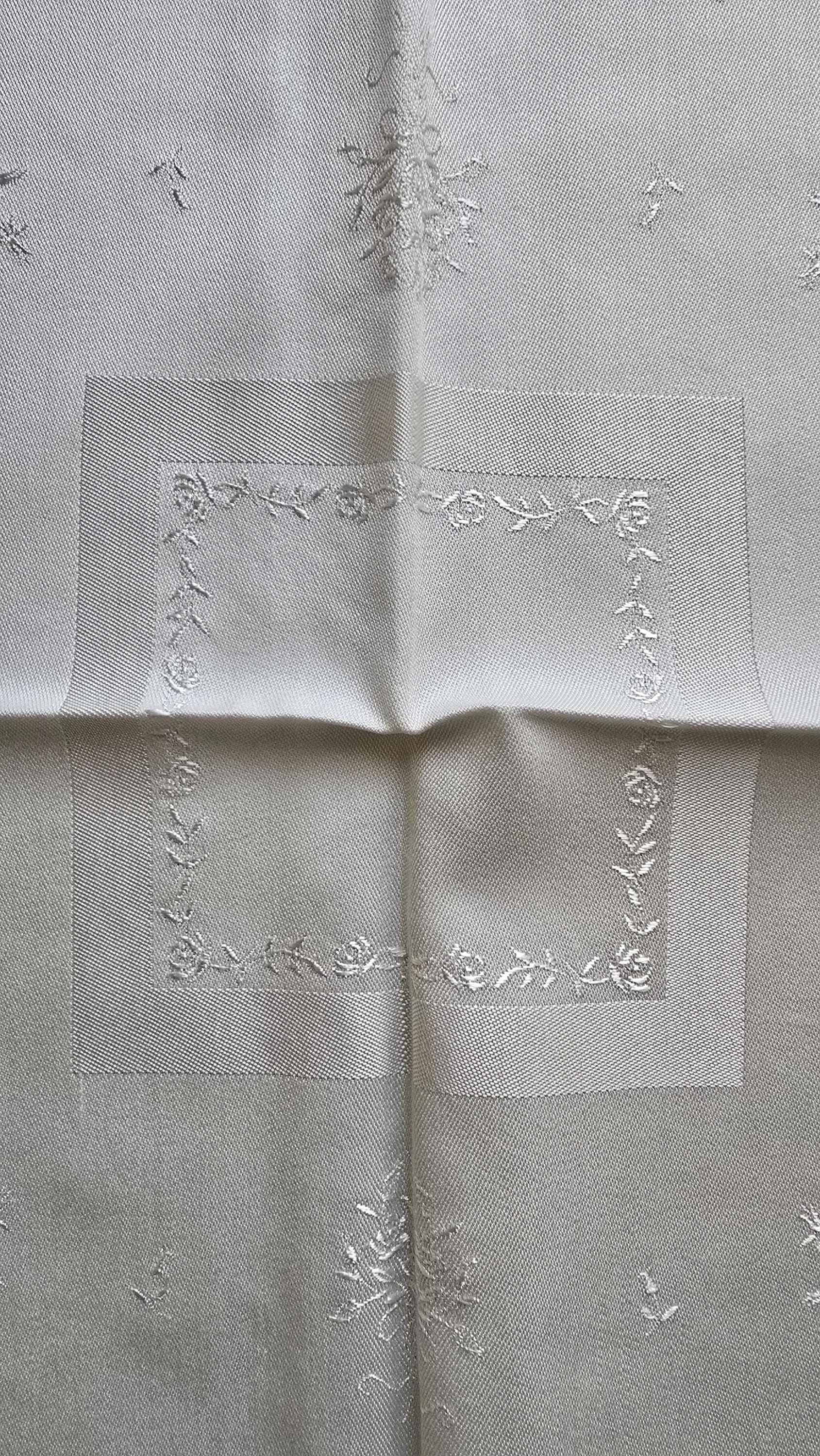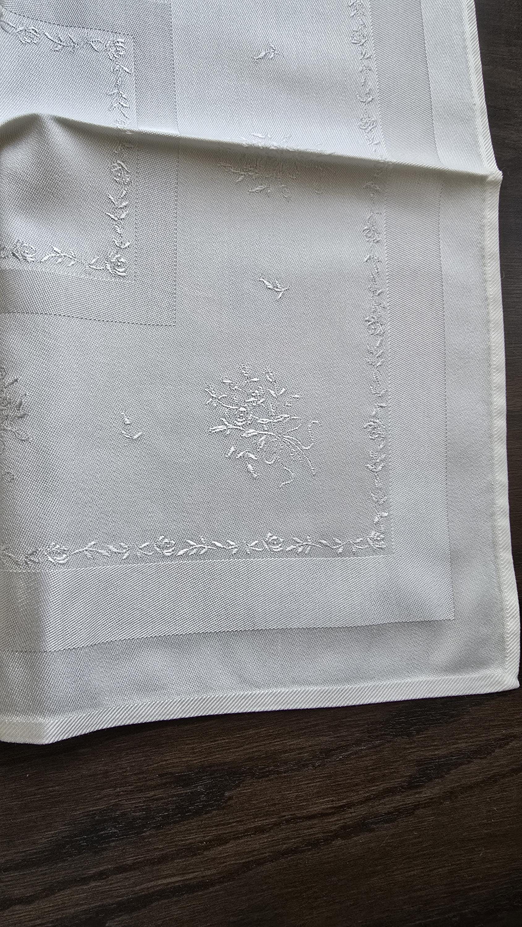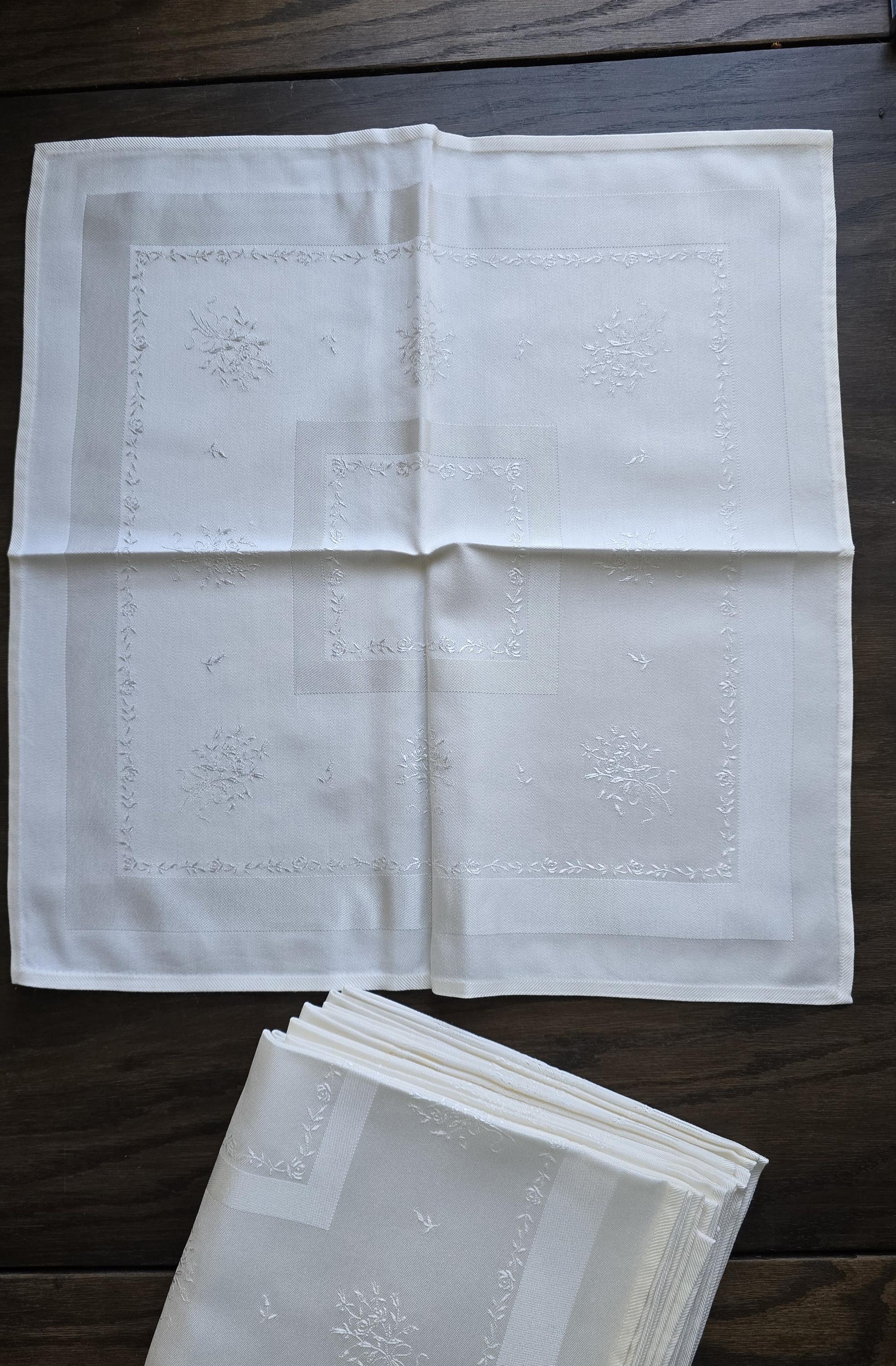 These are just perfect! Other than being out of a package or not having any kind of tag or sticker, I'd say these are brand new. They're made of medium weight cotton damask showing delicate floral sprays around a center square. the color is creamy white.