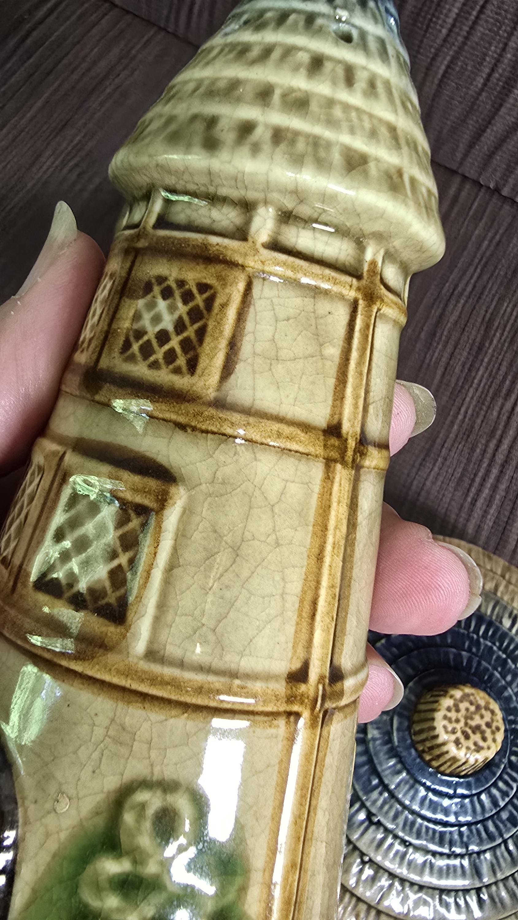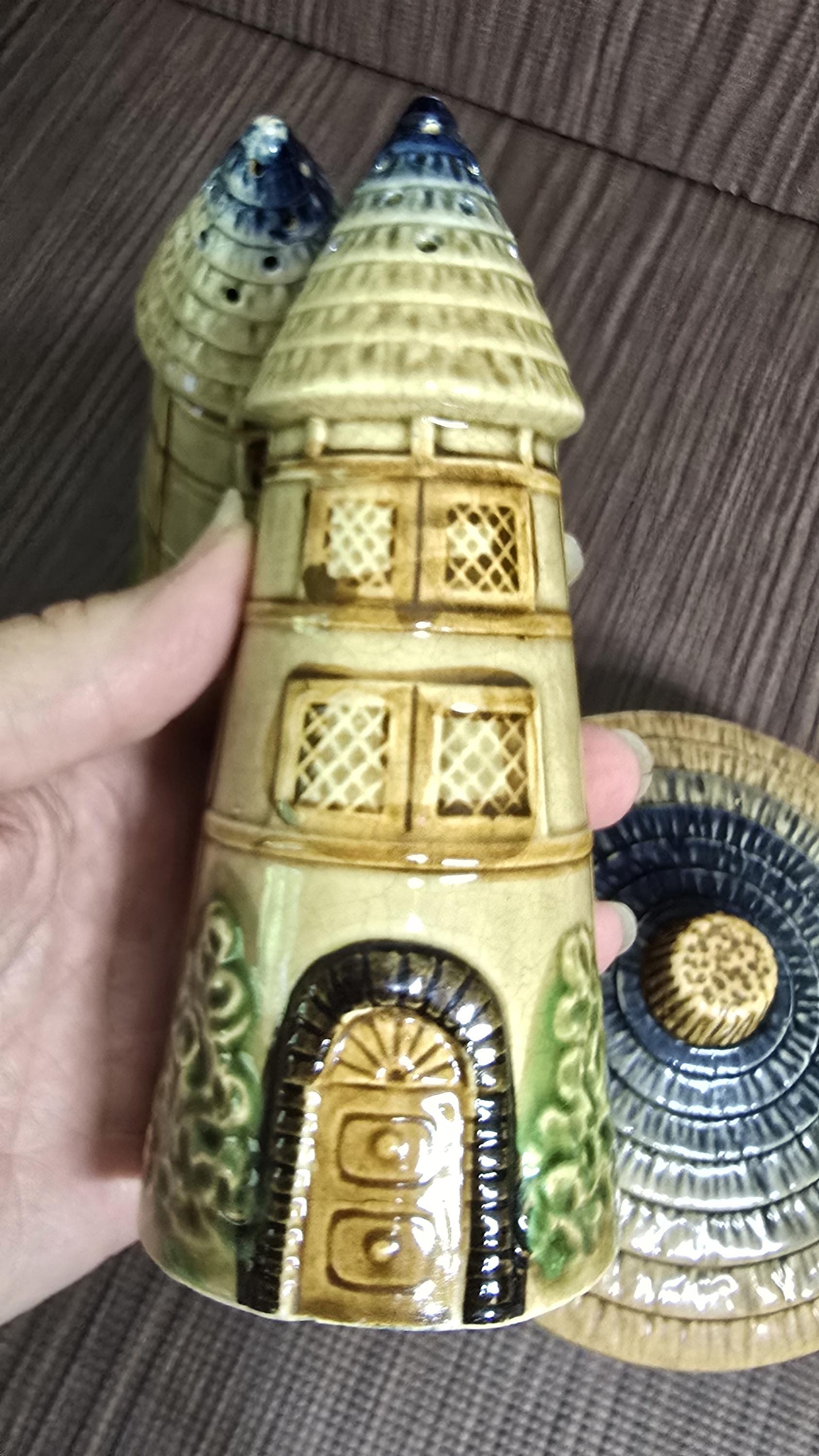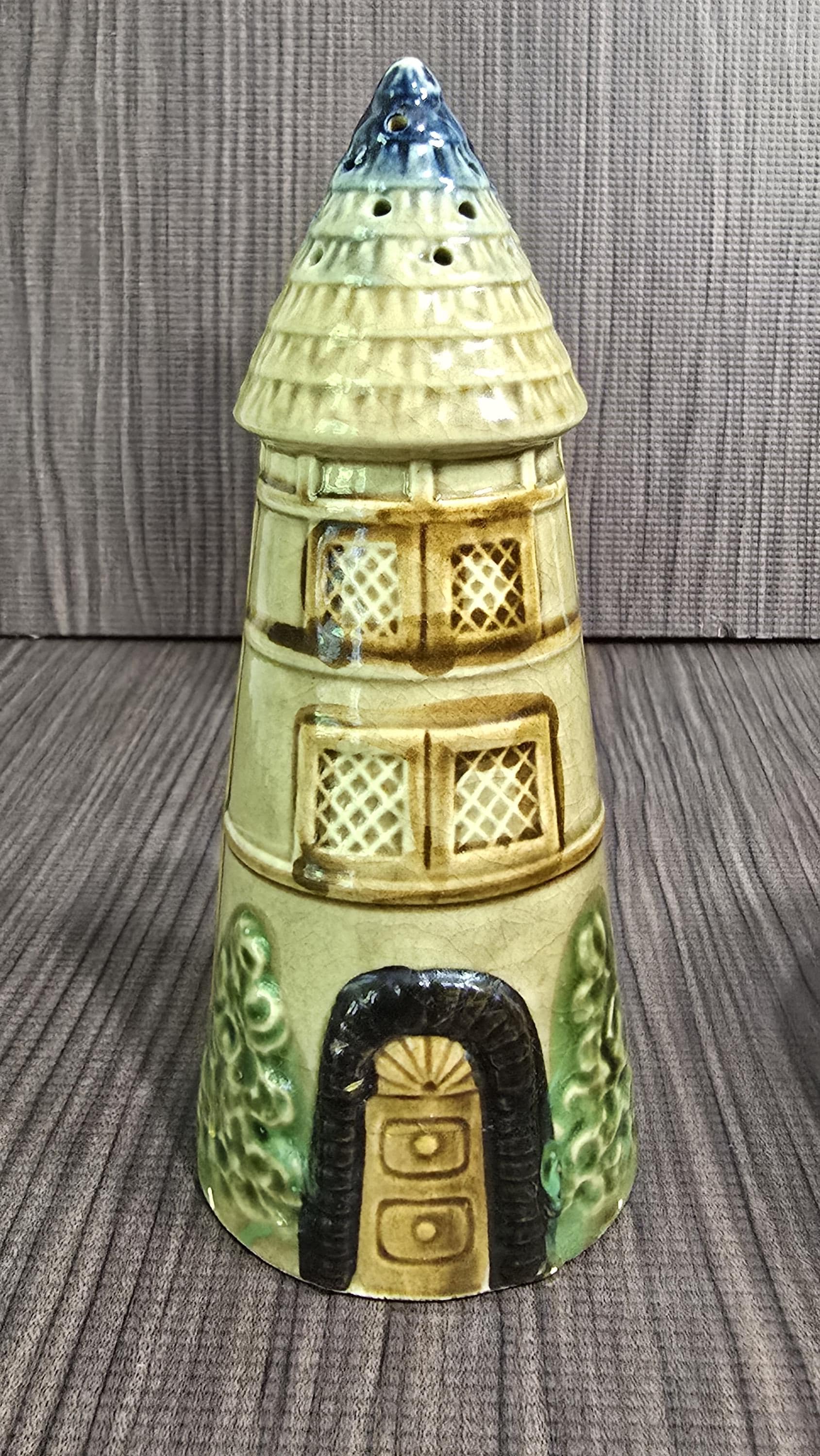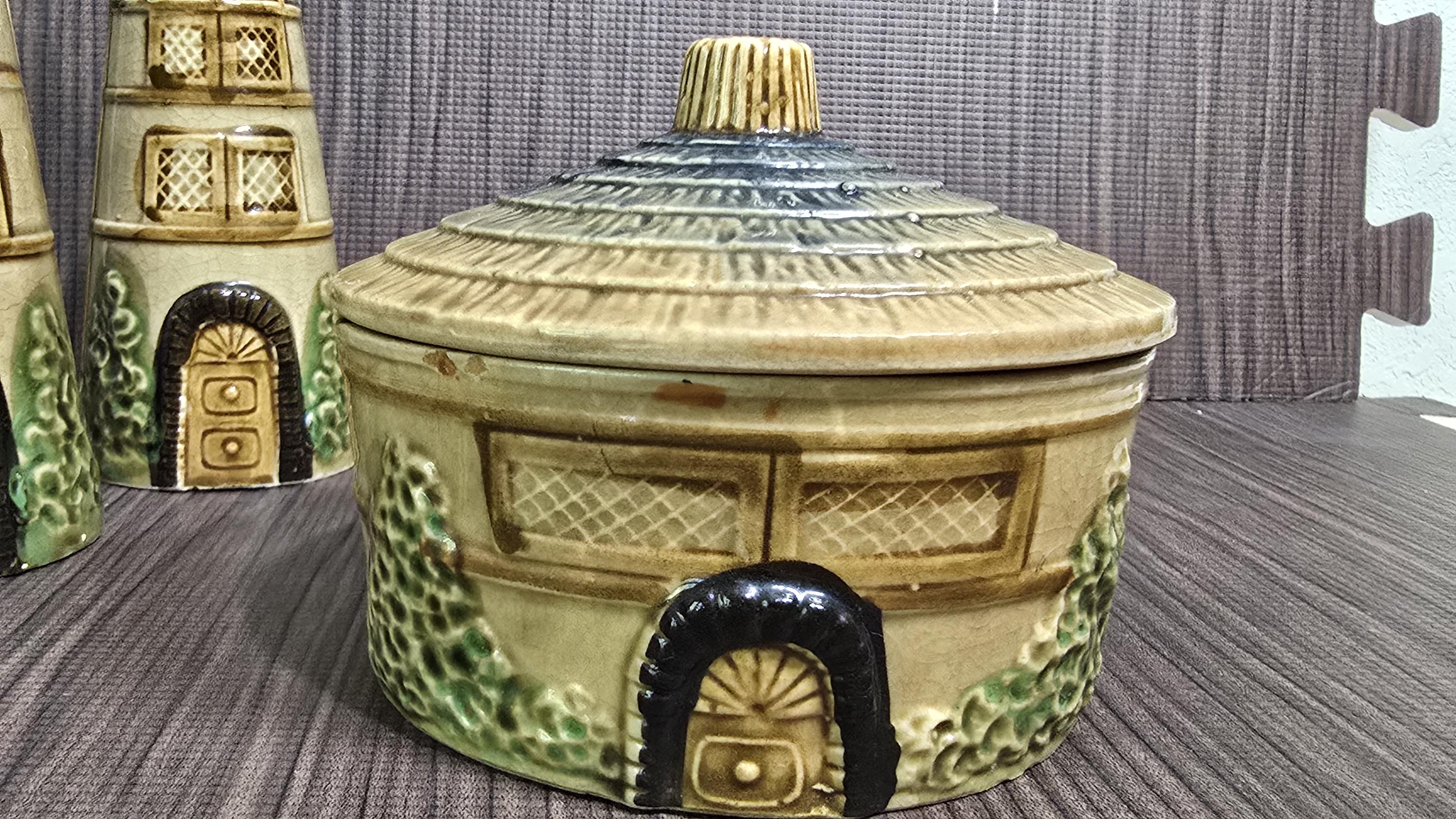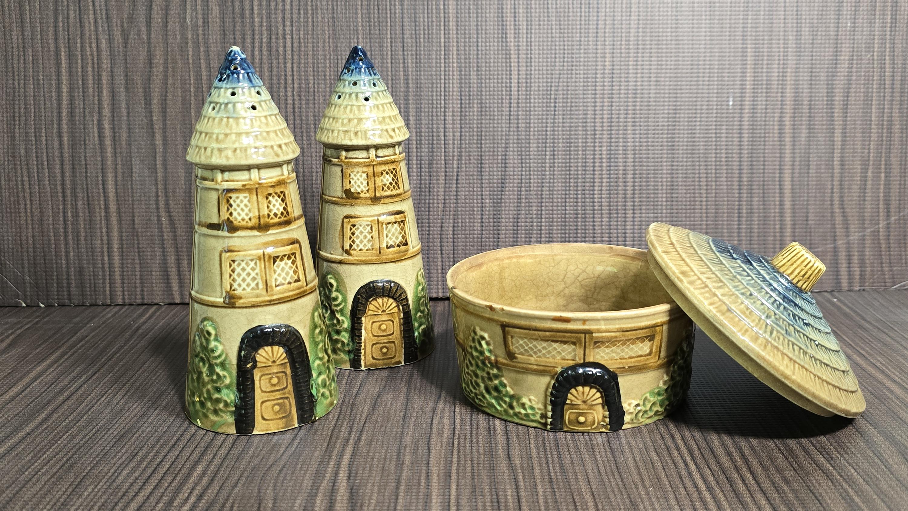 Bring a touch of storybook charm to your kitchen with this 3‑piece Japanese cottageware set, featuring two tall house‑shaped salt & pepper shakers and a matching lidded condiment pot. Each piece is hand‑painted with textured roofs, arched windows, and leafy green details — the whimsical mid‑century style that cottageware collectors adore.