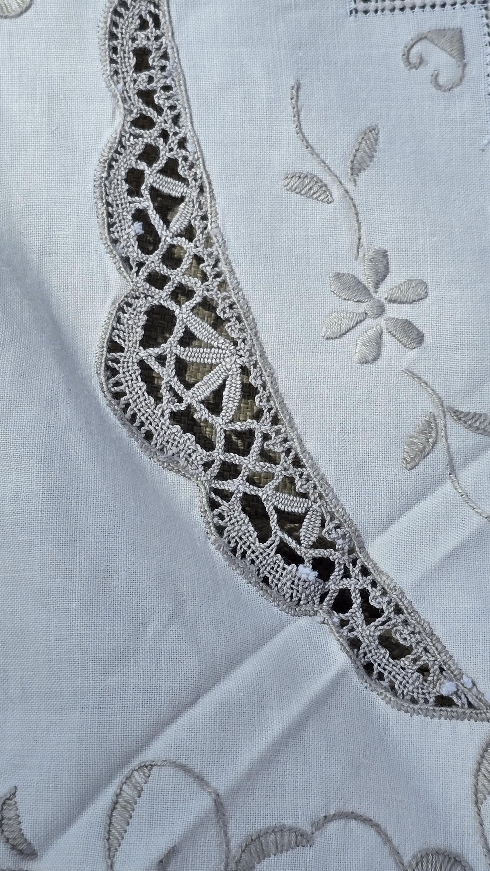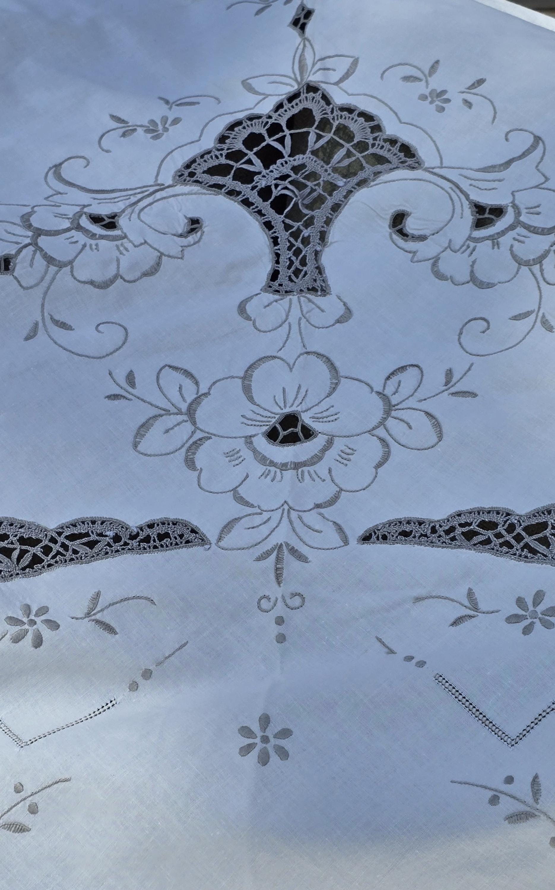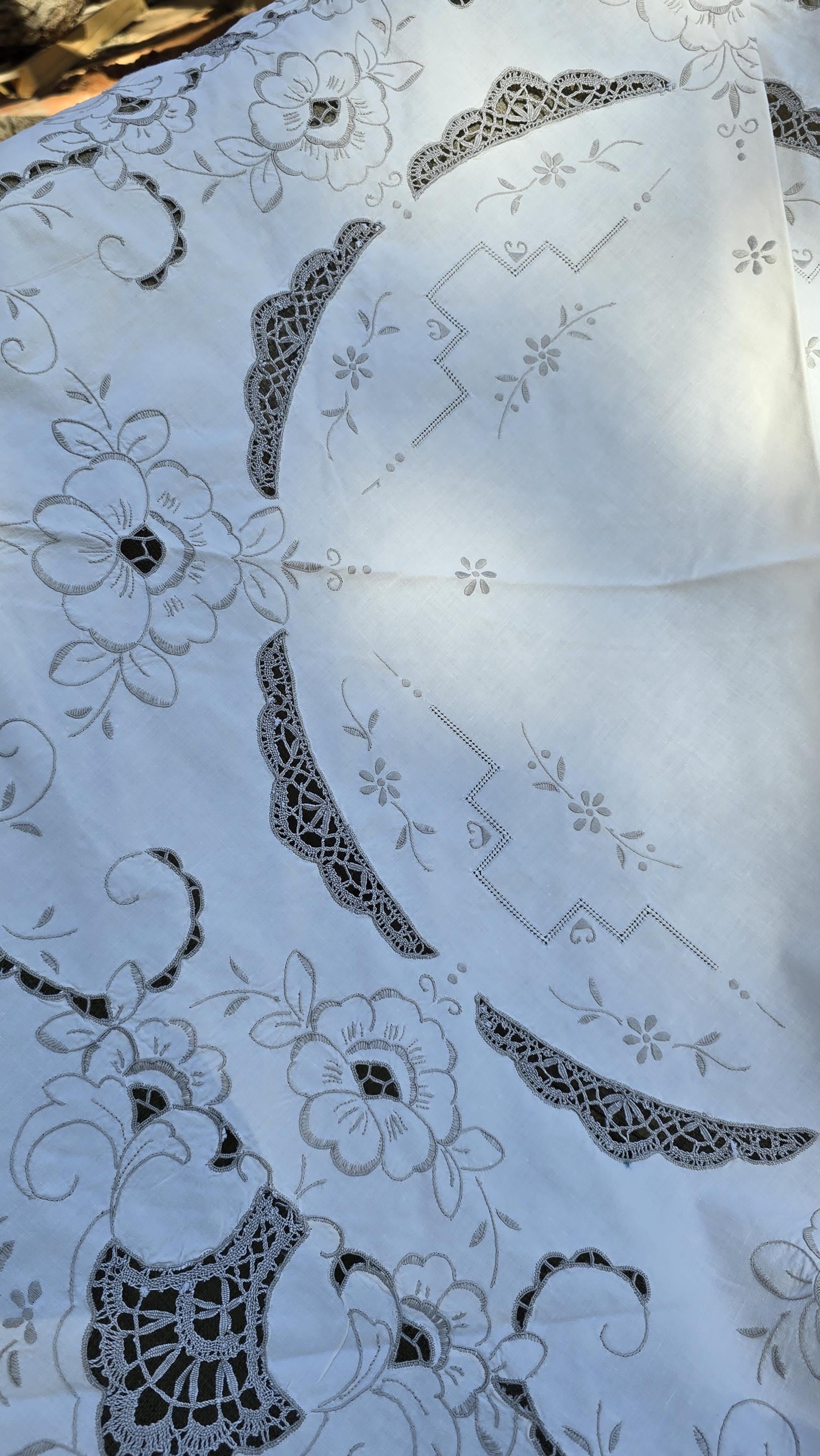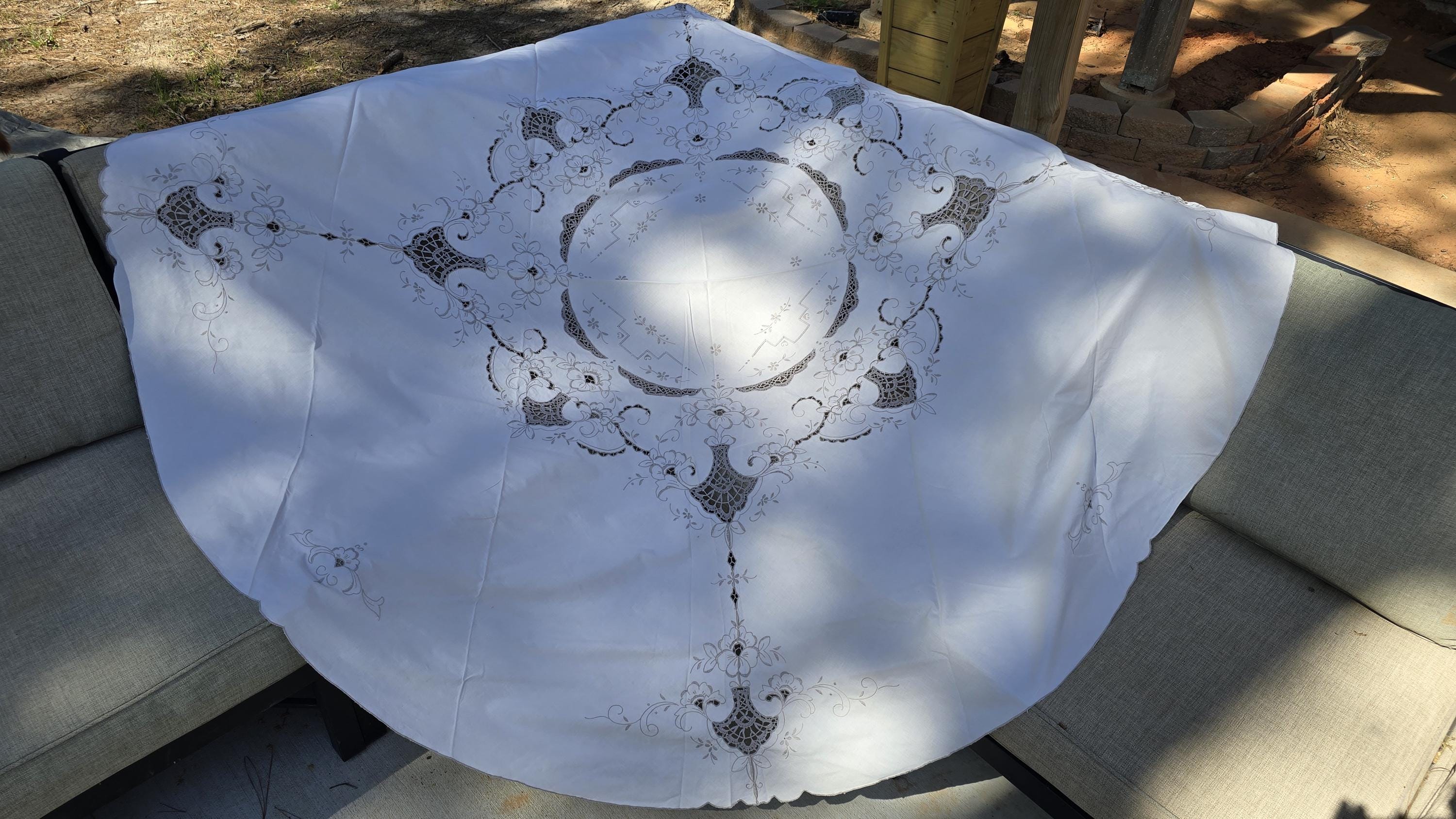 This is a 90-inch round pure linen tablecloth with several styles of embroidery - Richelieu cutwork, satin stitching, buttonhole stitching and more. The linen is mid-weightSo romantic!