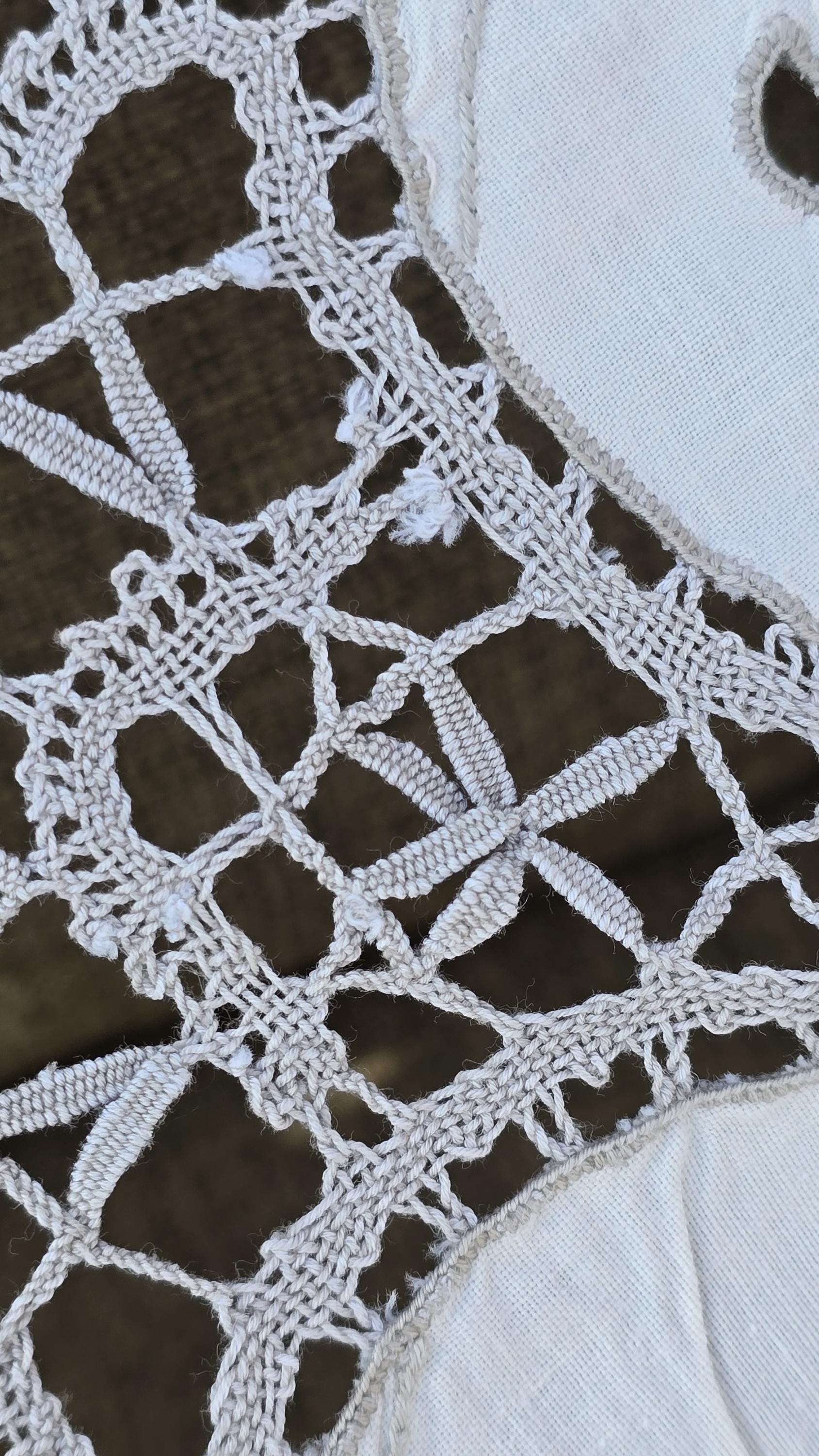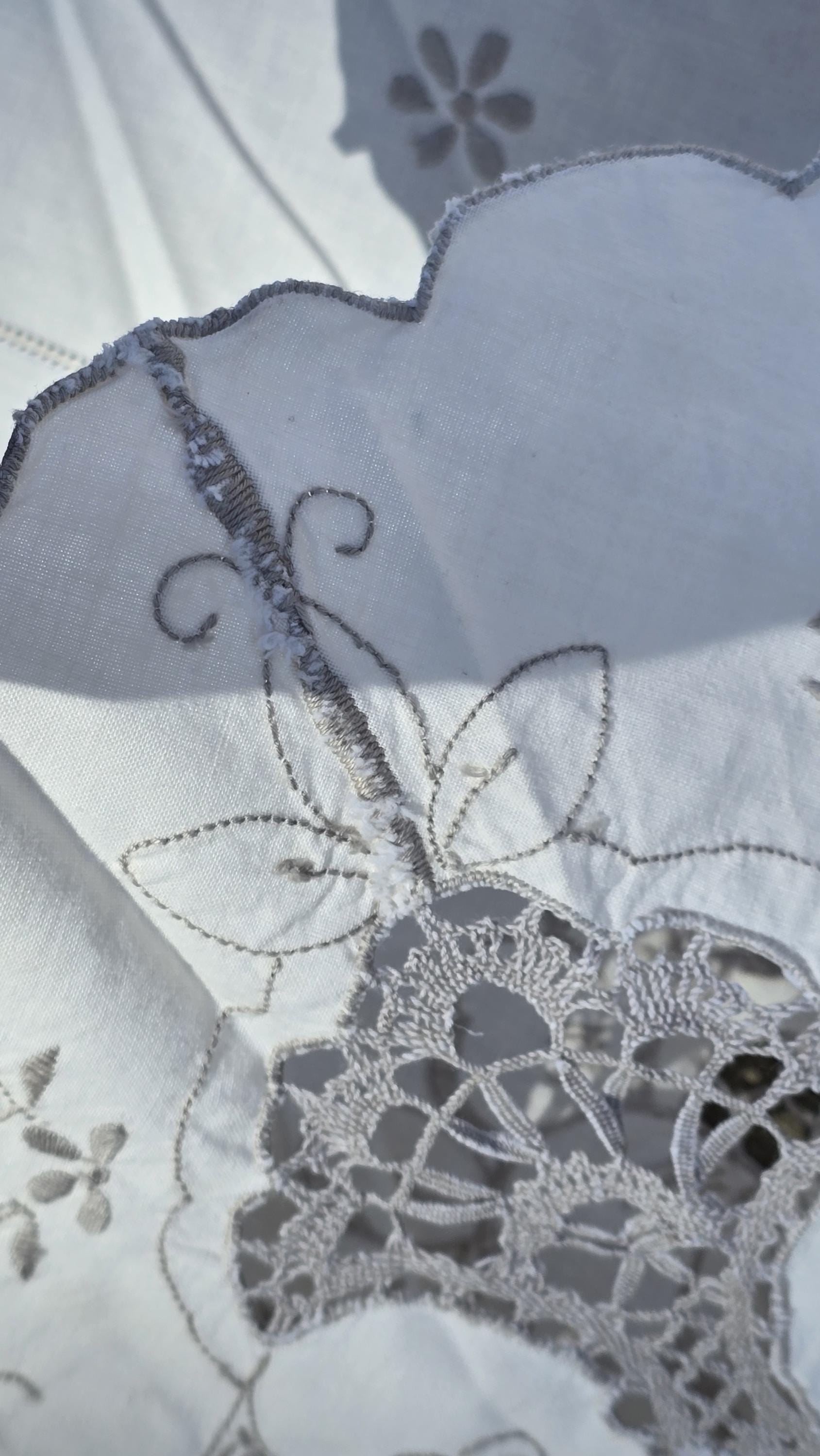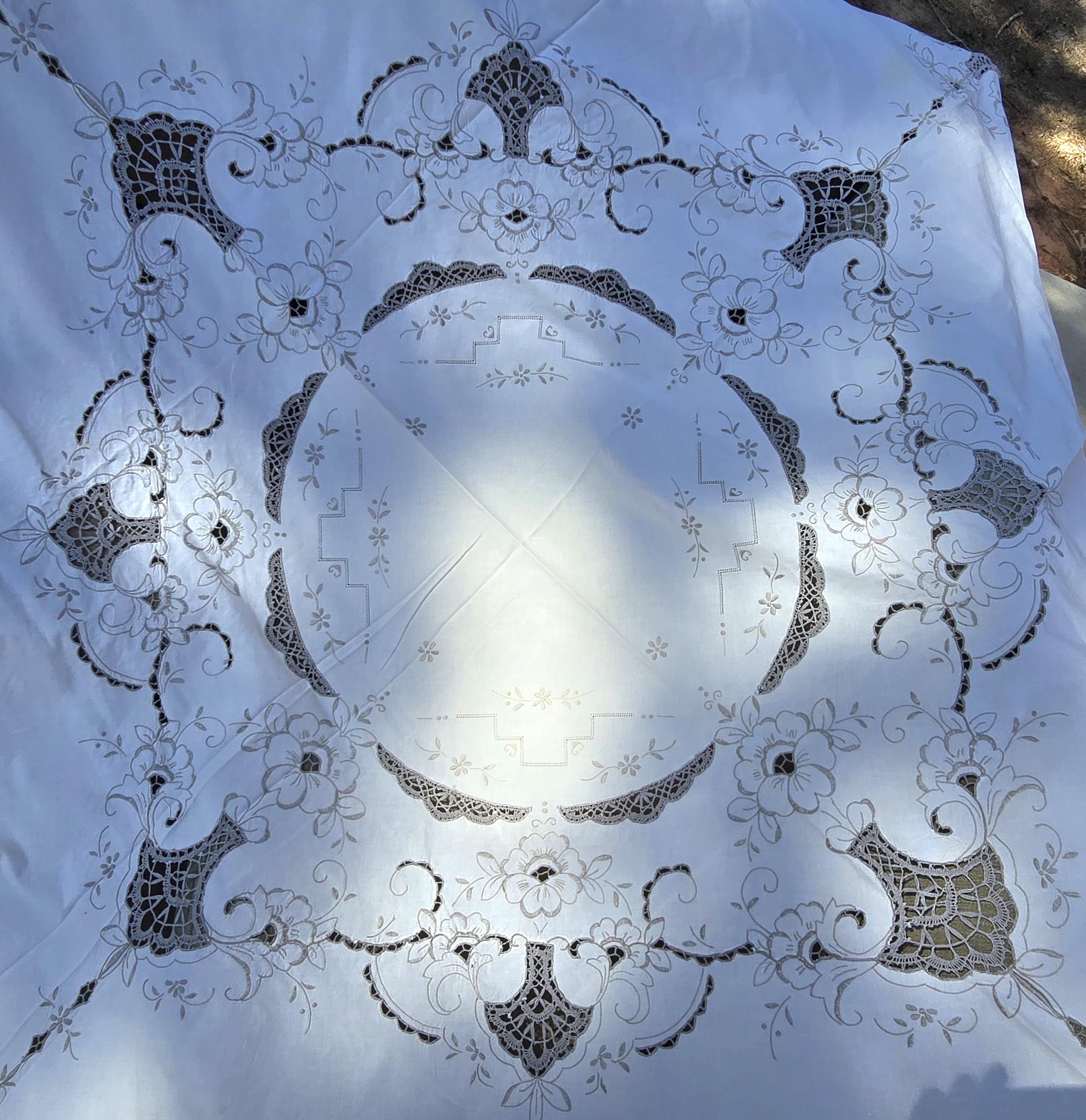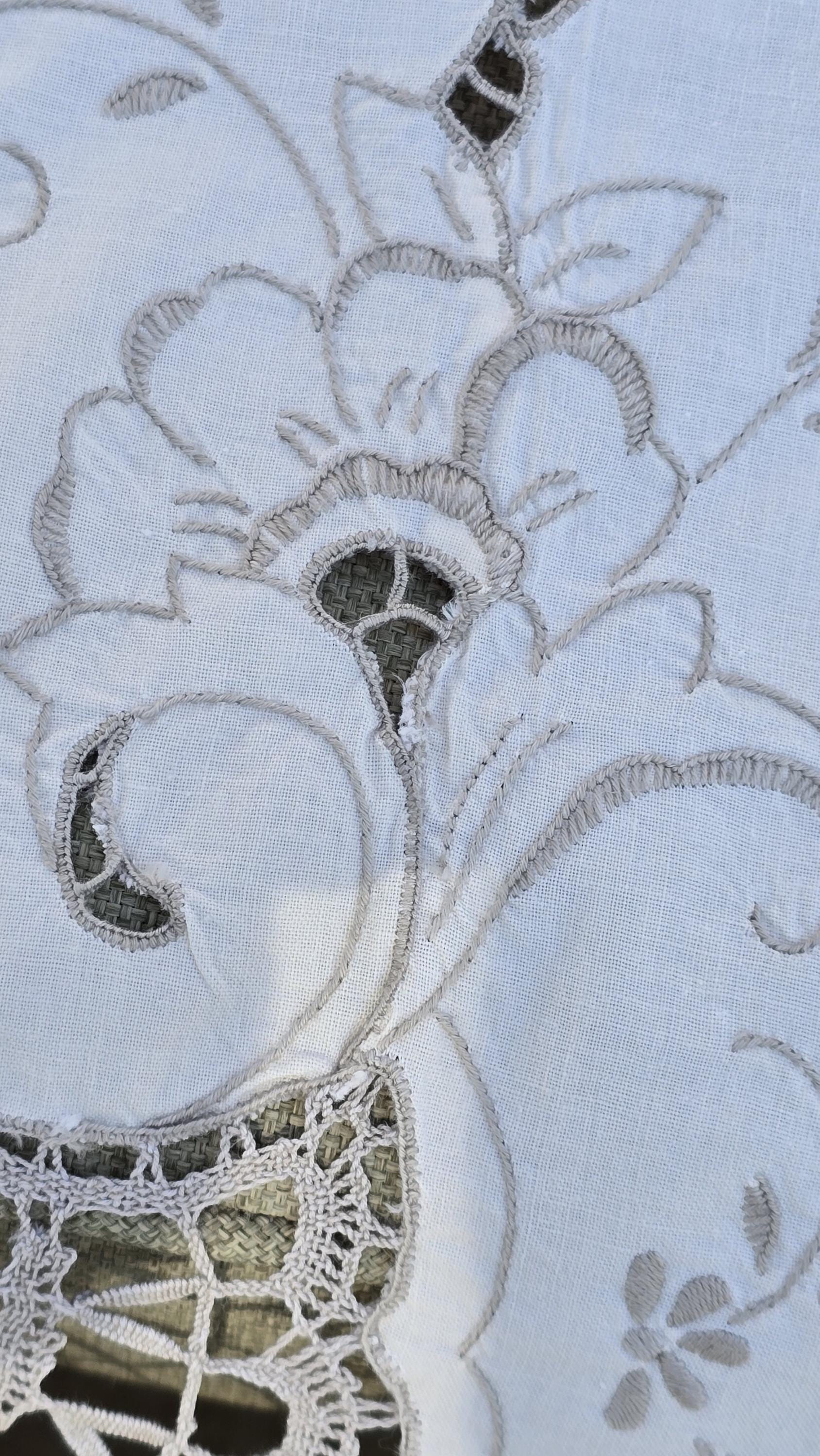 This is a 90-inch round pure linen tablecloth with several styles of embroidery - Richelieu cutwork, satin stitching, buttonhole stitching and more. The linen is mid-weightSo romantic!